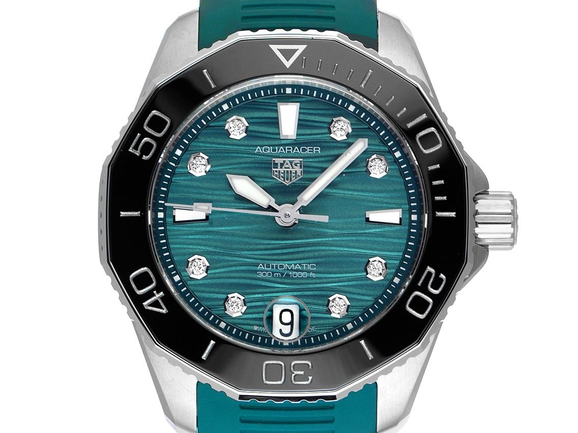 Tag Heuer Aquaracer Professional 300 Date Stahl Keramik Diamanten Automatik Armband Kautschuk FaltschließeGehäuse Edelstahl poliert und satiniert, Gehäusedurchmesser ohne Krone 36mm, Gehäusehöhe 12,1mm. Lünette Edelstahl mit schwarzem Keramik Inlay und 60-Minuten Skala, einseitig drehbar. Armband Kautschuk blaugrün, Anstoßbreite 17mm, Sicherheitsfaltschließe Edelstahl mit Hersteller-Logo. Zifferblatt grün mit Wellenmuster und 8 aufgesetzten Diamantindexen, zusammen ca. 0,078ct TW / VSI (feines Weiß mit sehr kleinen Einschlüssen) und polierten Edelstahl Leuchtzeigern. Uhrwerk Automatik, Tag Heuer Calibre 5, Gangreserve ca. 38 Stunden. Anzeige von Stunde, Minute und Sekunde über Zeiger aus der Mitte mit Sekundenstopp zur sekundengenauen Einstellung der Uhrzeit, Datumsanzeige mit Schnellverstellung bei 6 Uhr. Saphirglas kratzfest. Krone verschraubbar mit Flankenschutz und Hersteller-Logo. Boden Edelstahl verschraubt und graviert. Gewicht der Uhr inklusive Armband 100g. Wasserdicht bis 30 ATM. Referenznummer: WBP231G.FT6226, ID: ST610247401225RE-3950, Artikelnummer: 10000083719. Original Tag Heuer Box mit Umkarton und Garantie Papiere von 2025, Full Set. Ungetragen. Lieferzeit sofort.