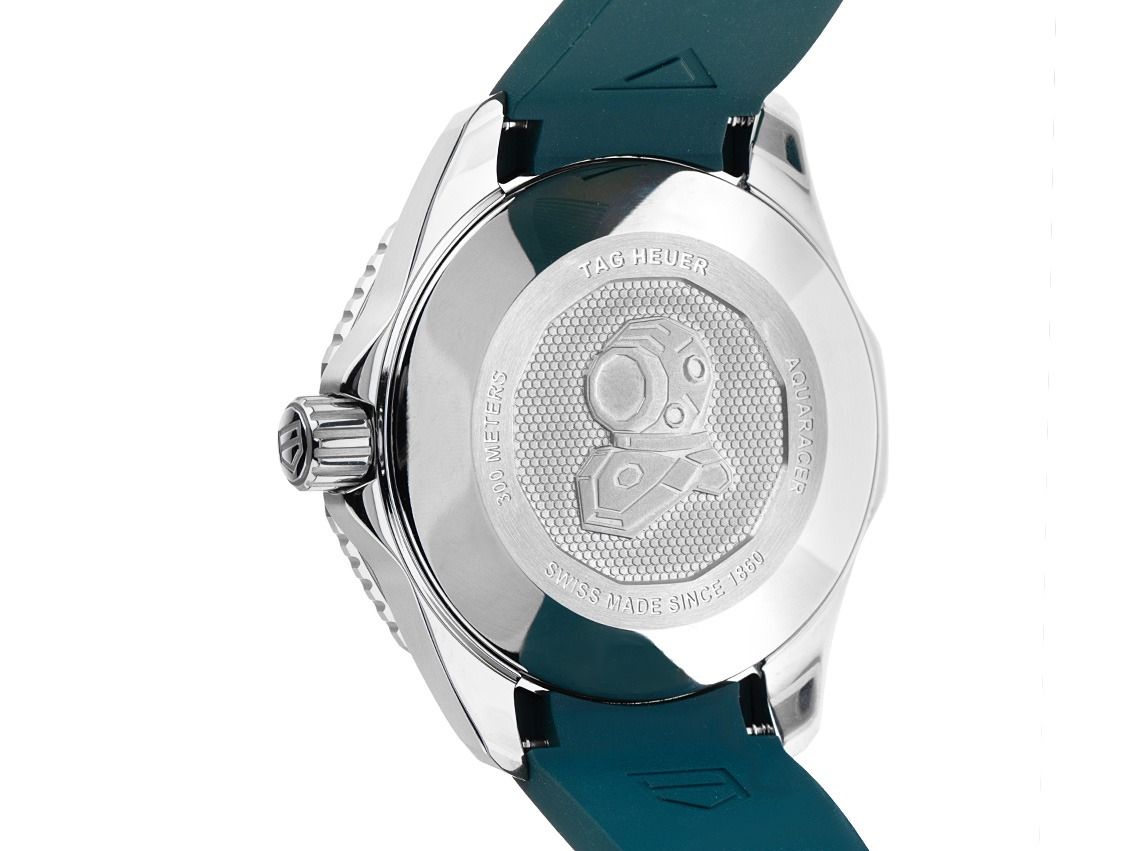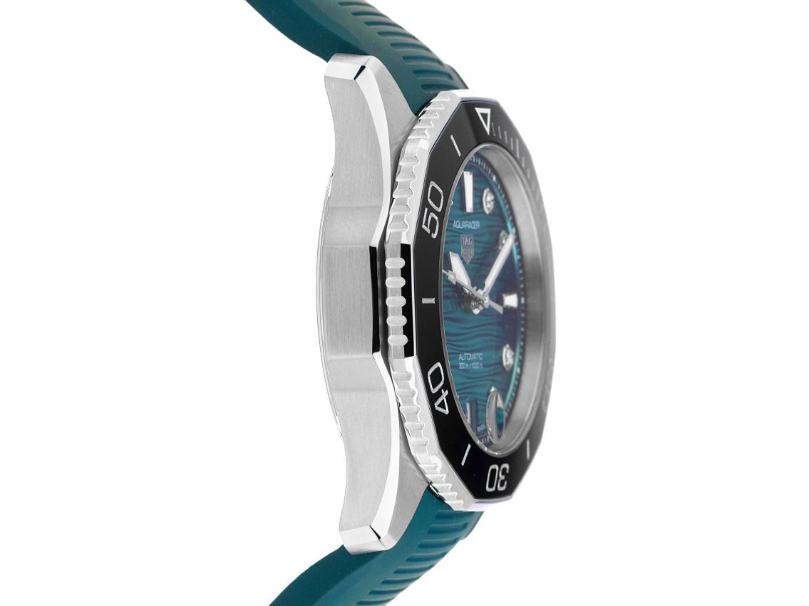 Caja de acero inoxidable pulido y satinado, diámetro de la caja sin corona 36mm, altura de la caja 12,1mm. Bezel de acero inoxidable con inserto de cerámica negra y escala de 60 minutos, unidireccional. Correa de caucho azul verdoso, ancho de asas 17mm, cierre de seguridad desplegable de acero inoxidable con logo del fabricante. Esfera verde con patrón de olas y 8 índices de diamante aplicados, en total aproximadamente 0,078ct TW / VSI (blanco fino con inclusiones muy pequeñas) y agujas pulidas de acero inoxidable luminosas. Movimiento automático, Tag Heuer Calibre 5, reserva de marcha de aproximadamente 38 horas. Indicación de hora, minuto y segundo a través de agujas centrales con parada de segundero para un ajuste preciso de la hora, visualización de la fecha con ajuste rápido a las 6 en punto. Cristal de zafiro resistente a los arañazos. Corona atornillada con protección lateral y logo del fabricante. Fondo de acero inoxidable atornillado y grabado. Peso del reloj incluyendo la correa 100g. Resistente al agua hasta 30 ATM. Número de referencia: WBP231G.FT6226, ID: ST610247401225RE-3950, número de artículo: 10000083719. Caja original de Tag Heuer con caja exterior y documentos de garantía de 2025, Full Set. Sin usar. Tiempo de entrega inmediato.