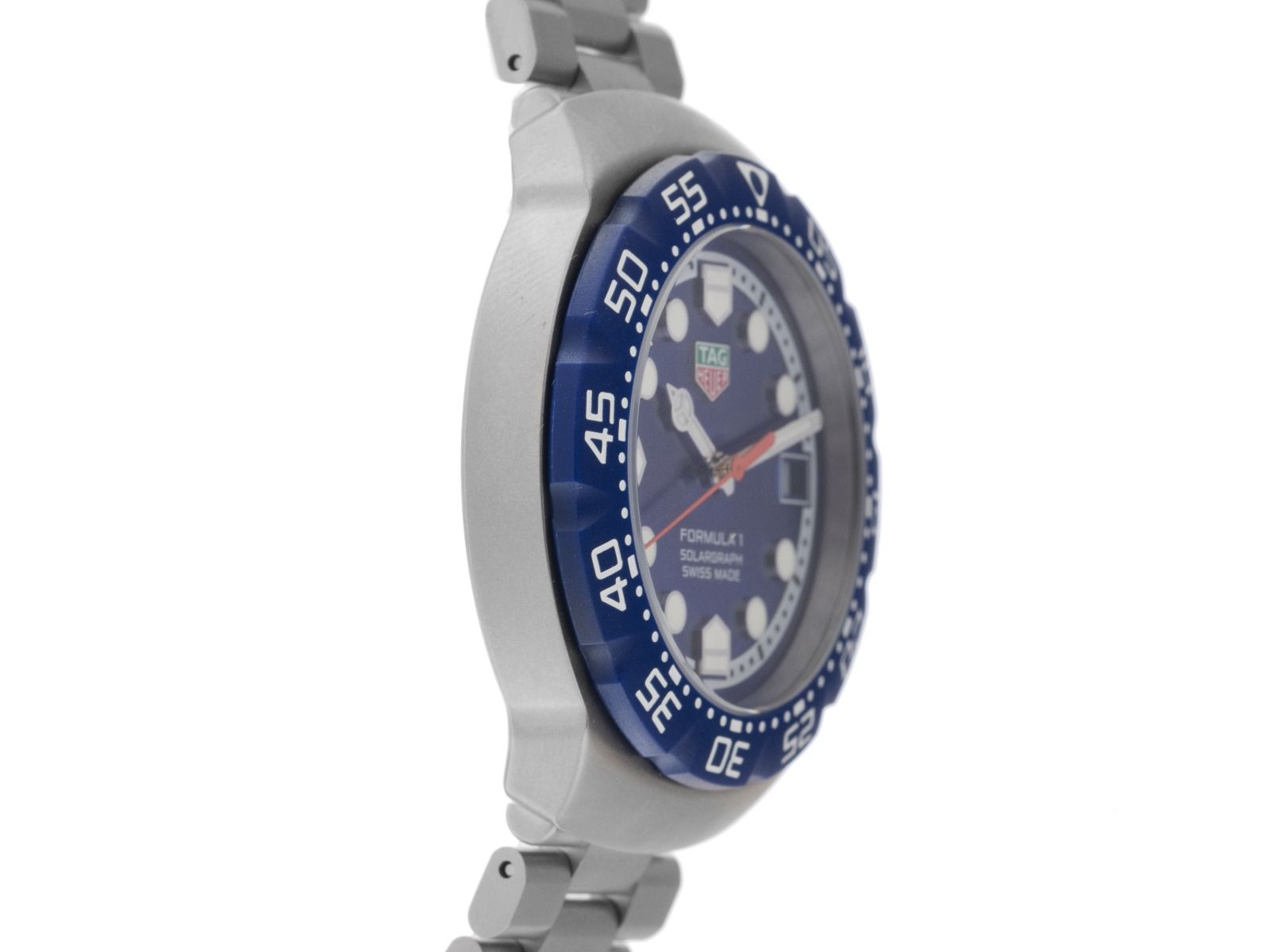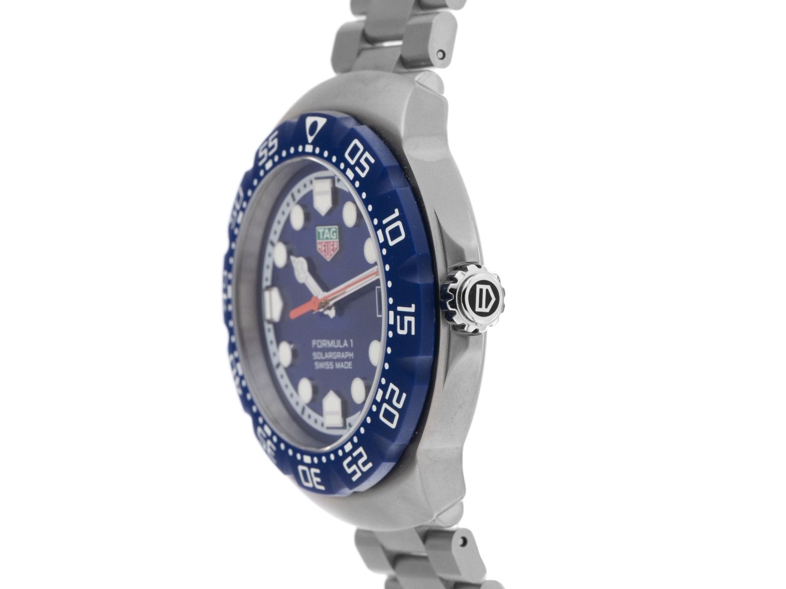 Tag Heuer Formula 1 Solargraph Stahl Quarz Armband StahlGehäuse Edelstahl satiniert, Gehäusedurchmesser ohne Krone 38mm, Gehäusehöhe 9,9mm. Lünette TH-Polylight blau mit 60-Minuten Einteilung, beidseitig drehbar. Armband Edelstahl satiniert, Sicherheitsfaltschließe Edelstahl mit Hersteller-Logo. Zifferblatt blau mit aufgesetzten Leuchtindexen sowie schwarzen Edelstahl Leuchtzeigern. Uhrwerk quarzgesteuert Kaliber TH50-00. Anzeige von Stunde, Minute und Sekunde über Zeiger aus der Mitte, mit Sekundenstopp zur sekundengenauen Einstellung der Uhrzeit, Datumsanzeige mit Schnellverstellung bei 3 Uhr. Saphirglas kratzfest. Krone geriffelt mit Flankenschutz und Hersteller-Logo. Boden Edelstahl verschraubt und graviert mit Tag Heuer Relief. Gewicht der Uhr inklusive Armband 115g, Länge des Armbandes inkl. Gehäuse 210mm. Wasserdicht bis 10 ATM. Referenznummer: WBY1112.BA0042, ID: ST610222801225RE-1900, Artikelnummer: 10000083727. Original Tag Heuer Box mit Umkarton und Garantie Papiere von 2025 sowie Beschreibung, Full Set. Ungetragen. Lieferzeit sofort.