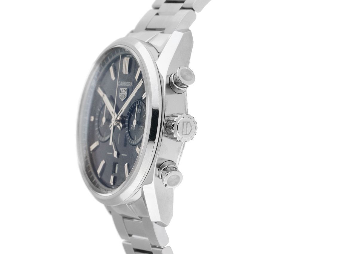 Tag Heuer Carrera Stahl Automatik Chronograph Armband StahlGehäuse Edelstahl poliert und satiniert, Gehäusedurchmesser ohne Krone 42mm, Gehäusehöhe 14,6mm. Lünette Edelstahl glatt und poliert. Armband Edelstahl, Sicherheitsfaltschließe Edelstahl mit Hersteller-Logo. Zifferblatt blau mit aufgesetzten Edelstahl Leuchtindexen und Edelstahl Leuchtzeigern. Uhrwerk Automatik, Chronograph, Tag Heuer Calibre 02 mit 33 Edelsteinen, Gangreserve ca. 80 Stunden. Anzeige von Stunde und Minute über Zeiger aus der Mitte, kleine Sekunde mit Sekundenstopp zur sekundengenauen Einstellung der Uhrzeit bei 6 Uhr, Datumsanzeige mit Schnellverstellung bei 6 Uhr. Saphirglas kratzfest und gewölbt. Krone mit Hersteller-Logo. Boden Edelstahl verschraubt und graviert mit Saphirglas Sichtfenster. Gewicht der Uhr inklusive Armband 166g, Länge des Armbandes inklusive Gehäuse 200mm. Wasserdicht bis 10 ATM. Referenznummer: CBN2011.BA0642, ID: ST610278001225H-6500, Artikelnummer: 10000083736. Original Tag Heuer Box mit Umkarton und Garantie Papiere von 2025, Full Set. Ungetragen. Lieferzeit sofort.