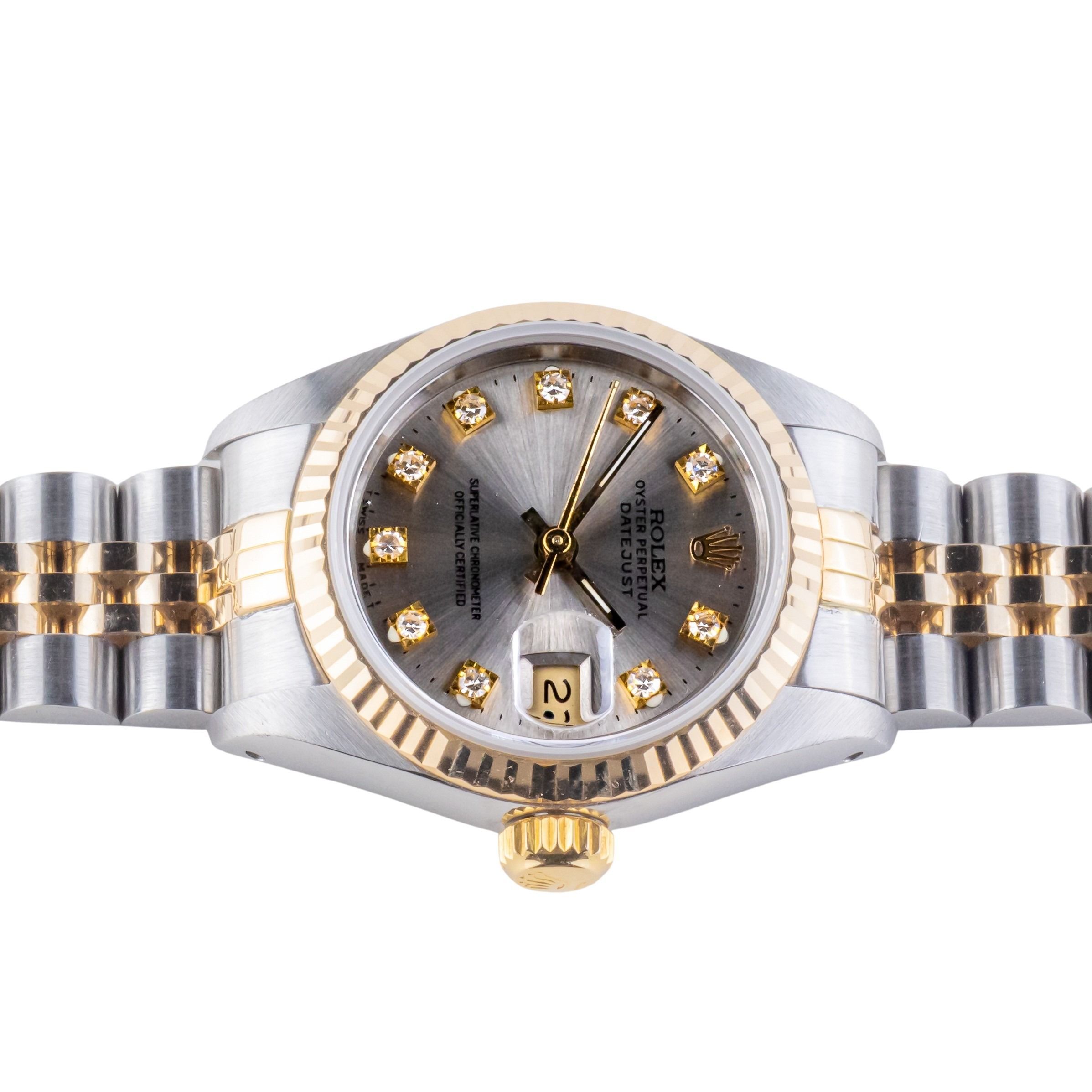 Rolex Oyster Perpetual Lady-Datejust referencia 69173 de 1988, incluyendo juego completo. La Lady-Datejust 69173 tiene una caja de 26 mm en oro y acero inoxidable, pulsera jubilee bicolor y bisel estriado de oro de 14k. Esta Lady-Datejust 69173 cuenta con un movimiento automático calibre 2135 con función de fecha rápida, un cristal de zafiro resistente a los arañazos y una esfera gris con manecillas de tritio e índices de diamante.
