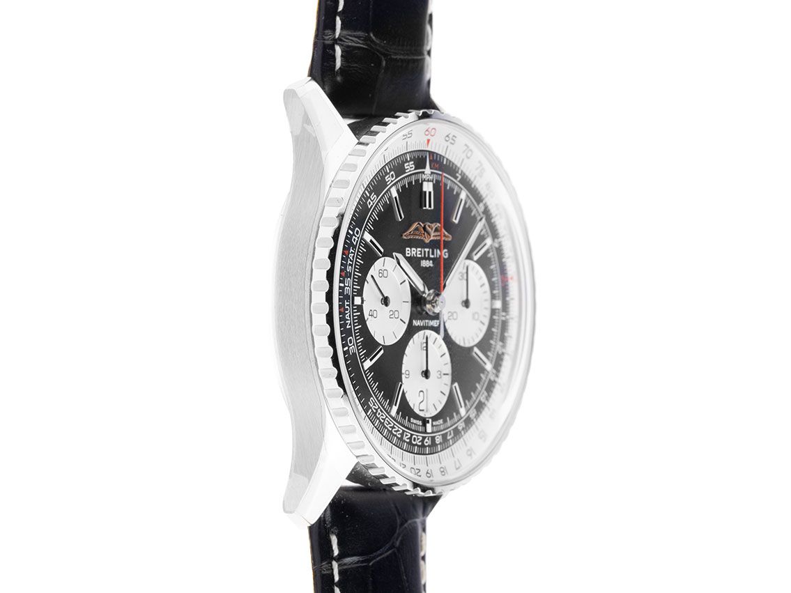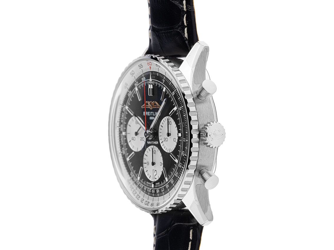 Breitling Navitimer B01 Stahl Automatik Chronograph Armband Krokoleder FaltschließeGehäuse Edelstahl poliert, Gehäusedurchmesser ohne Krone 43mm, Gehäusehöhe 13,7mm. Lünette Edelstahl gerädelt mit Unterglas Rechenschieber, beidseitig drehbar. Armband Krokoleder schwarz , Anstoßbreite 22mm, Sicherheitsfaltschließe Edelstahl mit Hersteller-Logo. Zifferblatt schwarz mit aufgesetzten Edelstahl Leuchtindexen und Edelstahl Leuchtzeigern. Uhrwerk Automatik, Chronograph, Chronometer mit Zeugnis, Kaliber Breitling 01 mit 47 Edelsteinen, Gangreserve ca. 70 Stunden. Anzeige von Stunde und Minute über Zeiger aus der Mitte, kleine Sekunde mit Sekundenstopp zur sekundengenauen Einstellung der Uhrzeit bei 9 Uhr, Datumsanzeige mit Schnellverstellung bei 6 Uhr. Saphirglas kratzfest, doppelseitig entspiegelt und bombiert. Krone mit Hersteller-Logo. Boden Edelstahl verschraubt und graviert mit Saphirglas Sichtfenster. Gewicht der Uhr inklusive Armband 98g. Wasserdicht bis 3 ATM. Referenznummer: AB0138211B1P1, ID: ST5806128381025H-9500, Artikelnummer: 10000082447. Original Breitling Box und Garantie Papiere von 2025 sowie Beschreibung, Full Set. Ungetragen. Lieferzeit sofort.