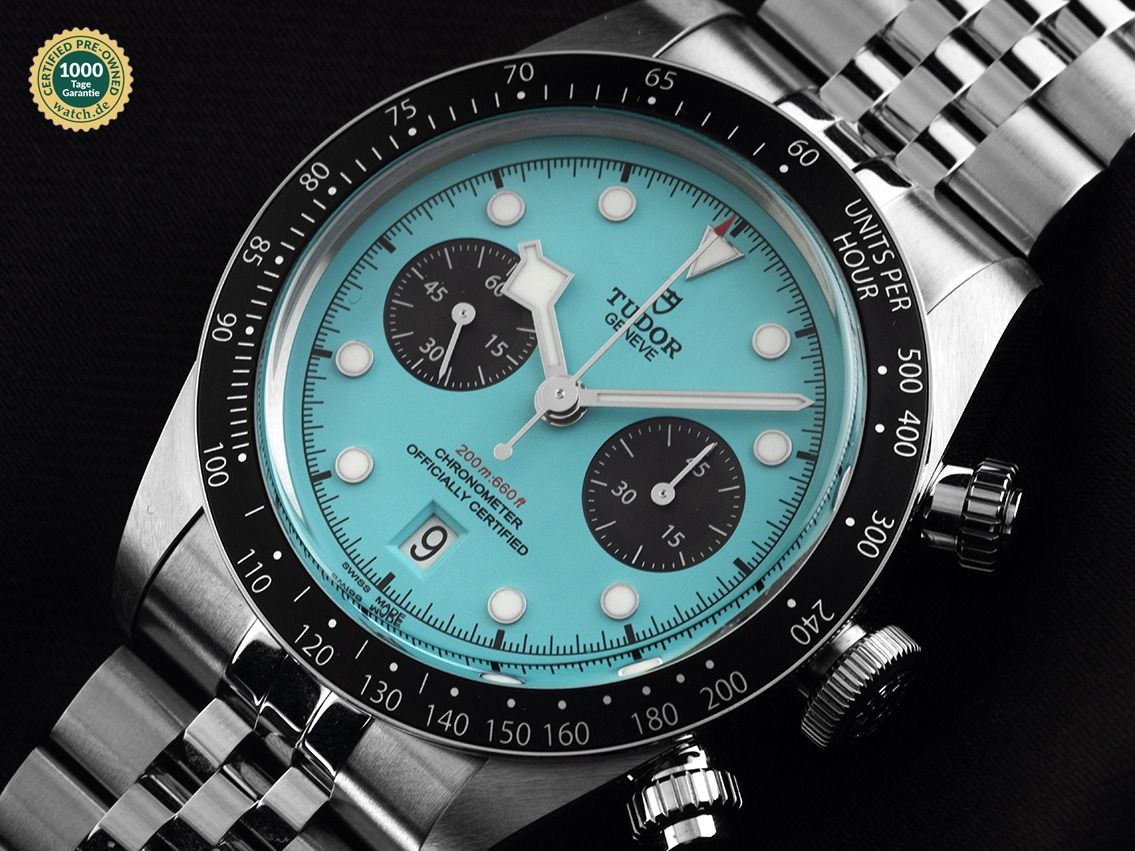 Tudor Black Bay Chronograph Stahl Automatik Chronograph Armband StahlGehäuse Edelstahl poliert und satiniert, Gehäusedurchmesser ohne Krone 41mm, Gehäusehöhe 14,4mm. Lünette Edelstahl mit schwarzem Inlay und Tachymeterskala. Armband Edelstahl poliert und satiniert, Sicherheitsfaltschließe Edelstahl mit Hersteller-Logo. Zifferblatt türkis mit aufgesetzten Leuchtindexen und Edelstahl Leuchtzeigern sowie schwarzen Hilfszifferblättern. Uhrwerk Automatik, Chronograph, Chronometer mit Zeugnis (COSC), Kaliber Tudor MT5813, Gangreserve ca. 70 Stunden. Anzeige von Stunde und Minute über Zeiger aus der Mitte, kleine Sekunde mit Sekundenstopp zur sekundengenauen Einstellung der Uhrzeit bei 9 Uhr, Datumsanzeige mit Schnellverstellung bei 6 Uhr. Saphirglas kratzfest. Krone verschraubbar mit Hersteller-Logo, Chronographen Drücker verschraubbar. Boden Edelstahl verschraubt und graviert. Gewicht der Uhr inklusive Armband 165g, Länge des Armbandes inklusive Gehäuse 170mm. Wasserdicht bis 20 ATM. Referenznummer: M79360N-0024, ID: P1789176001025H-12500/5870, Artikelnummer: 10000082816. Original Tudor Box mit Umkarton und Garantie Papiere von August 2025 sowie Beschreibung und Watchregister Auszug von Oktober 2025, The Watch Register Zertifikat / ohne Eintrag (Internationale Datenbank für verlorene oder gestohlene Uhren), Full Set. Ungetragen. Lieferzeit sofort.