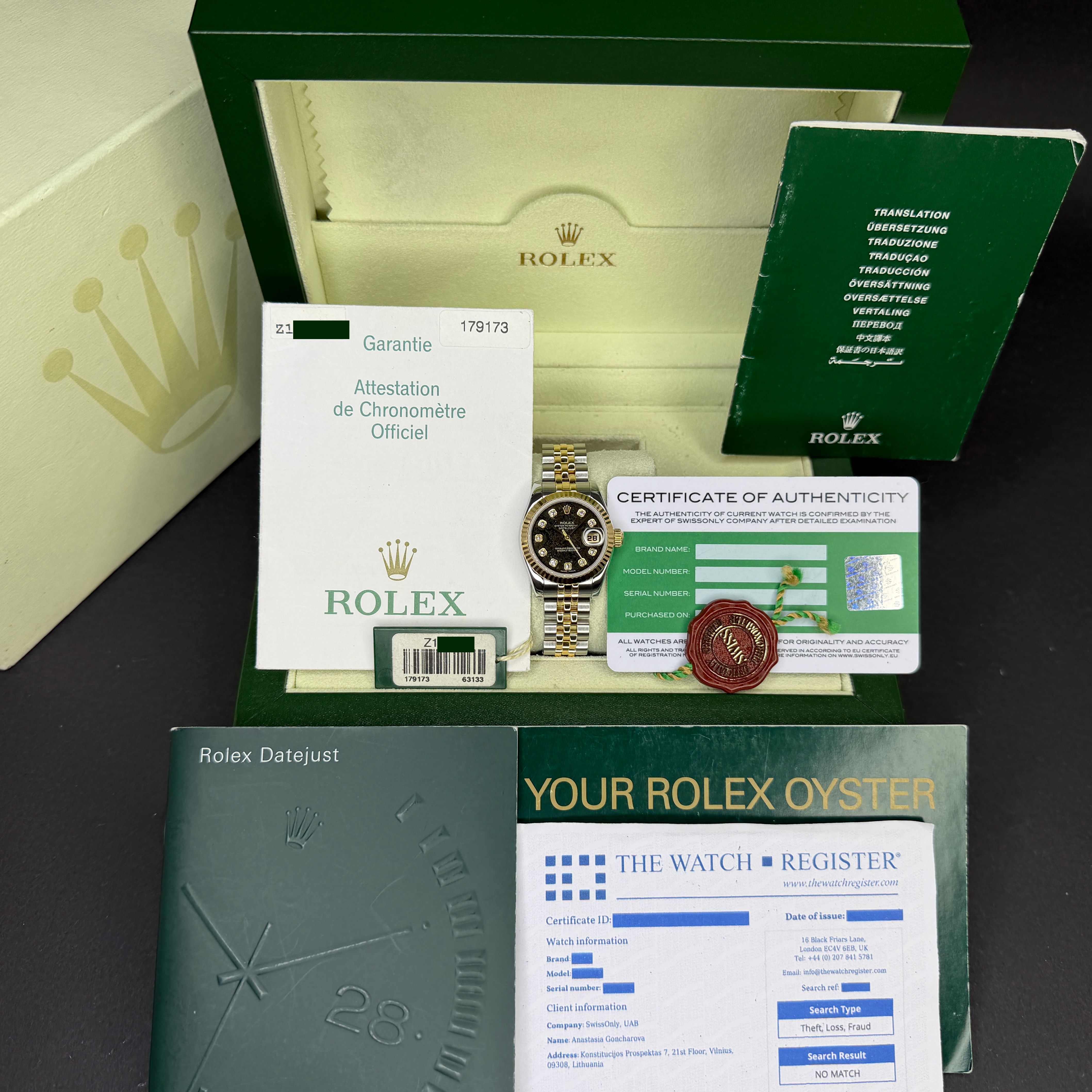 This Rolex Lady-Datejust 179173 features an Extremely RARE Pyrite Stone diamond dial and is crafted from 18K yellow gold and stainless steel, with a production year of 2006.Case No: Z16XXXX