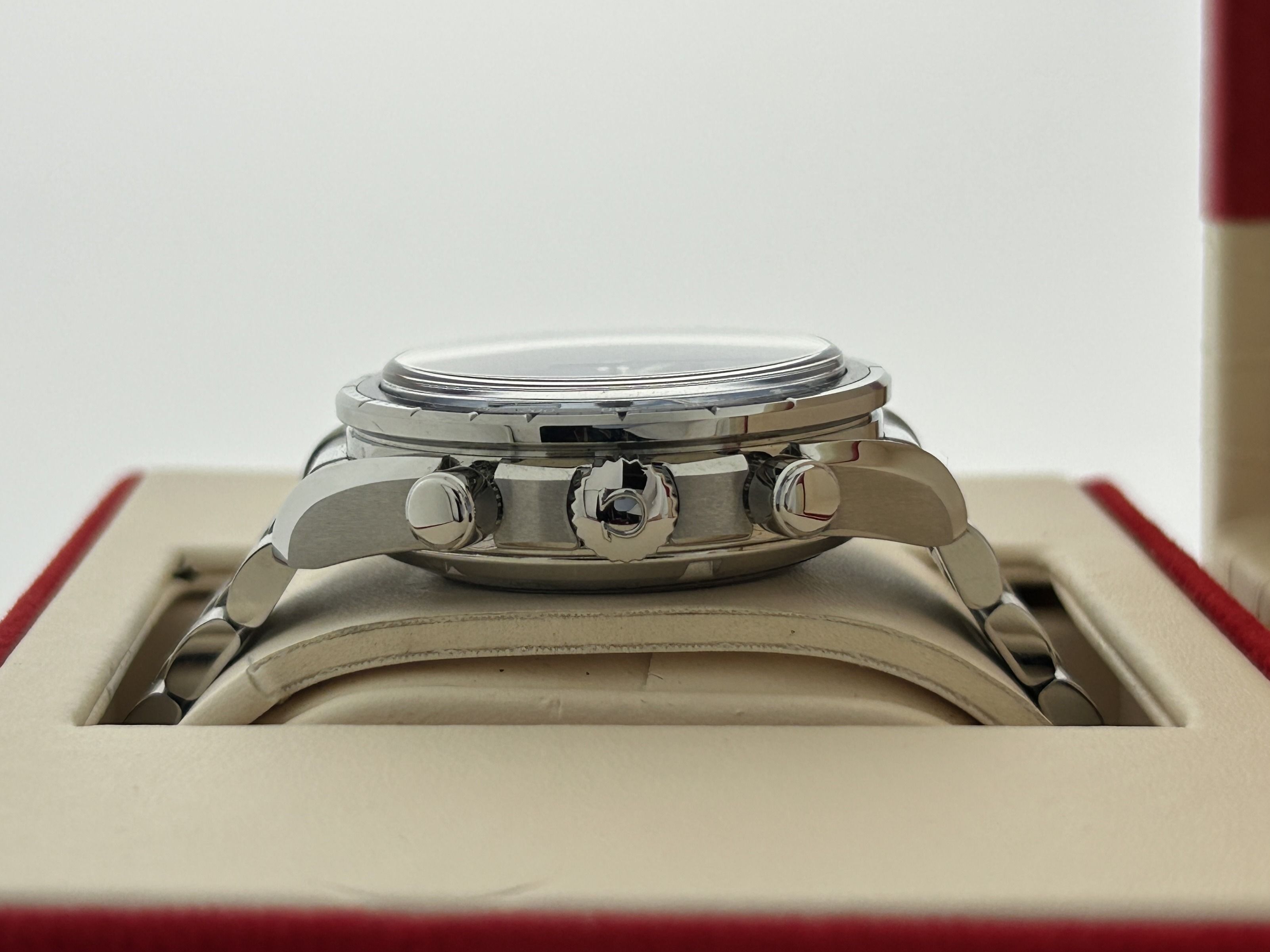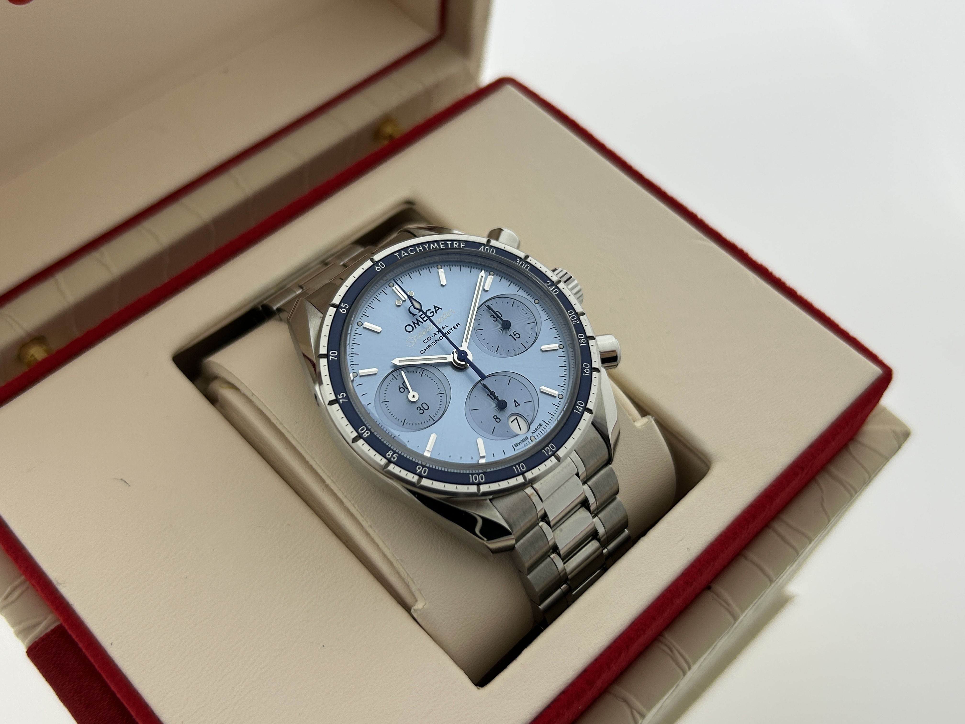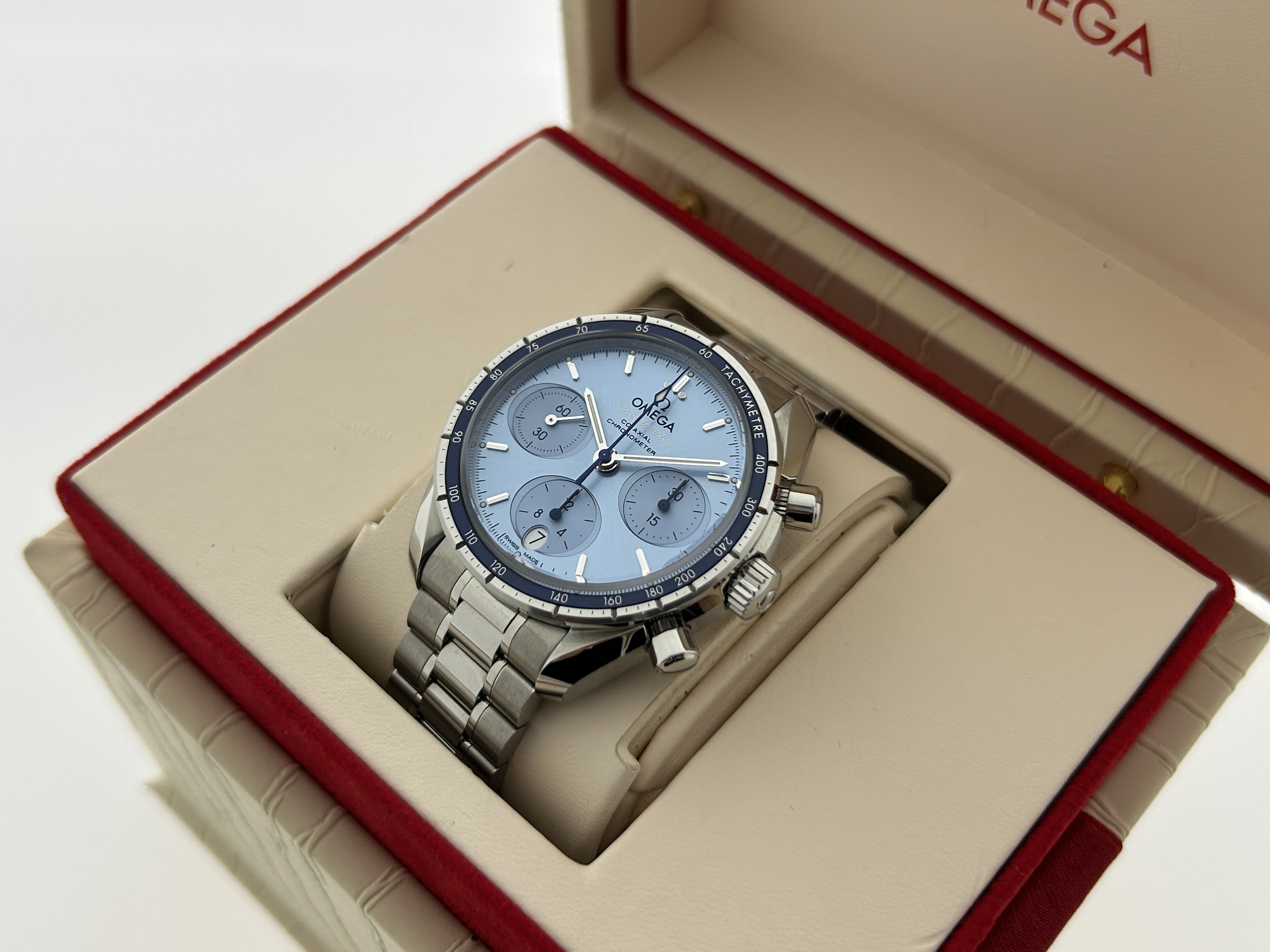 The Omega comes with 5 years of international Omega warranty.An Omega Speedmaster chronograph watch, ref. 32430385003001, fullset, from 2025. The watch has a steel 38mm case with a steel bracelet. The Omega has a blue dial with three subdials with date-window at 6 o'clock. The watch comes with its original box and certificate. The Omega is in a great condition, like new.