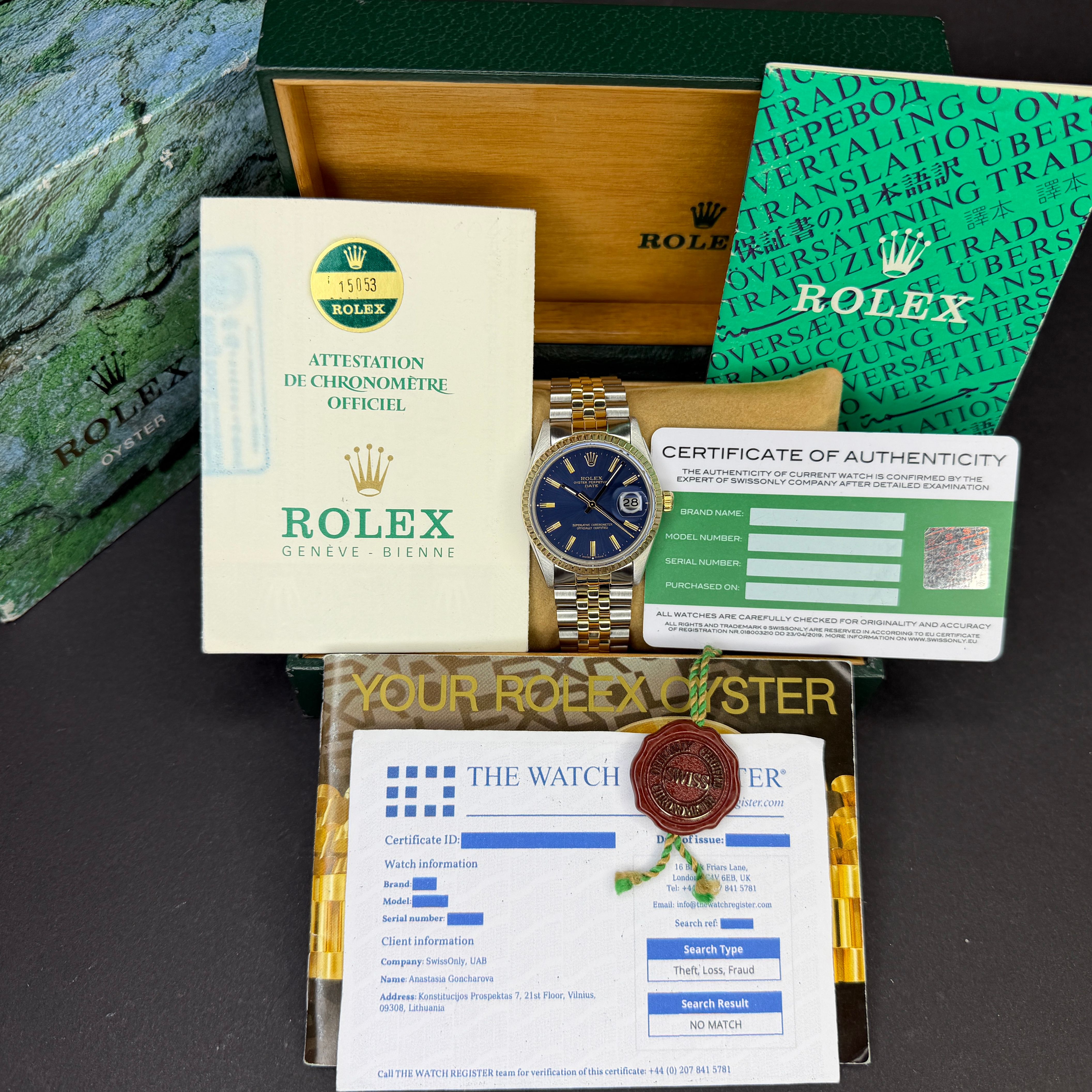 Rolex Oyster Perpetual Date, 15053, 34mm, 1982, Two-Tone, Blue dial, Fullset, 1y warranty