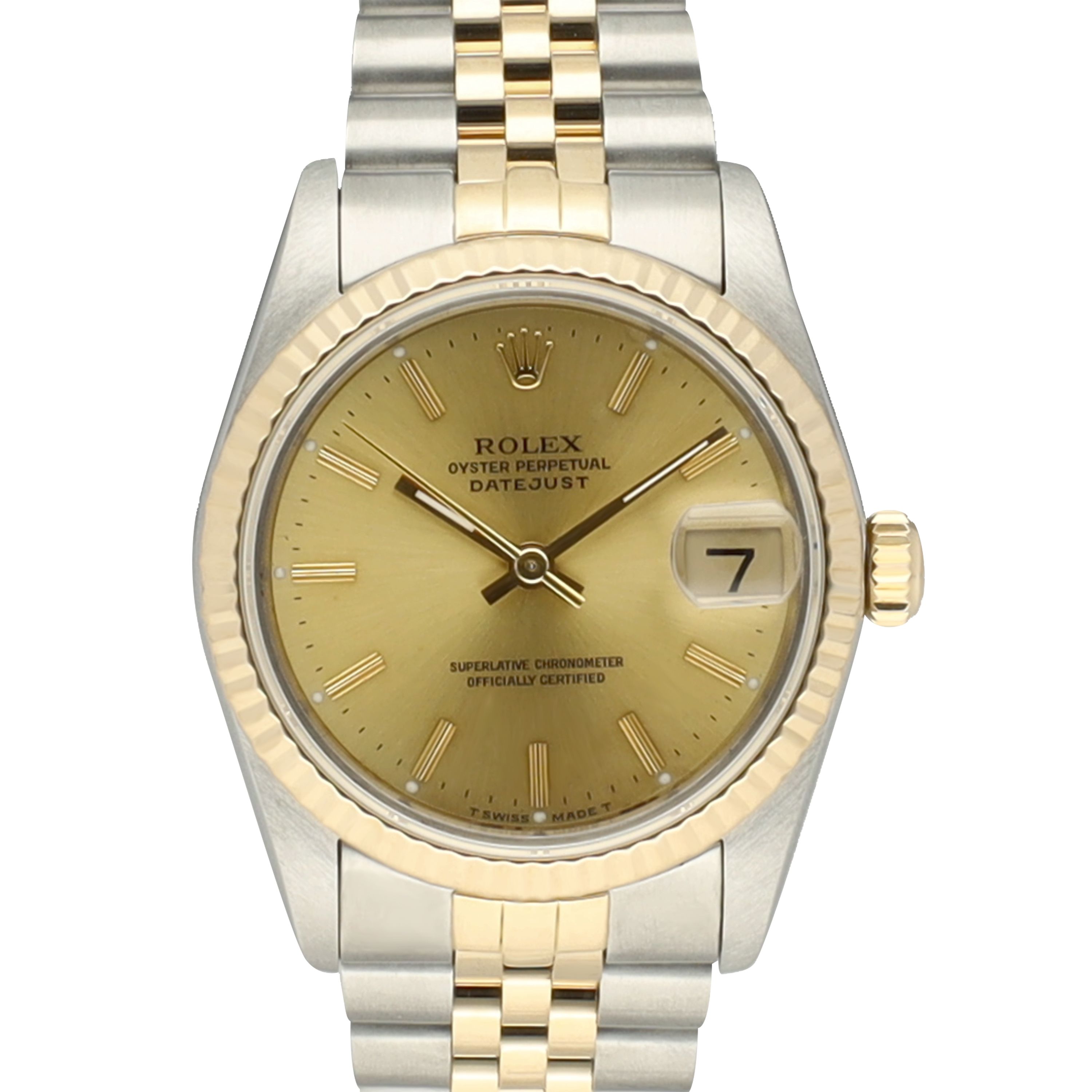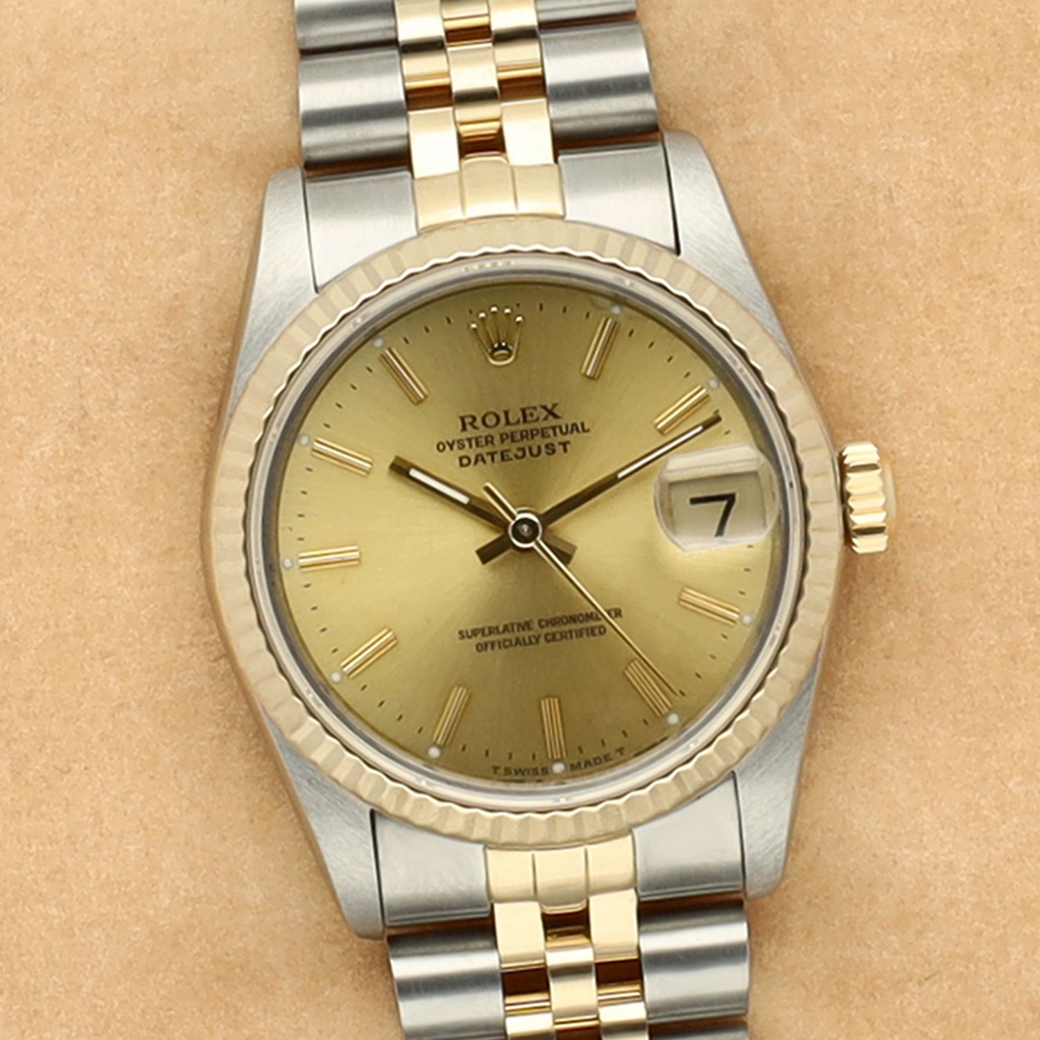 The Rolex Datejust 31, reference 68273, dating from 1989, is offered in excellent condition, full set, including the original Rolex box and papers. The watch has been fully serviced, ensuring excellent mechanical performance as well as a very well-preserved external condition. The 31 mm case is crafted from Oystersteel and 18-carat yellow gold, fitted with the iconic yellow gold fluted bezel. It is paired with the timeless two-tone Jubilee bracelet, known for its comfort and unmistakable Rolex elegance.At its heart, this Datejust is powered by the automatic Rolex calibre 2135, offering reliable chronometer-certified precision, a quickset date function, and an approximate 42-hour power reserve.