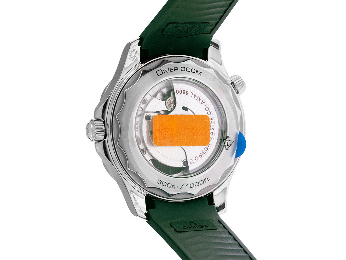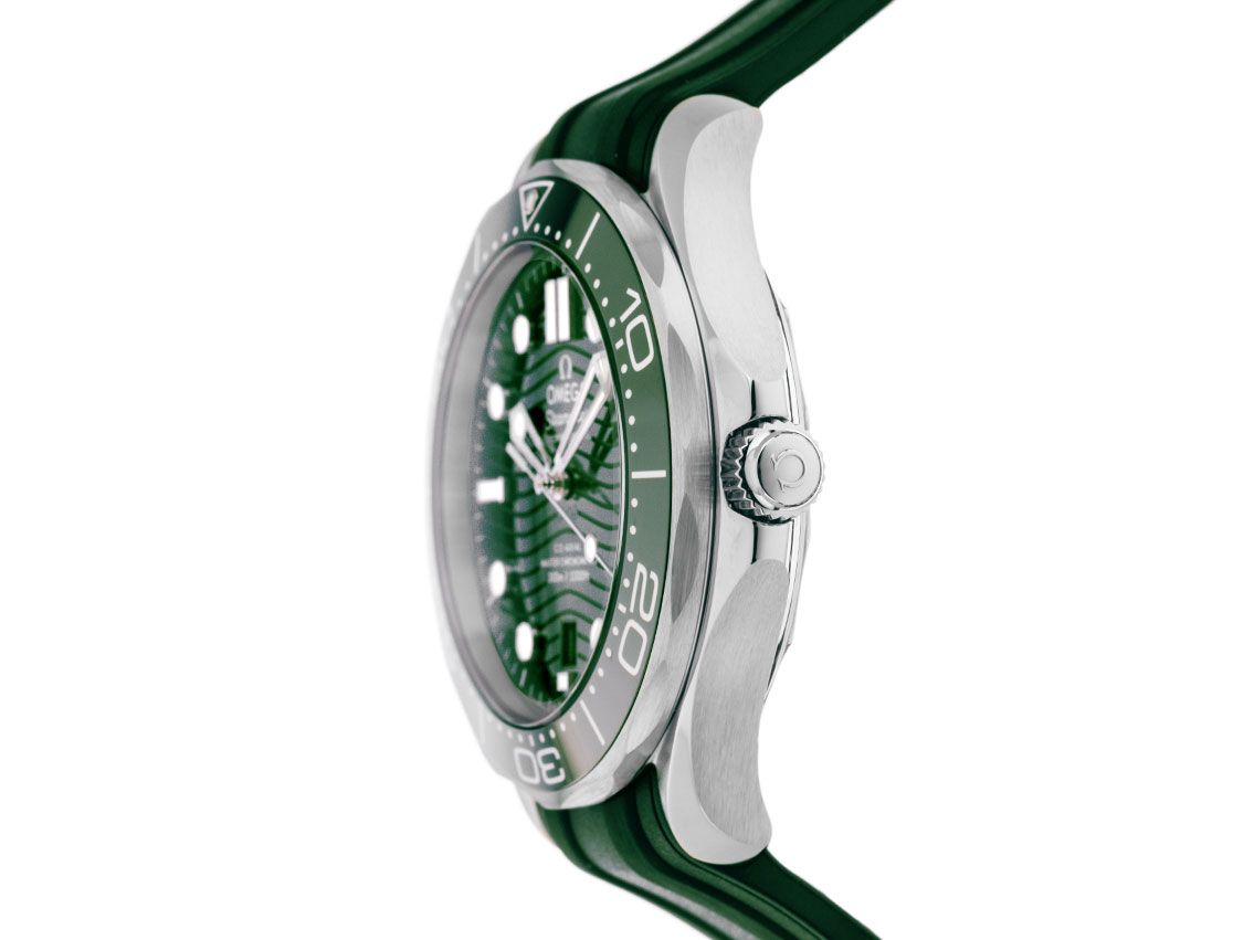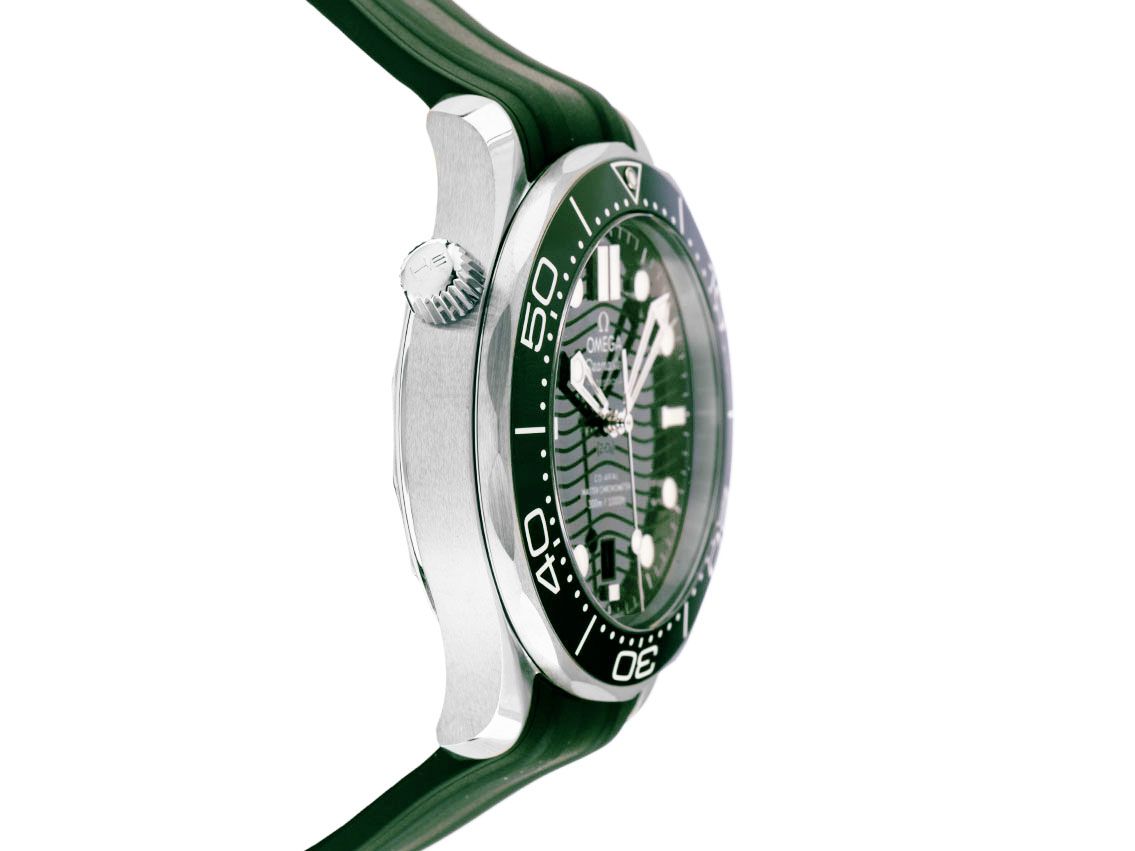 Caja de acero pulido y satinado, diámetro de la caja sin corona 42mm, altura de la caja 13,6mm. Bisel de acero con inserto de cerámica verde, escala de 60 minutos y punto luminoso, unidireccional. Válvula de helio a las 10 en punto. Correa de caucho verde, ancho de asas 20mm, hebilla de pasador de acero con logo del fabricante. Esfera verde con patrón de olas grabado a láser, índices luminosos aplicados y puntos luminosos, así como agujas esqueléticas de acero luminosas. Movimiento automático, cronómetro con certificado, calibre de manufactura Omega 8800 con 35 rubíes, reserva de marcha de aproximadamente 55 horas. Indicador de hora, minuto y segundo a través de agujas centrales con parada de segundero para ajuste preciso de la hora, indicador de fecha con ajuste rápido a las 6 en punto. Cristal de zafiro resistente a los arañazos, abovedado y antirreflejos por ambas caras. Corona atornillada con protección lateral y logo del fabricante. Fondo de acero atornillado y grabado con ventana de cristal de zafiro. Peso del reloj incluyendo la correa 116g. Resistente al agua hasta 30 ATM. Número de referencia: 210.32.42.20.10.001, ID: ST116085601225H-6100, número de artículo: 10000083904. Caja original de Omega con caja exterior y documentos de garantía de noviembre de 2025, Full Set. Sin usar. Tiempo de entrega inmediato.
