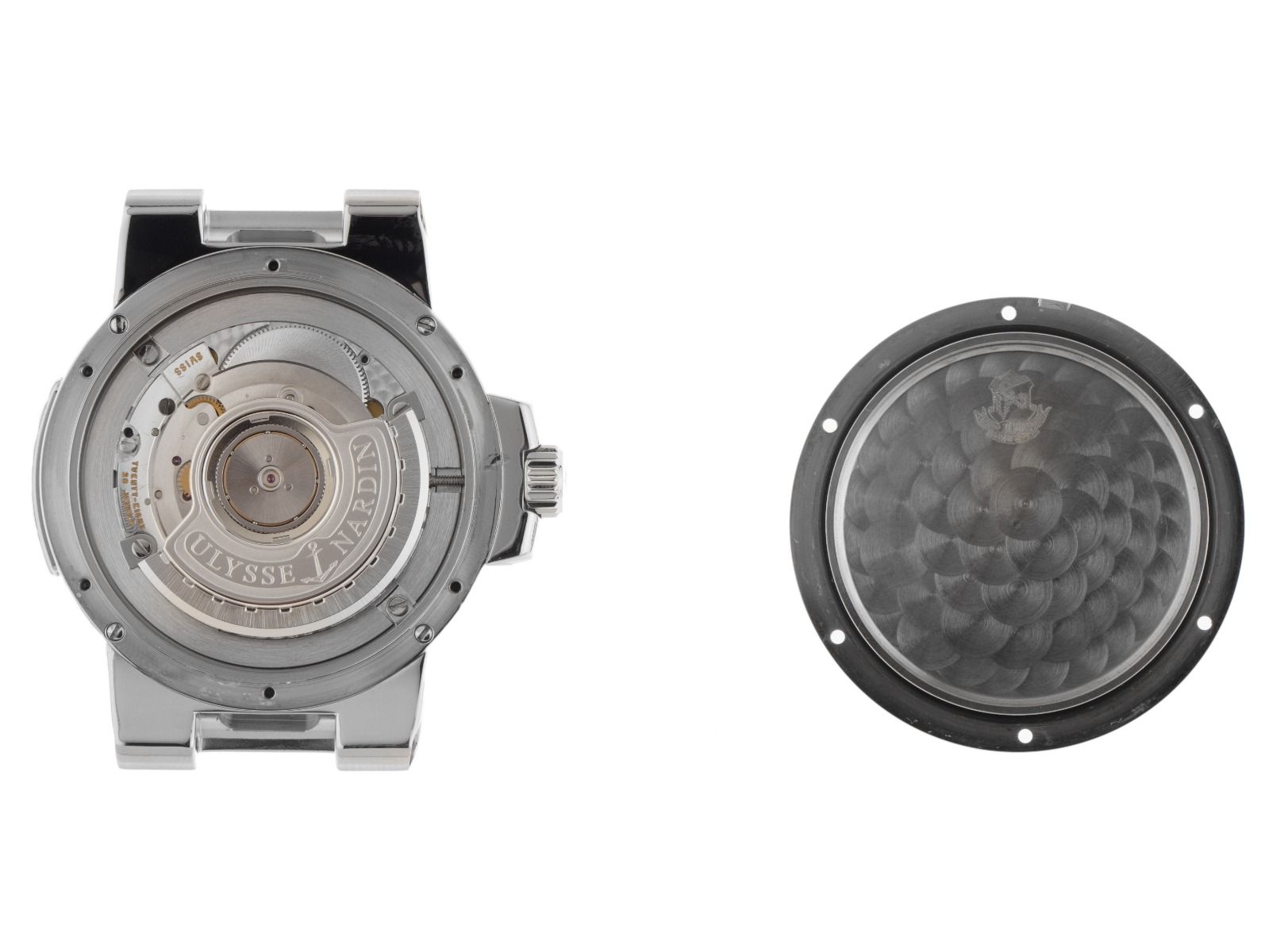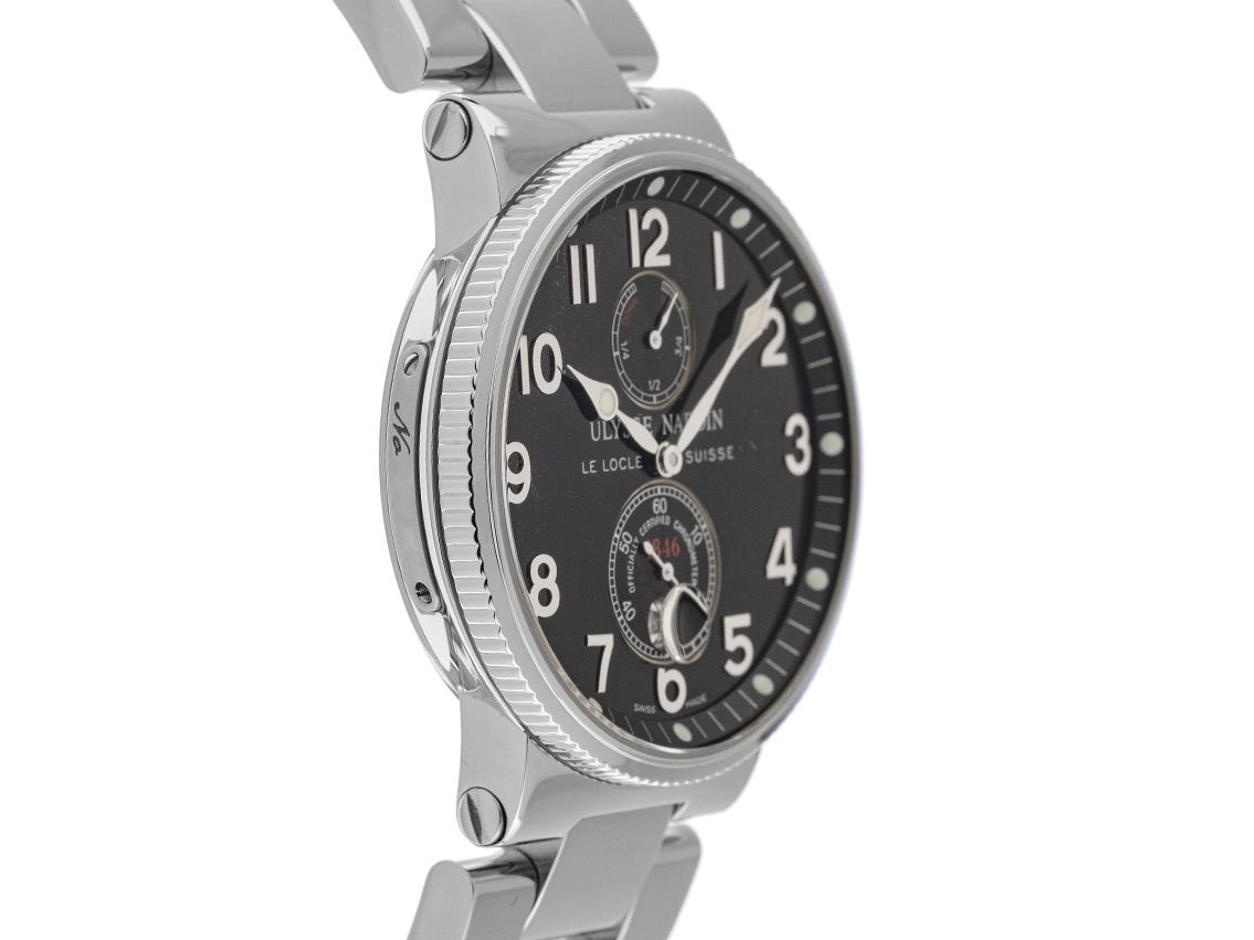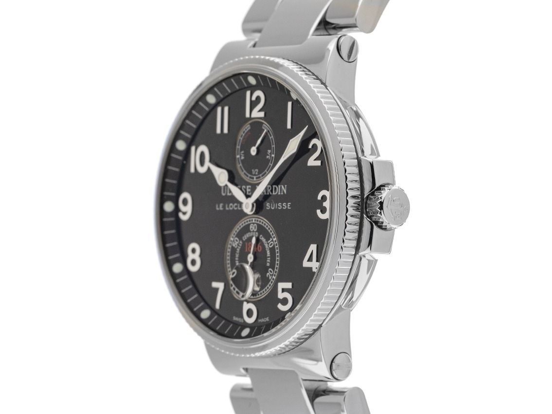 Caja de acero inoxidable pulido, diámetro de la caja sin corona 40mm, altura de la caja 11,1mm. Pulsera de acero inoxidable pulido, cierre desplegable de doble seguridad en acero con el logo del fabricante. Esfera negra con números árabes en acero inoxidable y manecillas pulidas de acero. Movimiento automático, cronómetro con certificado, calibre Ulysse Nardin UNO 26 con 28 rubíes. Indicación de horas y minutos a través de manecillas centrales, segundero pequeño con parada de segundos para un ajuste preciso de la hora a las 6, indicación de fecha bajo cristal de lupa con ajuste rápido a las 6, indicador de reserva de marcha a las 12. Cristal de zafiro resistente a los arañazos. Corona atornillada con protección lateral y logo del fabricante. Fondo de acero atornillado 6 veces y grabado. Peso del reloj incluyendo la pulsera 170g, longitud de la pulsera incluyendo la caja de 180mm. Número de referencia: 263-66, número de caja: 3XXX, ID: P208944001225H-5900, número de artículo: 10000083764. Con control de marcha y completa restauración exterior de diciembre de 2025. Caja original de Ulysse Nardin con caja exterior y documentos de garantía de julio de 2007, así como descripción y extracto del registro de relojes de diciembre de 2025, certificado de The Watch Register / sin entrada (base de datos internacional para relojes perdidos o robados), Full Set. Super oferta, pieza de colección muy rara, casi sin usar. Como nuevo. Tiempo de entrega inmediato.