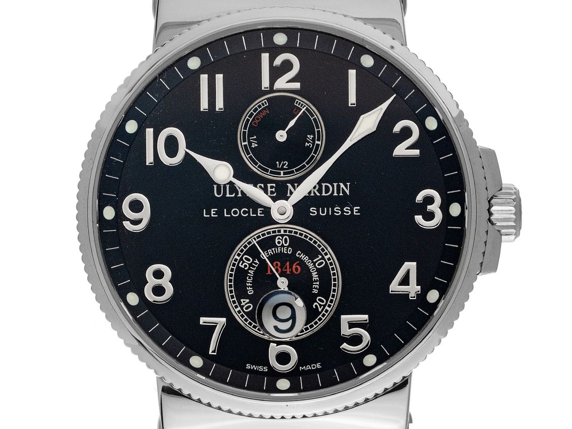 Ulysse Nardin Marine Chronograph Stahl Automatik Armband StahlGehäuse Edelstahl poliert, Gehäusedurchmesser ohne Krone 40mm, Gehäusehöhe 11,1mm. Armband Edelstahl poliert, Doppelsicherheitsfaltschließe Edelstahl mit Hersteller-Logo. Zifferblatt schwarz mit arabischen Edelstahl Ziffern und polierten Edelstahl Zeigern. Uhrwerk Automatik, Chronometer mit Zeugnis, Kaliber Ulysse Nardin UNO 26 mit 28 Edelsteinen. Anzeige von Stunde und Minute über Zeiger aus der Mitte, kleine Sekunde mit Sekundenstopp zur sekundengenauen Einstellung der Uhrzeit bei 6 Uhr, Datumsanzeige unter Glaslupe mit Schnellverstellung bei 6 Uhr, Gangreserveanzeige bei 12 Uhr. Saphirglas kratzfest. Krone verschraubbar mit Flankenschutz und Hersteller-Logo. Boden Edelstahl 6-fach verschraubt und graviert. Gewicht der Uhr inklusive Armband 170g, Länge des Armbandes inklusive Gehäuse von 180mm. Referenznummer: 263-66, Gehäusenummer: 3XXX, ID: P208944001225H-5900, Artikelnummer: 10000083764. Mit Gangkontrolle und kompletter äußerlicher Aufarbeitung von Dezember 2025. Original Ulysse Nardin Box mit Umkarton und Garantie Papiere von Juli 2007 sowie Beschreibung und Watchregister Auszug von Dezember 2025, The Watch Register Zertifikat / ohne Eintrag (Internationale Datenbank für verlorene oder gestohlene Uhren), Full Set. Superschnäppchen, sehr seltenes Sammlerstück, fast nicht getragen. Wie Neu. Lieferzeit sofort.