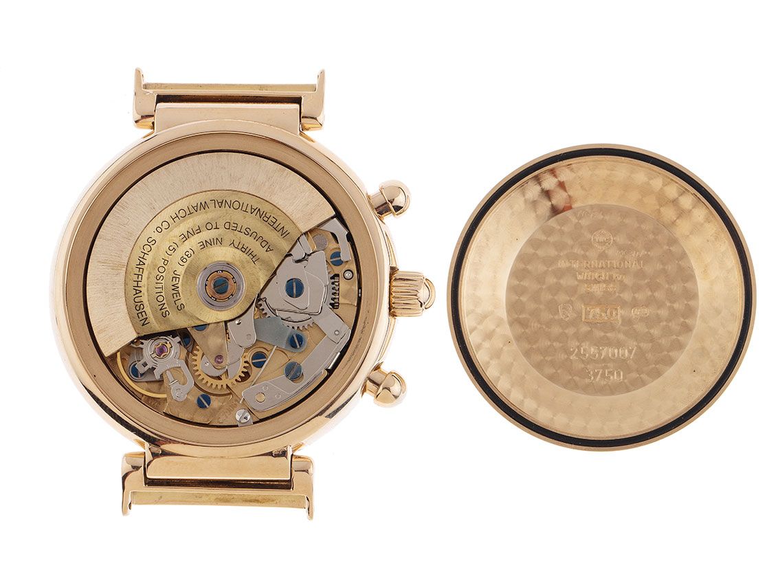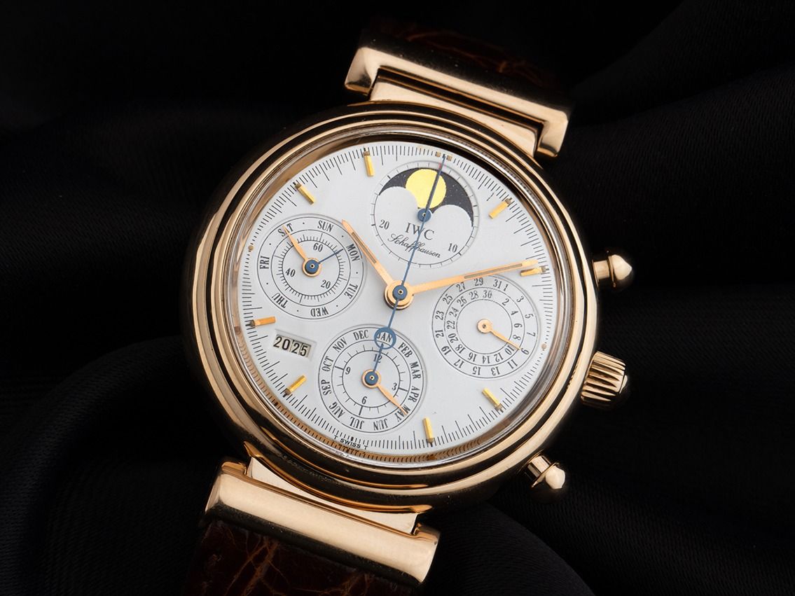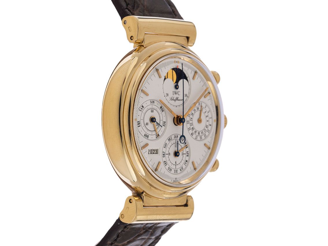 Caja de 18kt Oro Rosa pulido, diámetro de la caja sin corona 39mm, altura de la caja 14,9mm. Bisel de 18kt Oro Rosa pulido. Correa de cuero marrón con costura decorativa, ancho de asas 20mm, hebilla de pin de 18kt Oro Rosa. Esfera blanca con índices en oro rosa aplicados y agujas en oro rosa y azul. Movimiento automático, cronógrafo, calendario perpetuo, calibre IWC Calibre 79261 (base: Valjoux 7750 con módulo IWC de Kurt Klaus) con 36 piedras preciosas. Indicador de horas y minutos mediante agujas centrales, segundero pequeño a las 9 en punto, indicador de fecha mediante aguja a las 3 en punto, indicador de día de la semana en inglés mediante aguja a las 9 en punto, indicador de mes en inglés mediante aguja a las 6 en punto, indicador de año de cuatro dígitos entre las 7 y las 8 en punto (Calendario Perpetuo (corrección automática de años bisiestos hasta 2499), indicador de fases lunares a las 12 en punto. Cristal de plexiglás abombado. Corona atornillada. Fondo de 18kt Oro Rosa grabado. Peso del reloj incluyendo la correa 88g. Número de referencia: 3750, año de fabricación: 1998, número de caja: 2557XXX, ID: P1631167980925H-17900, número de artículo: 10000082441. Con control de marcha y reacondicionamiento exterior completo de octubre de 2025. Caja original de IWC y documentos de garantía sin fecha de entrada, así como descripción, herramienta de ajuste, deslizadores de siglo y extracto del registro de relojes de septiembre de 2025, certificado de The Watch Register / sin entrada (base de datos internacional para relojes perdidos o robados), Full Set. Inversión con potencial de apreciación, pieza de colección extremadamente rara, reloj de caja fuerte, casi sin usar. Como nuevo. Tiempo de entrega inmediato.