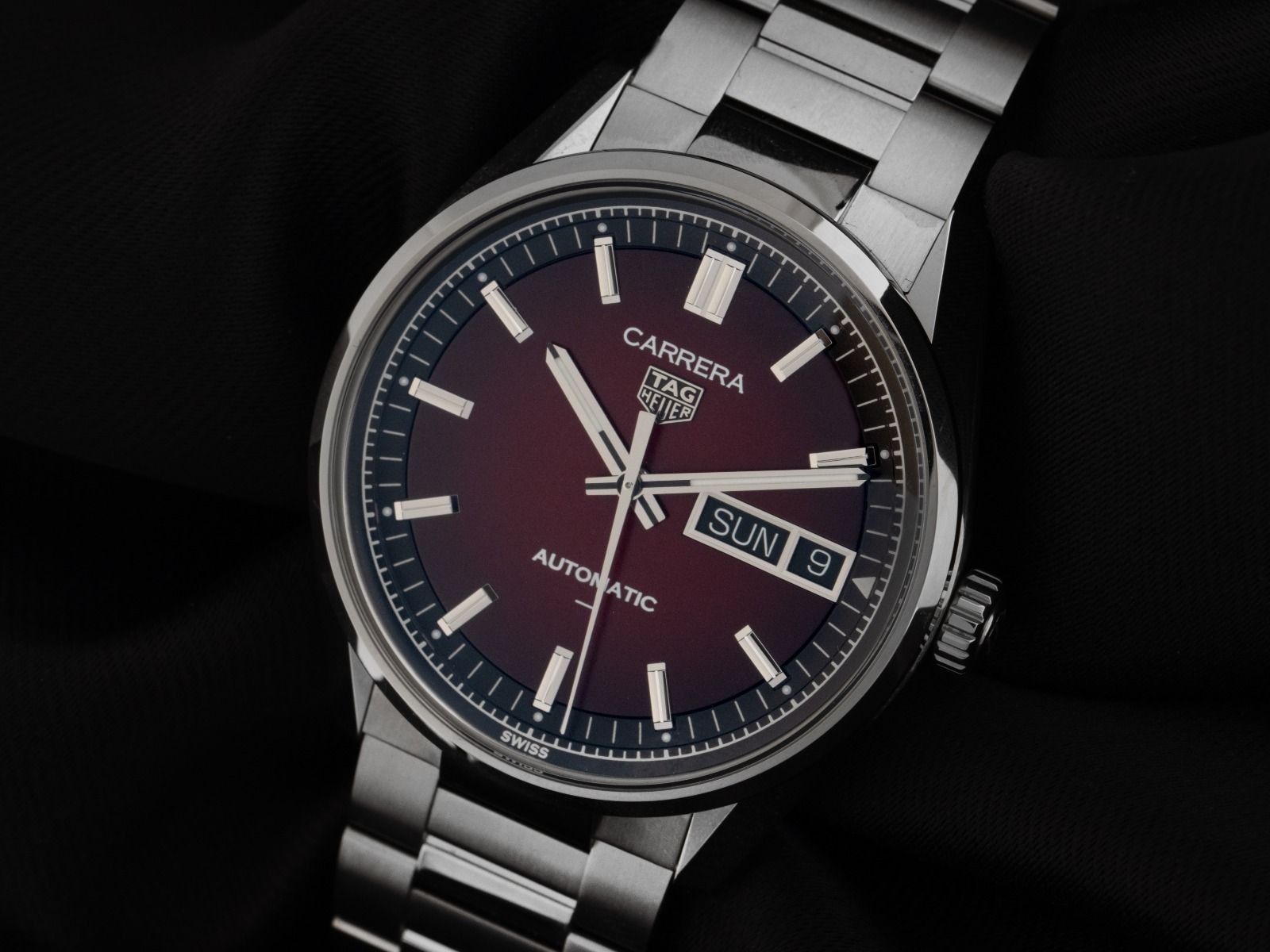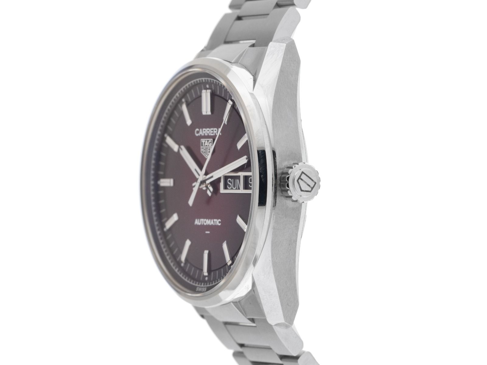 Tag Heuer Carrera Day Date Stahl Automatik Armband StahlGehäuse Edelstahl poliert, Gehäusedurchmesser ohne Krone 41mm, Gehäusehöhe 12,7mm. Lünette Edelstahl glatt und poliert. Armband Edelstahl poliert, Doppelsicherheitsfaltschließe Edelstahl mit Hersteller-Logo. Zifferblatt rot / schwarz verlaufend mit aufgesetzten Edelstahl Indexen und Edelstahl Leuchtzeigern. Uhrwerk Automatik, Kaliber Tag Heuer TH31-02 mit 30 Edelsteinen, Gangreserve ca. 80 Stunden. Anzeige von Stunde, Minute und Sekunde über Zeiger aus der Mitte mit Sekundenstopp zur sekundengenauen Einstellung der Uhrzeit, Datum- und Wochentaganzeige in Englisch mit Schnellverstellung bei 3 Uhr. Saphirglas kratzfest und gewölbt. Krone mit Hersteller-Logo. Boden Edelstahl verschraubt und graviert mit Saphirglas Sichtfenster. Gewicht der Uhr inklusive Armband 152g, Länge des Armbandes inklusive Gehäuse 200mm. Wasserdicht bis 10 ATM. Referenznummer: WDA2113.BA0043, ID: ST116055941225H-4250, Artikelnummer: 10000084097. Original Tag Heuer Box mit Umkarton und Garantie Papiere von 2025, Full Set. Ungetragen. Lieferzeit sofort.