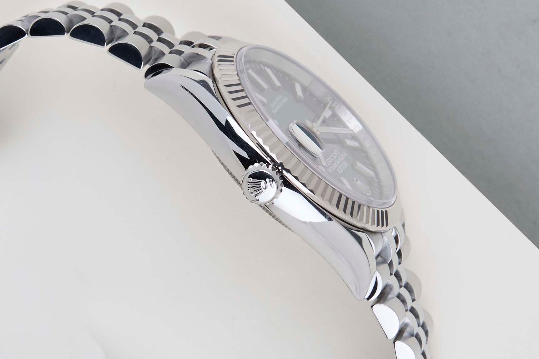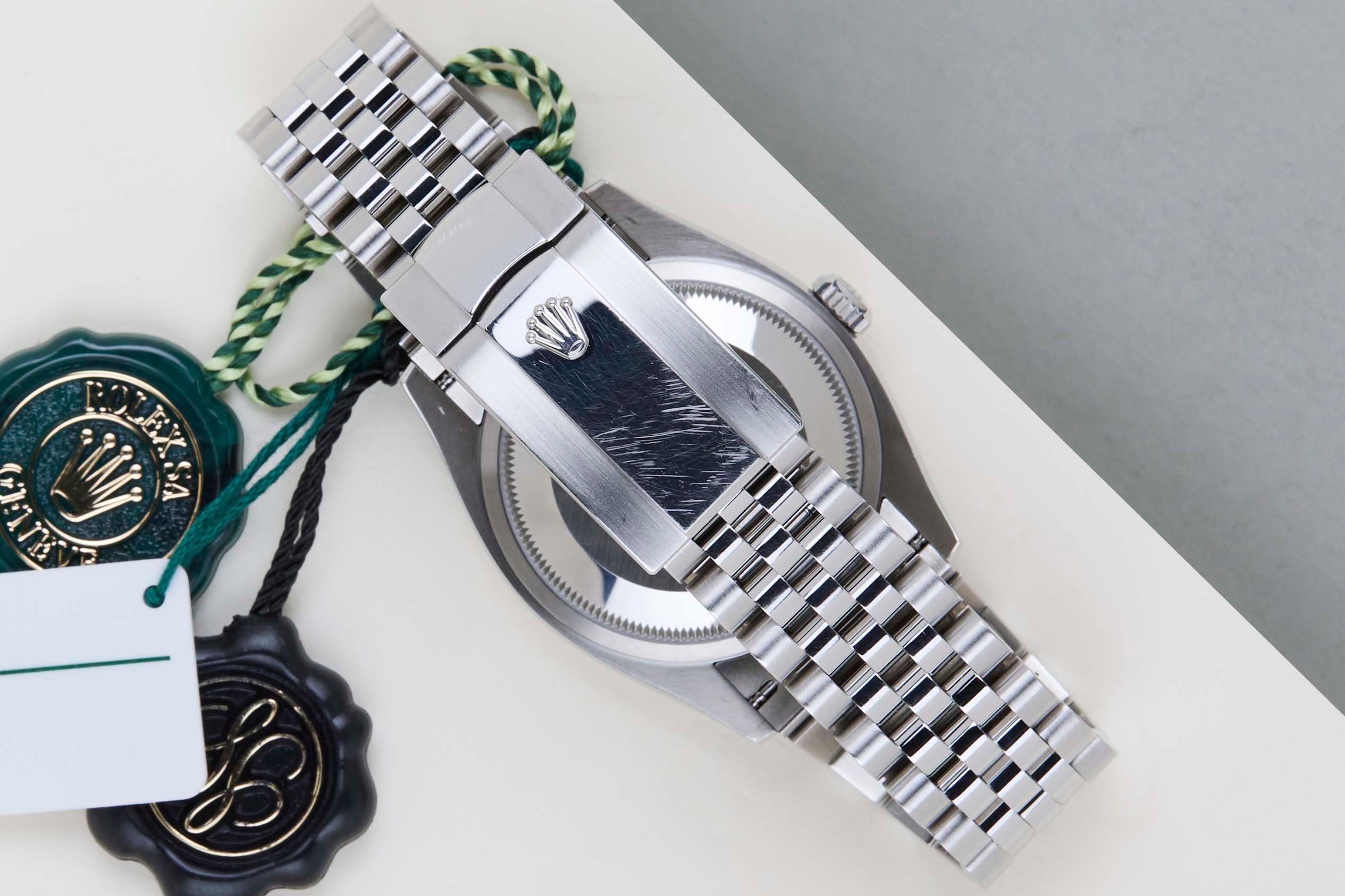 Este Rolex Datejust 'Esfera Negra - Jubilee' se vendió por primera vez en enero de 2023. Este Rolex Datejust 36 está en condición Mint y viene con la tarjeta de garantía original de Rolex y su caja. Además, el reloj aún tiene garantía mundial de Rolex hasta enero de 2028.
