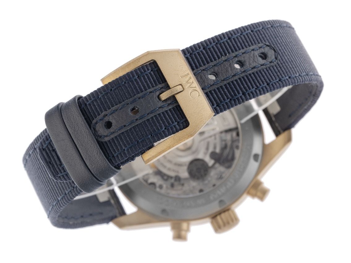 Caja de bronce satinada, diámetro de la caja sin corona 41mm, altura de la caja 14,5mm. Bezel de bronce satinada. Correa textil azul con costura decorativa, ancho de asas 20mm, hebilla de pasador con logo del fabricante en bronce. Esfera azul con números árabes y manecillas en rosé. Movimiento automático, cronógrafo, calibre IWC 69385 con 33 piedras preciosas, reserva de marcha de aproximadamente 46 horas. Indicador de horas y minutos a través de manecillas centrales, segundero pequeño con parada de segundos para ajuste preciso de la hora a las 6 en punto, indicador de fecha y día de la semana en inglés con ajuste rápido a las 3 en punto. Cristal de zafiro resistente a los arañazos. Corona atornillada con logo del fabricante. Fondo de bronce atornillado y grabado con ventana de cristal de zafiro. Peso del reloj incluyendo la correa 101g. Número de referencia: IW388109, ID: ST1160118960126H-8200, número de artículo: 10000084228. Caja original de IWC con caja exterior y documentos de garantía de enero de 2026, así como descripción, Full Set. Sin usar. Tiempo de entrega inmediato.