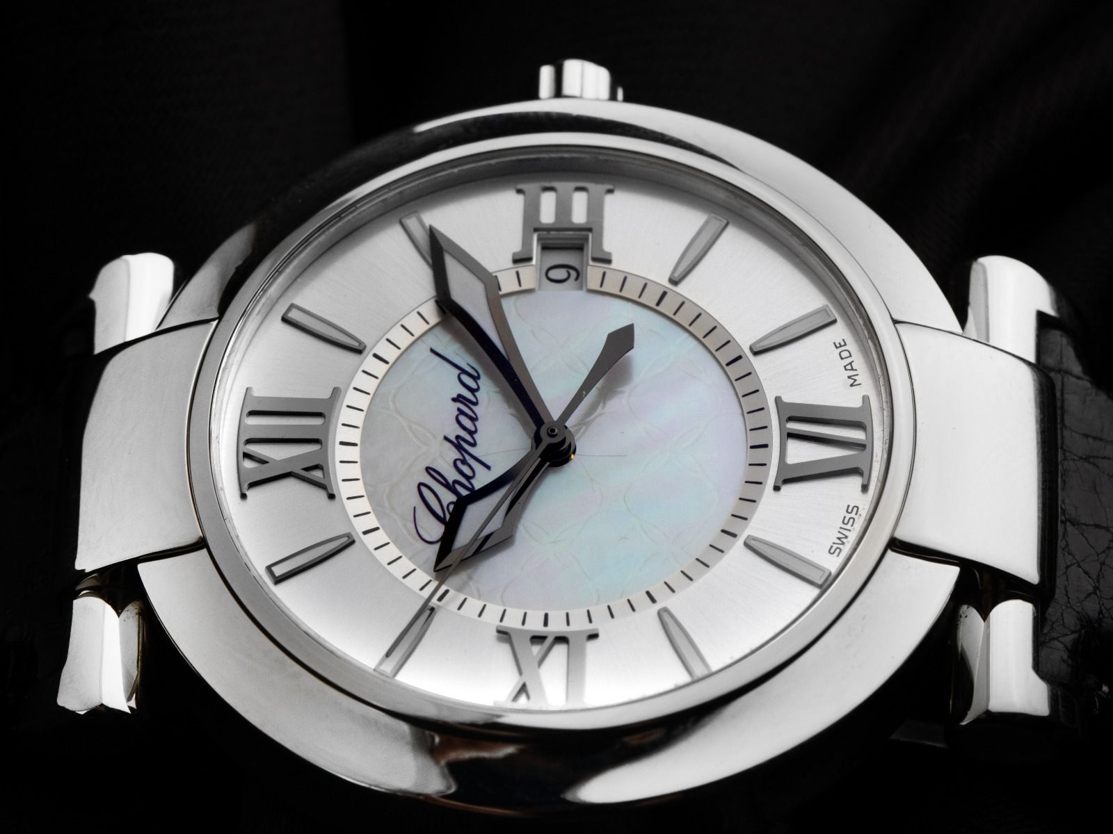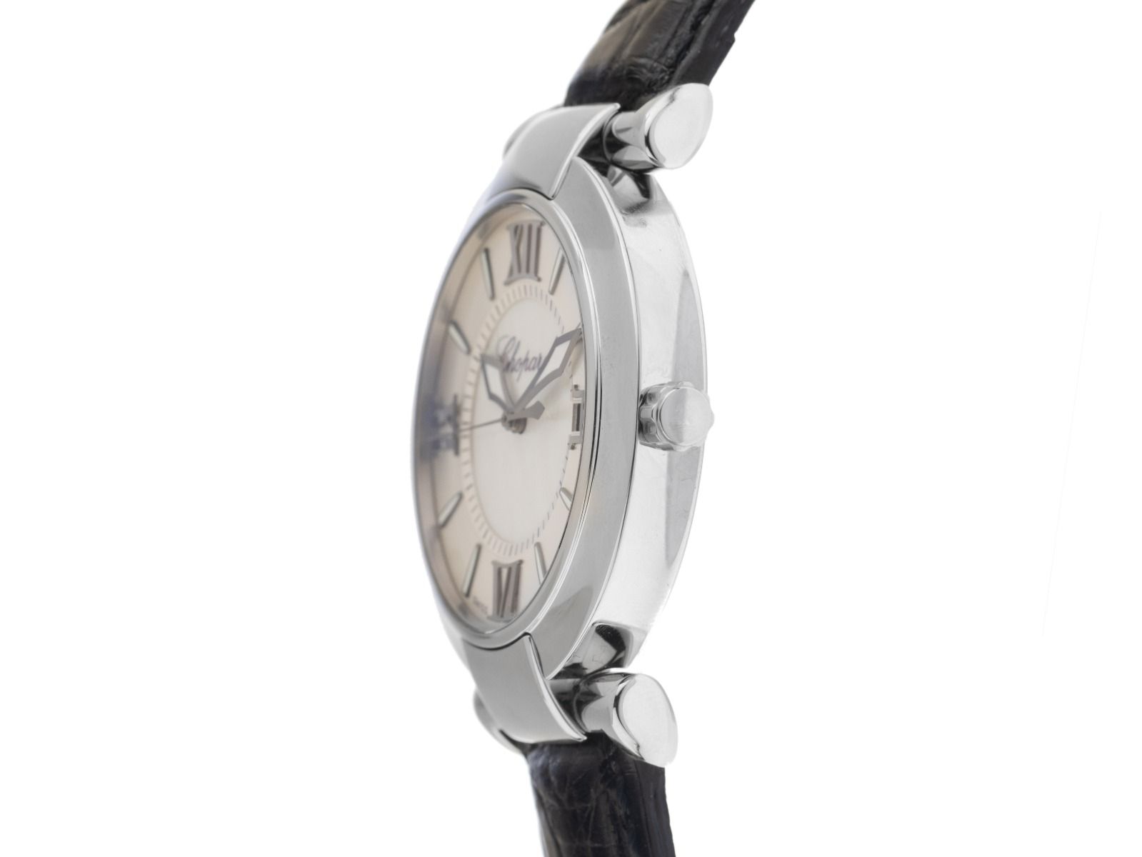 Caja de acero inoxidable pulido y satinado, diámetro de la caja sin corona 40mm, altura de la caja 10mm. Bezel de acero inoxidable liso y pulido. Pulsera Chopard de cuero de cocodrilo negro con costura decorativa, ancho de asas 20mm, cierre de pasador de acero inoxidable con logo del fabricante. Esfera de nácar con números romanos aplicados y manecillas negras. Movimiento automático, calibre de manufactura Chopard SW300. Indicación de horas, minutos y segundos a través de manecillas centrales, visualización de la fecha con ajuste rápido a las 6 en punto. Cristal de zafiro resistente a los arañazos. Corona con logo del fabricante. Fondo de acero inoxidable atornillado 8 veces y grabado. Peso del reloj incluyendo la pulsera 86g. Número de referencia: 8531, ID: P223947880126H-9800, número de artículo: 10000084225. Con control de marcha y completa restauración exterior de enero de 2026. Caja original de Chopard con caja exterior y documentos de garantía sin fecha de entrada, descripción y extracto del registro de relojes de enero de 2026, Certificado de The Watch Register / sin entrada (base de datos internacional de relojes perdidos o robados), Full Set. Como nuevo. Tiempo de entrega inmediato.