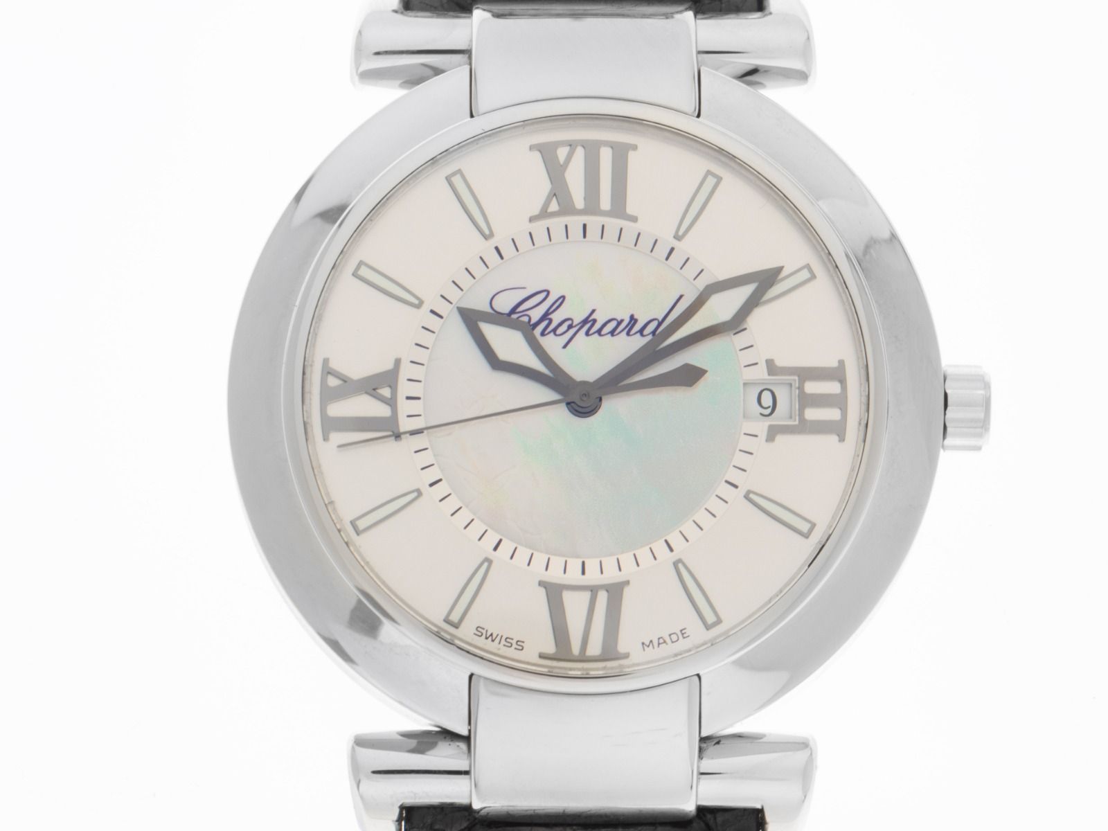 Chopard Imperial Automatik Armband KrokolederGehäuse Edelstahl poliert und satiniert, Gehäusedurchmesser ohne Krone 40mm, Gehäusehöhe 10mm. Lünette Edelstahl glatt und poliert. Chopard Armband Krokoleder schwarz mit Ziernaht, Anstoßbreite 20mm, Stiftschließe Edelstahl mit Hersteller-Logo. Zifferblatt perlmutt mit aufgesetzten römischen Ziffern und schwarzen Zeigern. Uhrwerk Automatik, Manufakturkaliber Chopard SW300. Anzeige von Stunde, Minute und Sekunde über Zeiger aus der Mitte, Datumsanzeige mit Schnellverstellung bei 6 Uhr. Saphirglas kratzfest. Krone mit Hersteller-Logo. Boden Edelstahl 8-fach verschraubt und graviert. Gewicht der Uhr inklusive Armband 86g. Referenznummer: 8531, ID: P223947880126H-9800, Artikelnummer: 10000084225. Mit Gangkontrolle und kompletter äußerlicher Aufarbeitung von Januar 2026. Original Chopard Box mit Umkarton und Garantie Papiere ohne Datumseintrag, Beschreibung sowie Watchregister Auszug von Januar 2026, The Watch Register Zertifikat / ohne Eintrag (Internationale Datenbank für verlorene oder gestohlene Uhren), Full Set. Wie Neu. Lieferzeit sofort.