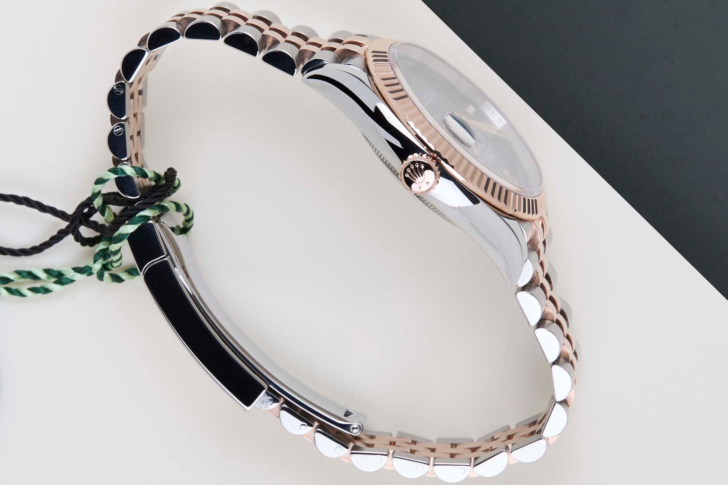 Este Rolex Datejust 'Esfera Wimbledon - Jubilee' se vendió por primera vez en julio de 2021. Este Datejust está hecho de una combinación de oro Everose de 18k y acero inoxidable, y está equipado con un brazalete Jubilee que cuenta con el Easylink. Esta extensión permite al usuario alargar o acortar el brazalete en 5 milímetros, mejorando la comodidad y usabilidad del reloj.