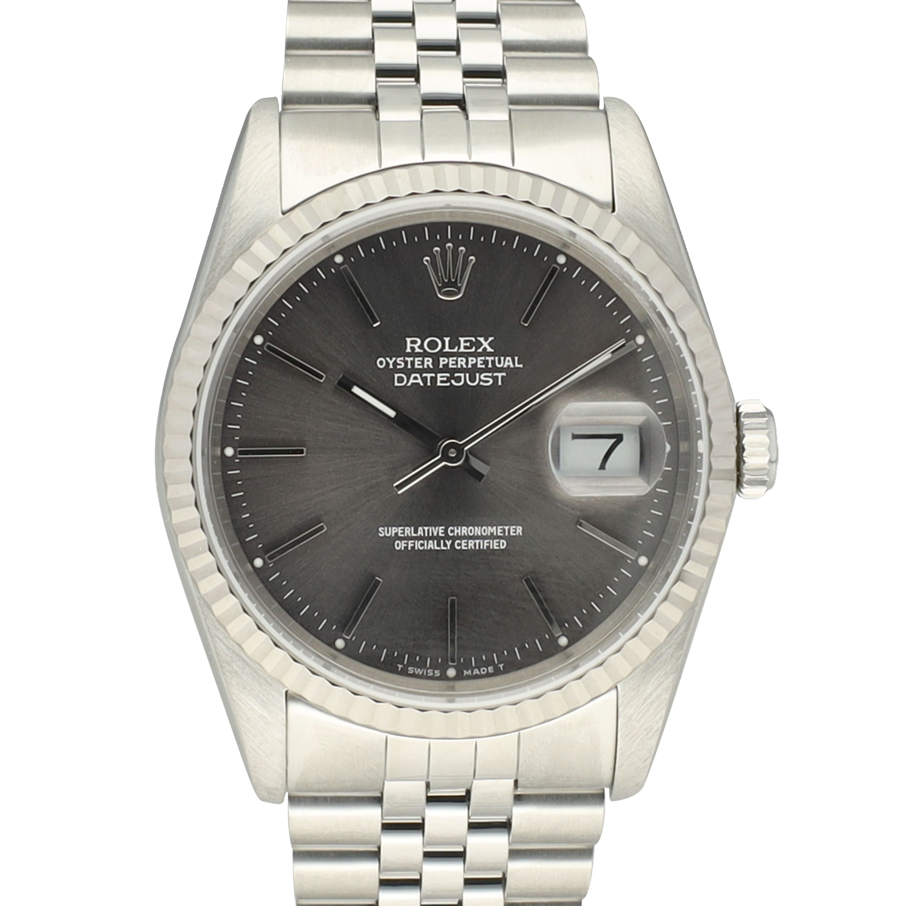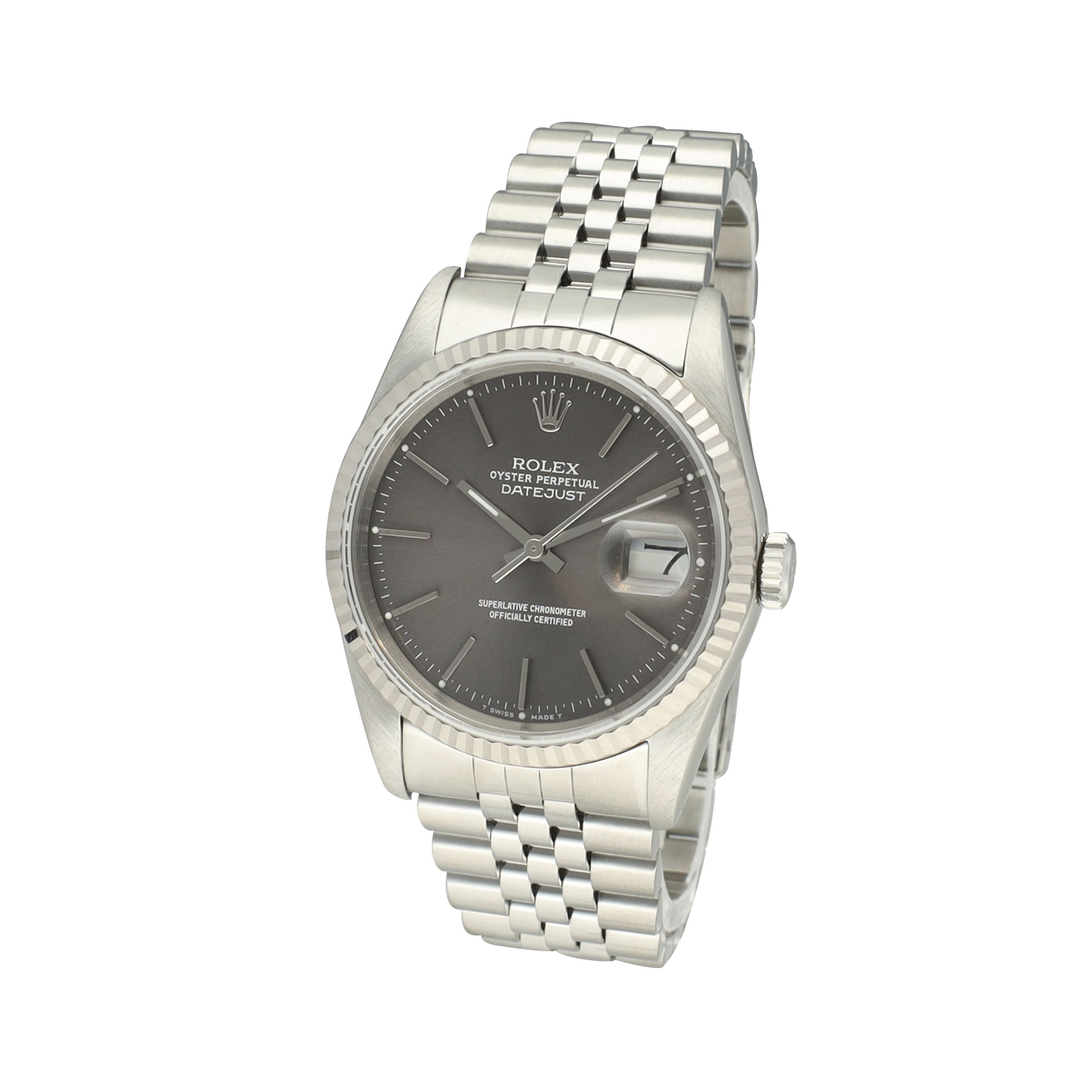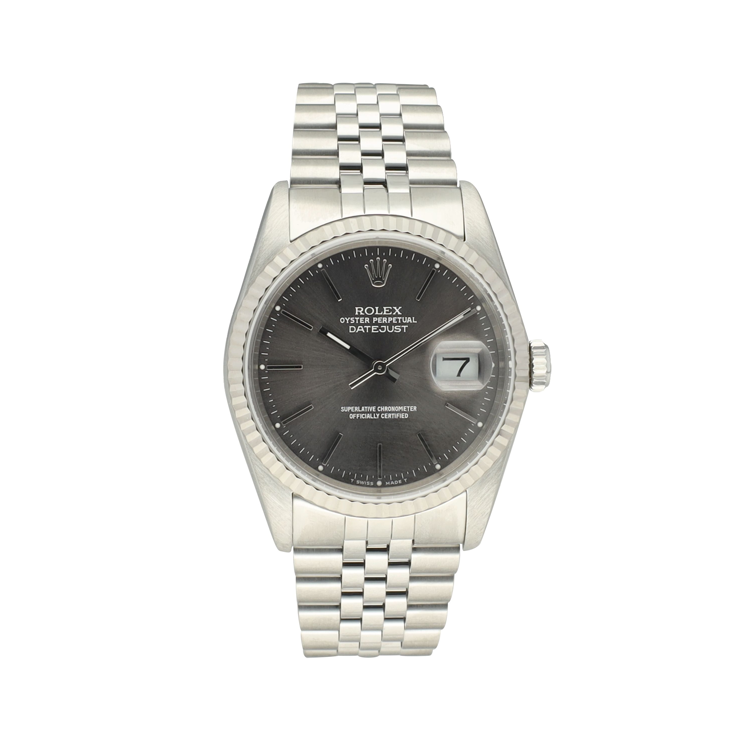 The 36 mm case is crafted from durable Oystersteel and complemented by an 18-carat white gold fluted bezel, catching the light beautifully while maintaining a sophisticated presence. Fitted with the iconic Jubilee bracelet, this Datejust delivers exceptional comfort on the wrist and enhances the classic character that has defined the model for generations.