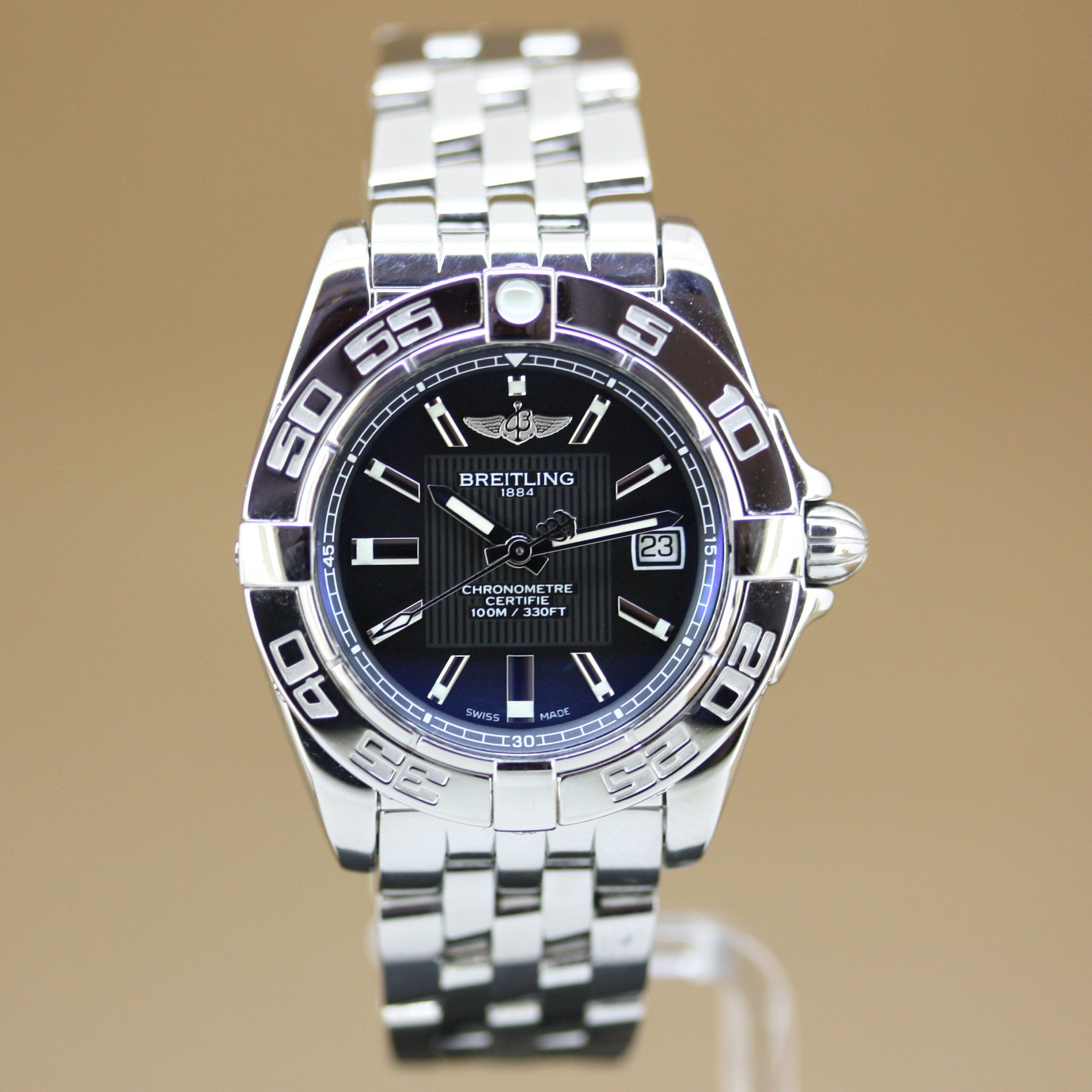 a Breitling Galactic 32 Lady (Cockpit Lady), year 2012, in very good condition.This elegant ladies’ watch features a stainless-steel case and a black dial, offering a timeless and sporty yet refined appearance.Fitted with a stainless-steel Pilot bracelet with folding clasp for excellent comfort and durability.Powered by a Quartz movement with date function, reliable and ideal for everyday wear.