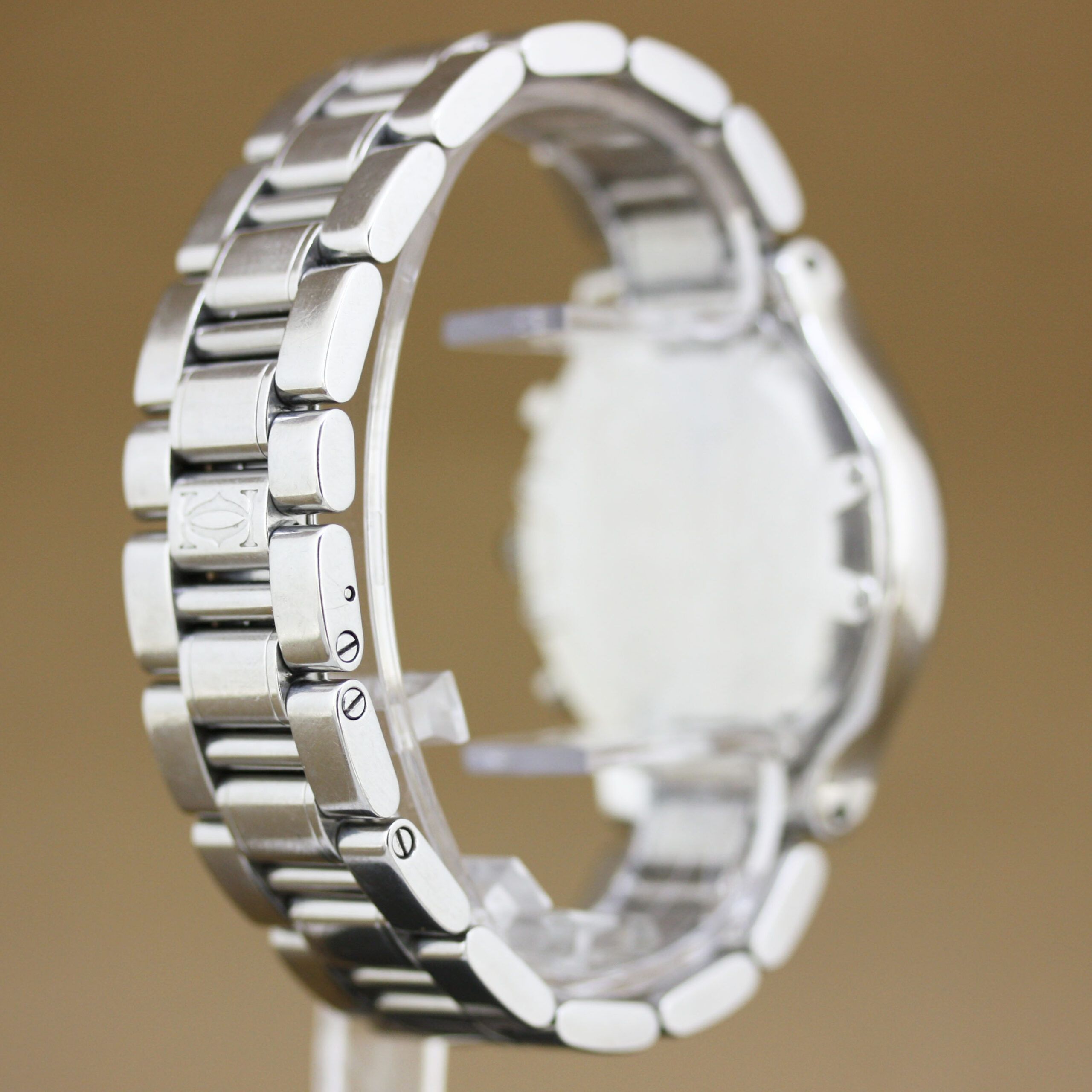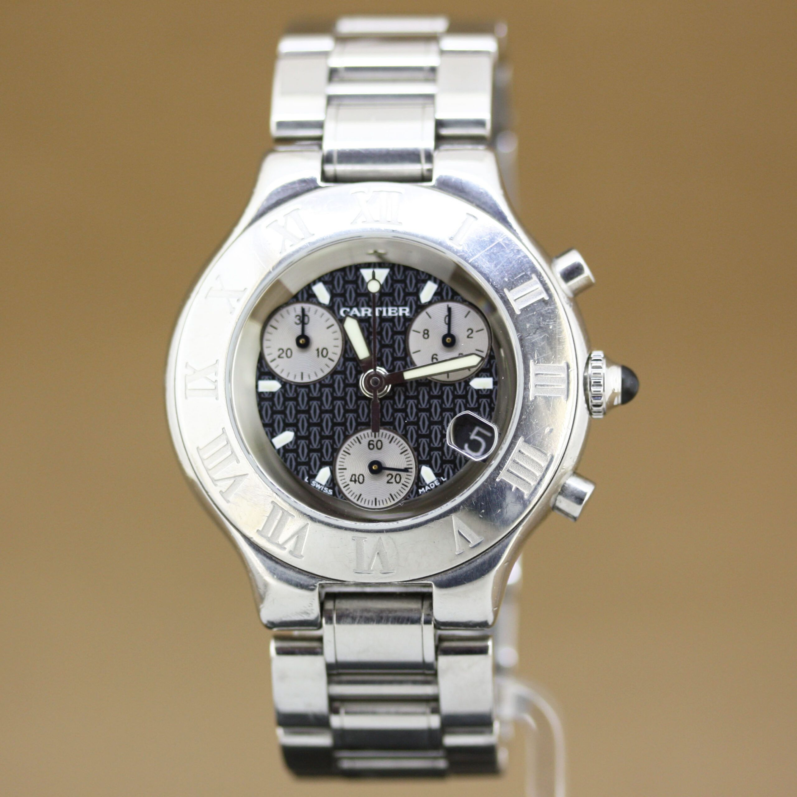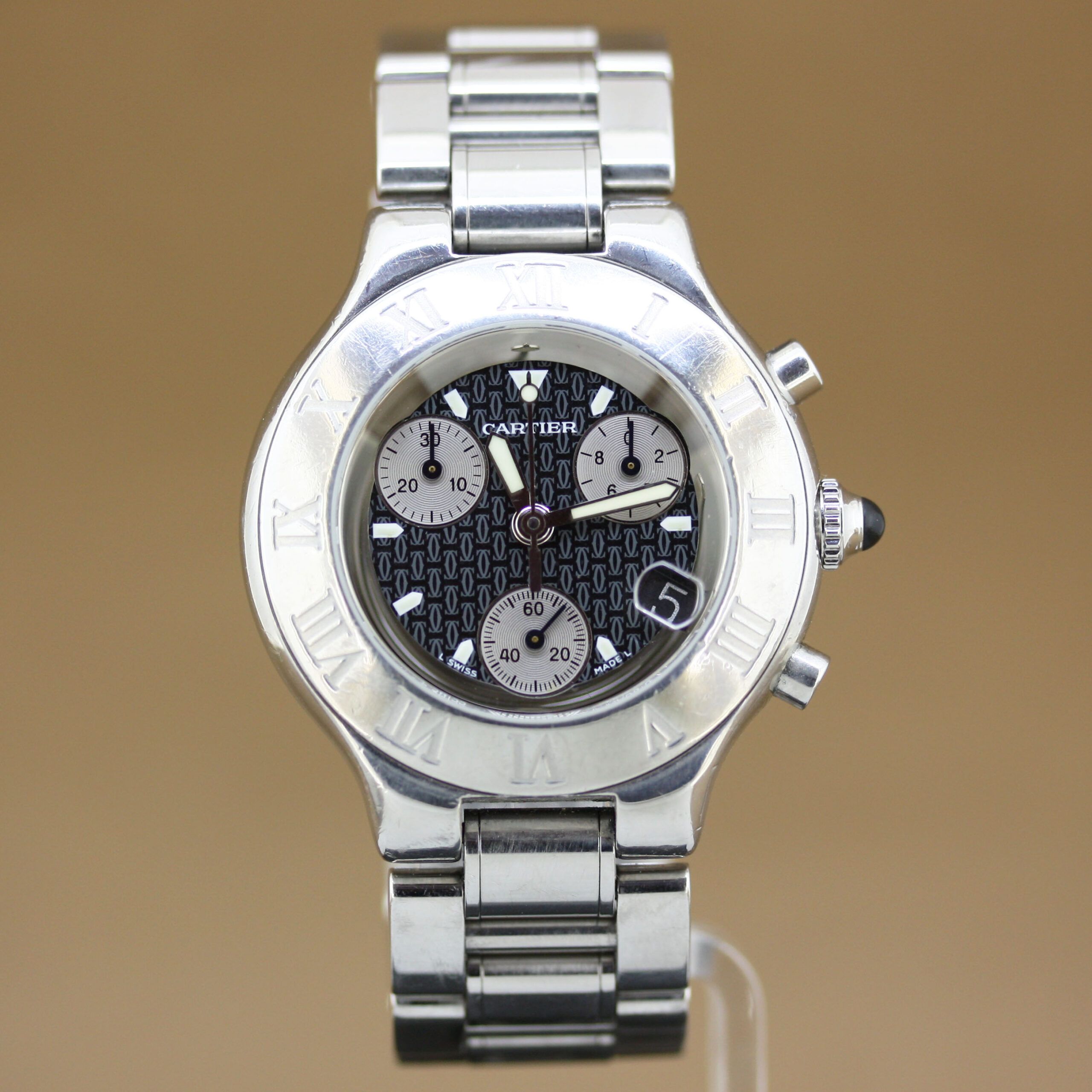 a Cartier 21 Chronoscaph, reference 2424, year 2006, in very good condition.This sporty yet elegant model features a stainless-steel case with a steel bezel and a black dial, offering a strong and timeless appearance.The watch is fitted with a stainless-steel bracelet with concealed folding clasp for a clean and comfortable fit.Powered by a Quartz movement with date and chronograph functions, reliable and practical for everyday wear.