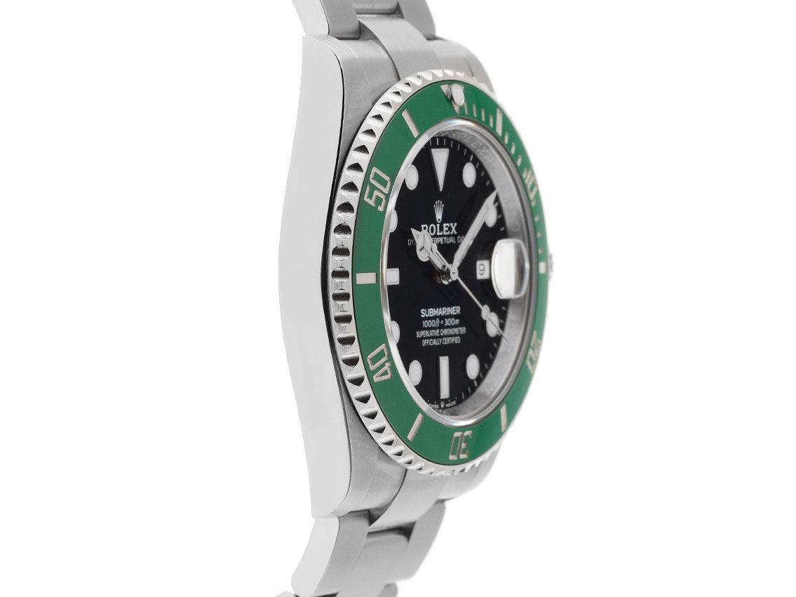 Caja de acero inoxidable pulido y satinado, diámetro de la caja sin corona 41mm, altura de la caja 12,4mm. Bezel de acero inoxidable estriado con inserto de cerámica verde, escala de 60 minutos y punto luminoso, giratorio unidireccional. Pulsera Oyster de acero inoxidable pulido y satinado, cierre de seguridad Oysterlock con sistema de extensión Rolex Glidelock y logo del fabricante. Esfera negra con índices y puntos luminosos en oro blanco aplicados, así como manecillas luminosas en oro blanco. Movimiento automático, cronómetro con certificado, calibre de manufactura Rolex 3235 con 31 rubíes, reserva de marcha de aproximadamente 70 horas. Indicación de hora, minuto y segundo a través de manecillas centrales con parada de segundero para un ajuste preciso de la hora, visualización de la fecha con ajuste rápido bajo lupa a las 3 en punto. Cristal de zafiro resistente a los arañazos. Corona atornillada con protección lateral y logo del fabricante. Fondo de acero atornillado. Peso del reloj incluyendo la pulsera 158g, longitud de la pulsera incluyendo la caja 180mm. Impermeable hasta 30 ATM. Número de referencia: 126610LV, número de caja: 22E0SXXX, ID: KC1754260001225H-16800/11150, número de artículo: 10000083758. Con control de marcha y reacondicionamiento exterior completo de diciembre de 2025. Caja original de Rolex con caja exterior y documentos de garantía de noviembre de 2020, nueva tarjeta de garantía de Rolex sin código de país, así como estuche de cuero, sello de cronómetro de Rolex y extracto del registro de relojes de diciembre de 2025, certificado de The Watch Register / sin entrada (base de datos internacional de relojes perdidos o robados), set completo. Inversión con potencial de aumento de valor. Como nuevo. Tiempo de entrega inmediato.