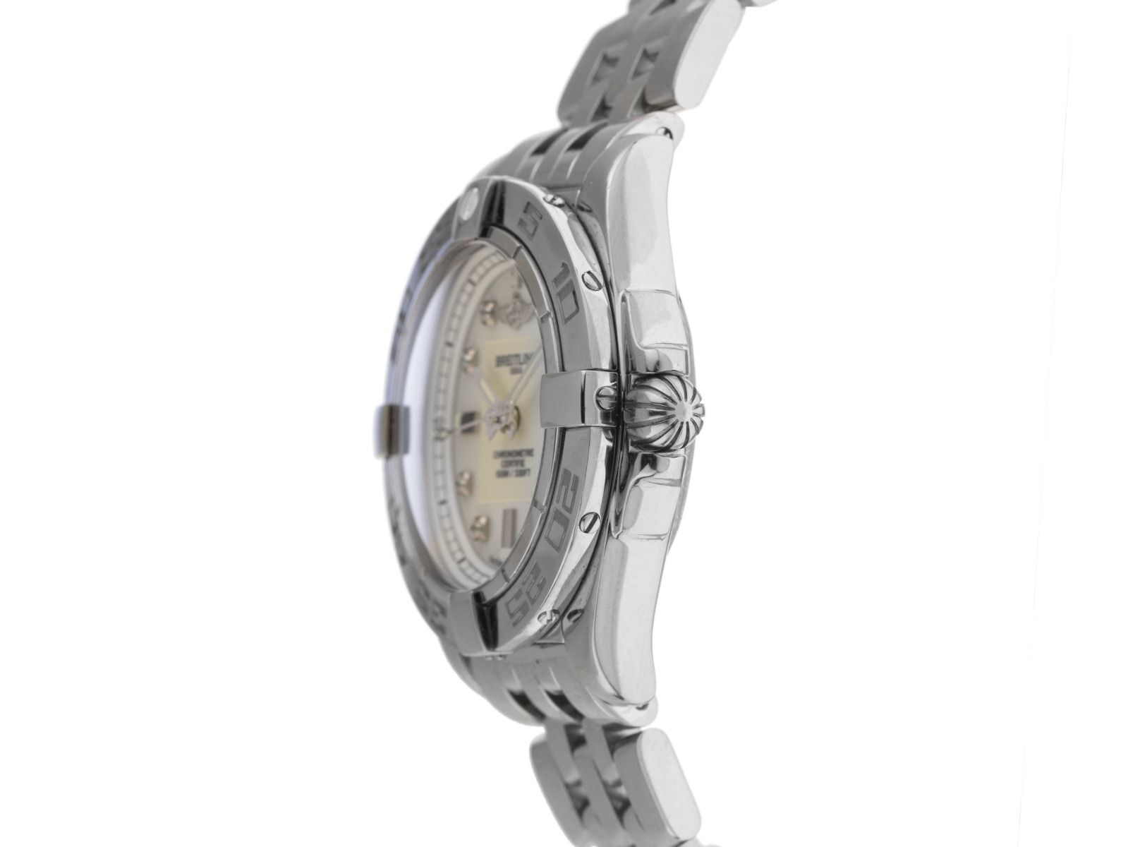 Breitling Galactic Stahl Quarz Armband StahlGehäuse Edelstahl poliert, Gehäusedurchmesser ohne Krone 30mm, Gehäusehöhe 11,0mm. Lünette Edelstahl poliert mit 60-Minuten Einteilung, einseitig drehbar. Breitling Pilot Armband Edelstahl poliert, Sicherheitsfaltschließe Edelstahl mit Hersteller-Logo. Zifferblatt perlmutt mit Diamantindexen, aufgesetzten Edelstahl Indexen sowie Edelstahl Zeigern. Uhrwerk quarzgesteuert, Kaliber Breitling B7 mit 7 Edelsteinen. Anzeige von Stunde, Minute und Sekunde über Zeiger aus der Mitte mit Sekundenstopp zur sekundengenauen Einstellung der Uhrzeit, Datumsanzeige mit Schnellverstellung bei 3 Uhr. Saphirglas kratzfest und gewölbt. Krone mit Flankenschutz. Boden Edelstahl verschraubt und graviert. Gewicht der Uhr inklusive Armband 78g, Länge des Armbandes inklusive Gehäuse 155mm. Referenznummer: A71365, Gehäusenummer: 1295XXX, ID: P227430000126H-5100, Artikelnummer: 10000084271. Mit Gangkontrolle und kompletter äußerlicher Aufarbeitung von Januar 2026. Original Breitling Box mit Umkarton und Garantie Papiere von August 2013, Beschreibung sowie Watchregister Auszug von Januar 2026, The Watch Register Zertifikat / ohne Eintrag (Internationale Datenbank für verlorene oder gestohlene Uhren), inkl. Erstkaufrechnung, Full Set. Sehr guter Zustand. Superschnäppchen, sehr seltenes Sammlerstück. Lieferzeit sofort.