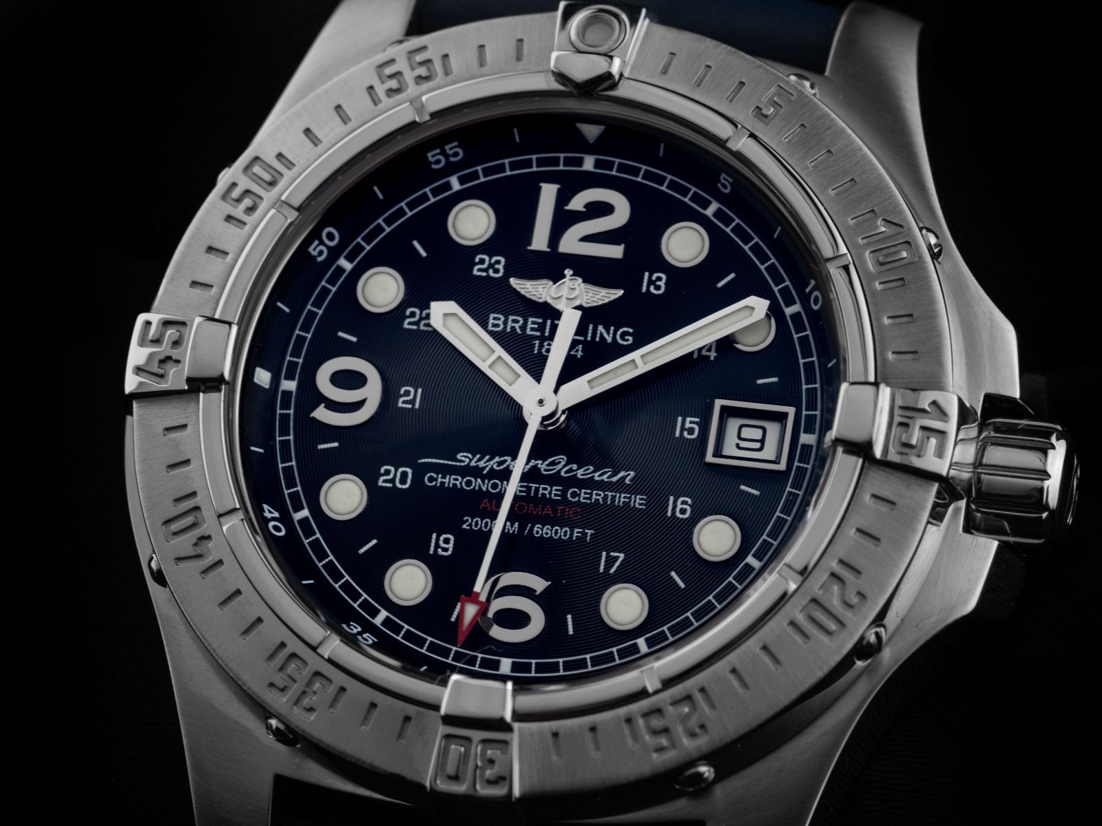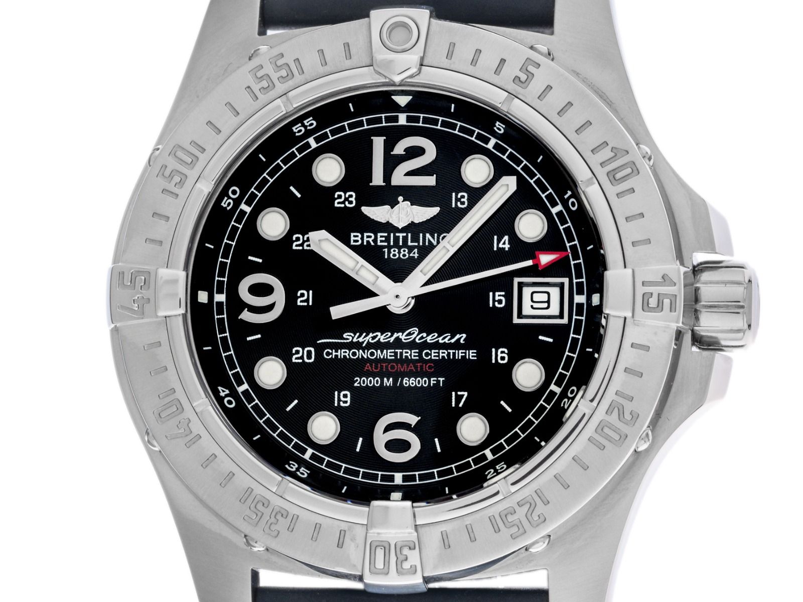 Breitling Superocean Stahl Automatik Chronometer Armband KautschukGehäuse Edelstahl poliert, Gehäusedurchmesser ohne Krone 44mm, Gehäusehöhe 16,2mm. Lünette Edelstahl poliert und satiniert mit 60-Minuten Skala, einseitig drehbar. Armband Kautschuk blau, Anstoßbreite 22mm, Stiftschließe Edelstahl mit Hersteller-Logo. Zifferblatt schwarz mit arabischen Ziffern und Edelstahl Zeigern. Uhrwerk Automatik, Chronometer mit Zeugnis, Kaliber Breitling 17 mit 25 Edelsteinen. Anzeige von Stunde, Minute und Sekunde über Zeiger aus der Mitte mit Sekundenstopp zur sekundengenauen Einstellung der Uhrzeit, Datumsanzeige mit Schnellverstellung bei 3 Uhr. Saphirglas kratzfest und gewölbt. Krone mit Flankenschutz und Hersteller-Logo. Boden Edelstahl verschraubt und graviert. Gewicht der Uhr inklusive Armband 161g. Referenznummer: A17390-3014, Gehäusenummer: 1170XXX, ID: P225522000126H-4400, Artikelnummer: 10000084244. Mit Gangkontrolle und kompletter äußerlicher Aufarbeitung von Januar 2026. Original Breitling Box mit Umkarton und Garantie Papiere von März 2008 sowie Beschreibung und Watchregister Auszug von Januar 2026, The Watch Register Zertifikat / ohne Eintrag (Internationale Datenbank für verlorene oder gestohlene Uhren), Full Set. Superschnäppchen, Kapitalanlage mit Wertsteigerungspotential. Wie Neu. Lieferzeit sofort.