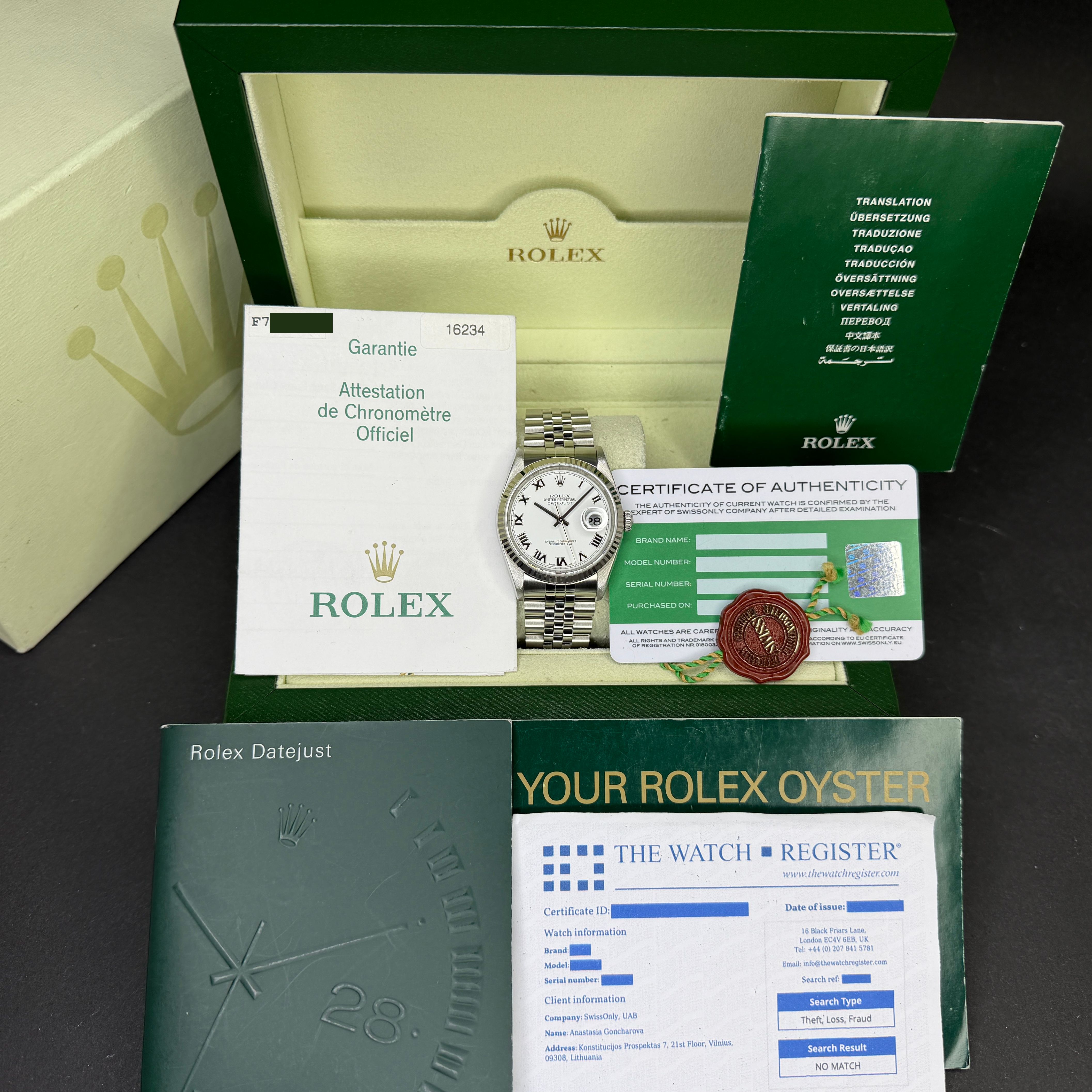 Rolex Datejust, 16234, 36mm, 2004, Steel, White Roman dial, Fullset, 1y warranty
