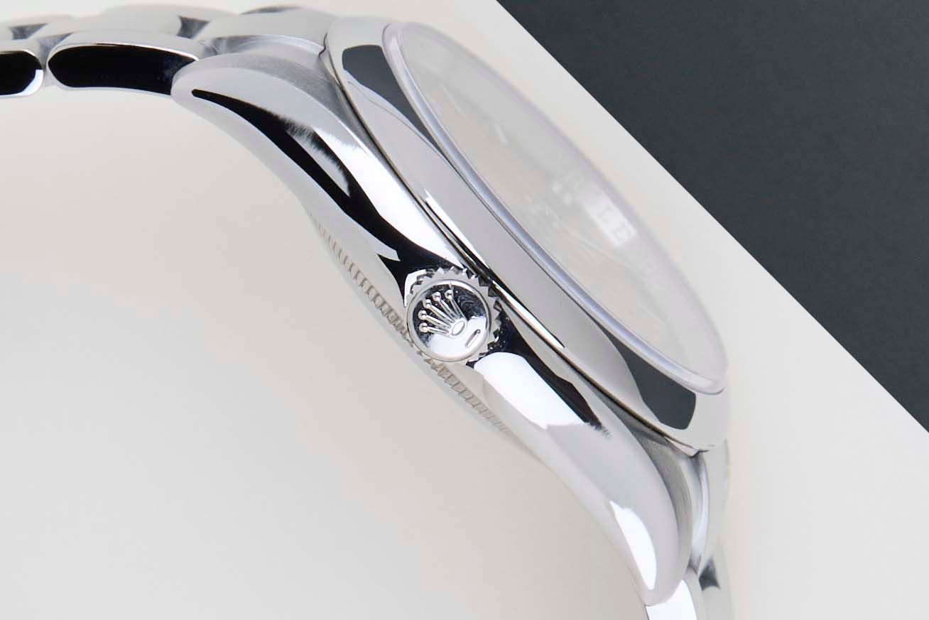 El Rolex Oyster Perpetual fue presentado por primera vez por Rolex en la década de 1930. Se caracteriza por su caja Oyster resistente al agua y su movimiento Perpetual de cuerda automática. El Rolex Oyster Perpetual es una pieza de tiempo sencilla, pero elegante, que es adecuada tanto para ocasiones casuales como formales. Este Rolex Oyster Perpetual con ‘Esfera de Uva Blanca’ se vendió por primera vez en febrero de 2018. El reloj está completamente hecho de acero inoxidable. Rolex utiliza 904L en sus relojes de acero, que es una superaleación extremadamente resistente y altamente pulible. Este increíble Rolex Oyster Perpetual está en condiciones asombrosas y viene con la Tarjeta de Garantía original de Rolex, la tarjeta de servicio y la caja. Además, el reloj ha sido revisado por nuestro relojero, por lo que incluye un año de garantía de Steiner.