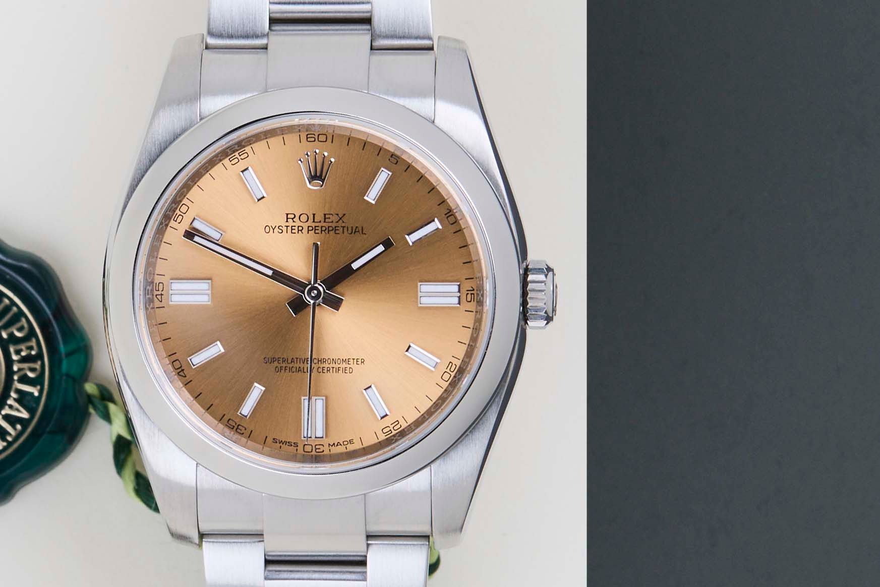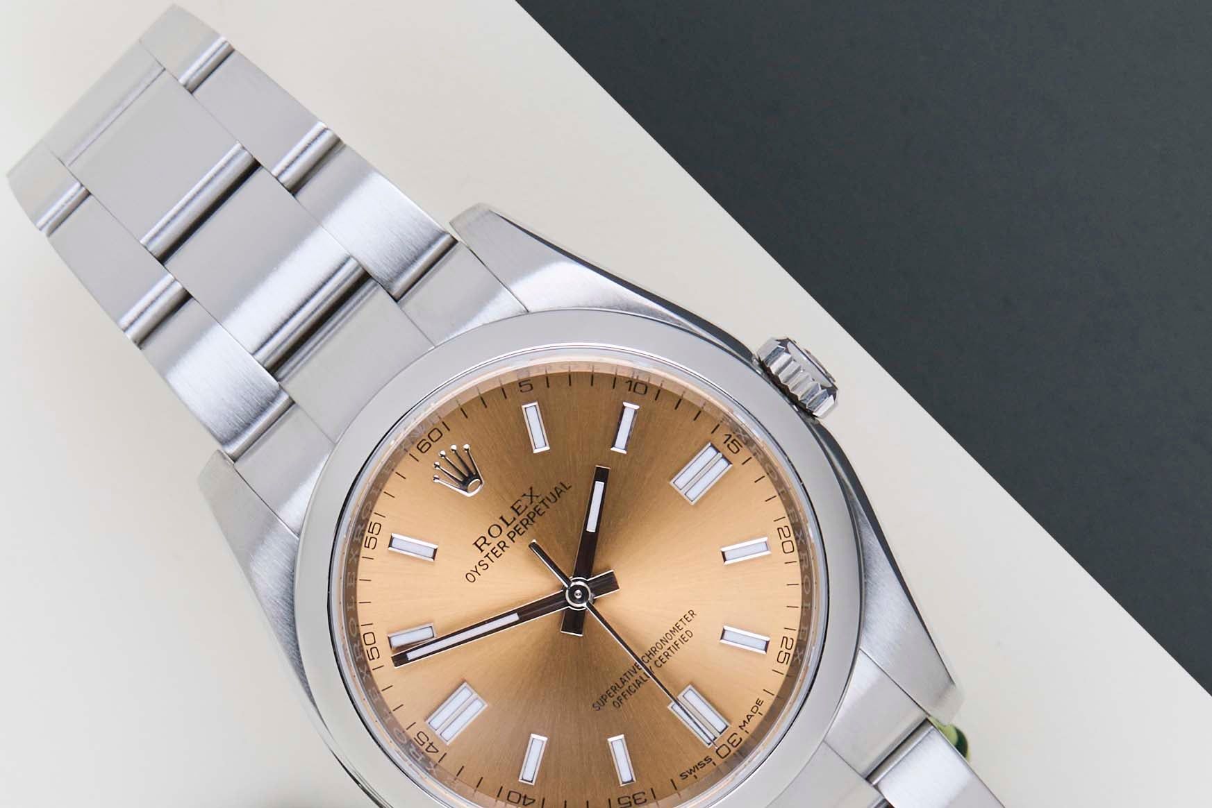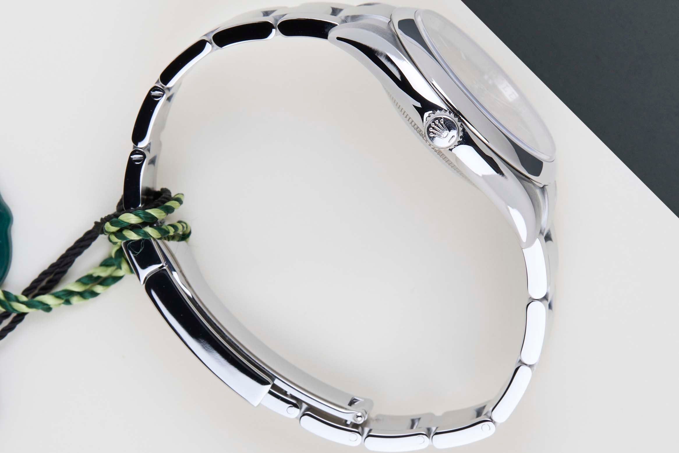 Full Set The Rolex Oyster Perpetual was first introduced by Rolex in the 1930s. It is characterized by its water-resistant Oyster case and self-winding Perpetual movement. The Rolex Oyster Perpetual a simple, yet elegant timepiece that is suitable for both casual and formal wear. This Rolex Oyster Perpetual ‘White Grape Dial’ was sold for the first time in February 2018. The watch is fully made out of stainless steel. Rolex uses 904L in its steel watches, which is an extremely resistant and highly polishable superalloy. This amazing Rolex Oyster Perpetual is in amazing condition and comes with the original Rolex Warranty Card, Service card and Box. Furthermore, the watch has been serviced by our watchmaker, and therefore it comes with One Year of Steiner Warranty.