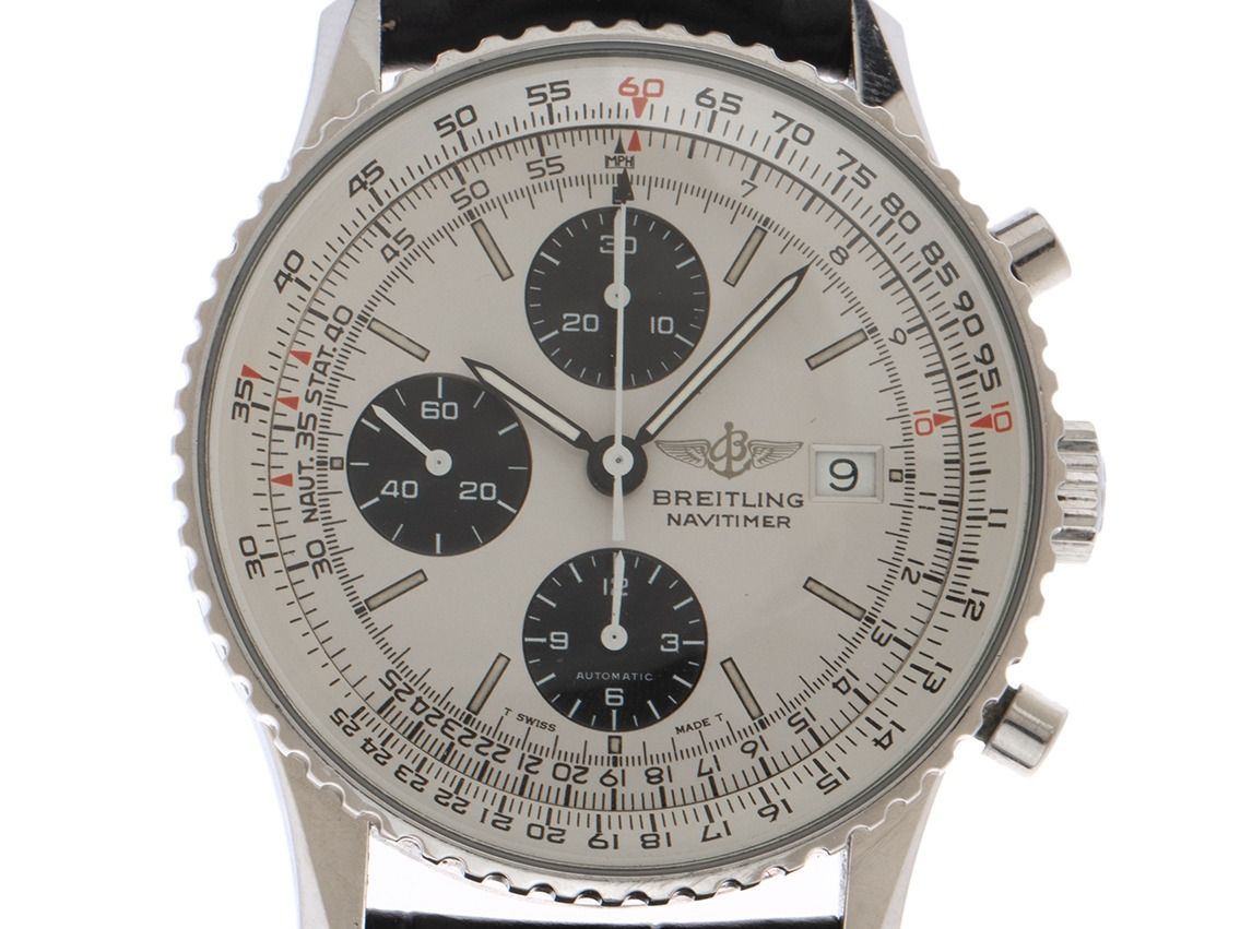 Breitling Old Navitimer Stahl Automatik Chronograph Armband KrokolederGehäuse Edelstahl poliert, Gehäusedurchmesser ohne Krone 41mm, Gehäusehöhe 14,2mm. Lünette Edelstahl gerädelt mit unterglas Rechenschieber, beidseitig drehbar. Armband Krokoleder schwarz mit weißer Ziernaht, Anstoßbreite 22mm, Stiftschließe Edelstahl mit Hersteller-Logo. Zifferblatt silberfarben mit schwarzen Hilfszifferblättern und schwarzen Zeigern. Uhrwerk Automatik, Chronograph, Kaliber Breitling. Anzeige von Stunde und Minute über Zeiger aus der Mitte, kleine Sekunde mit Sekundenstopp zur sekundengenauen Einstellung der Uhrzeit bei 9 Uhr, Datumsanzeige mit Schnellverstellung bei 3 Uhr. Saphirglas kratzfest und gewölbt. Krone mit Hersteller-Logo. Boden Edelstahl verschraubt und graviert. Gewicht der Uhr inklusive Armband 85g. Referenznummer: 81610, Gehäusenummer: 1XXX, Baujahr: 2005, ID: P229149000126H-6800, Artikelnummer: 10000084297. Mit Gangkontrolle und kompletter äußerlicher Aufarbeitung von Januar 2026. Original Breitling Service Box und und Watchregister Auszug von Januar 2026, The Watch Register Zertifikat / ohne Eintrag (Internationale Datenbank für verlorene oder gestohlene Uhren. Superschnäppchen, Kapitalanlage mit Wertsteigerungspotential, sehr seltenes Sammlerstück. Sehr guter Zustand. Lieferzeit sofort.
