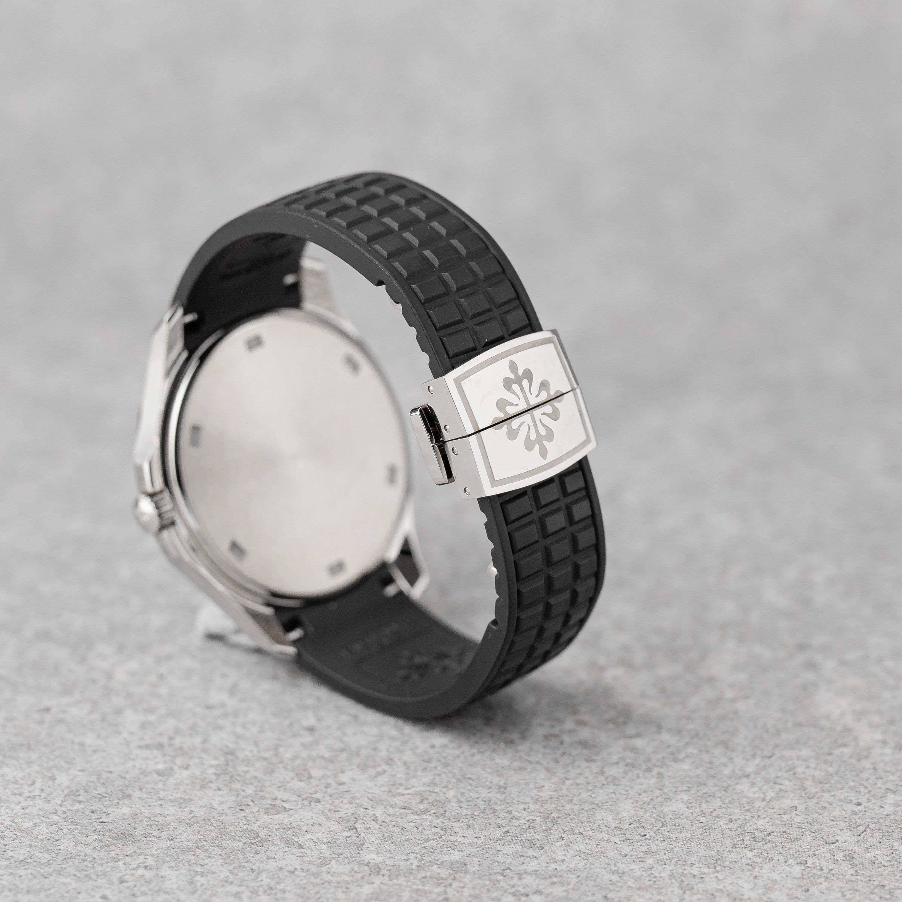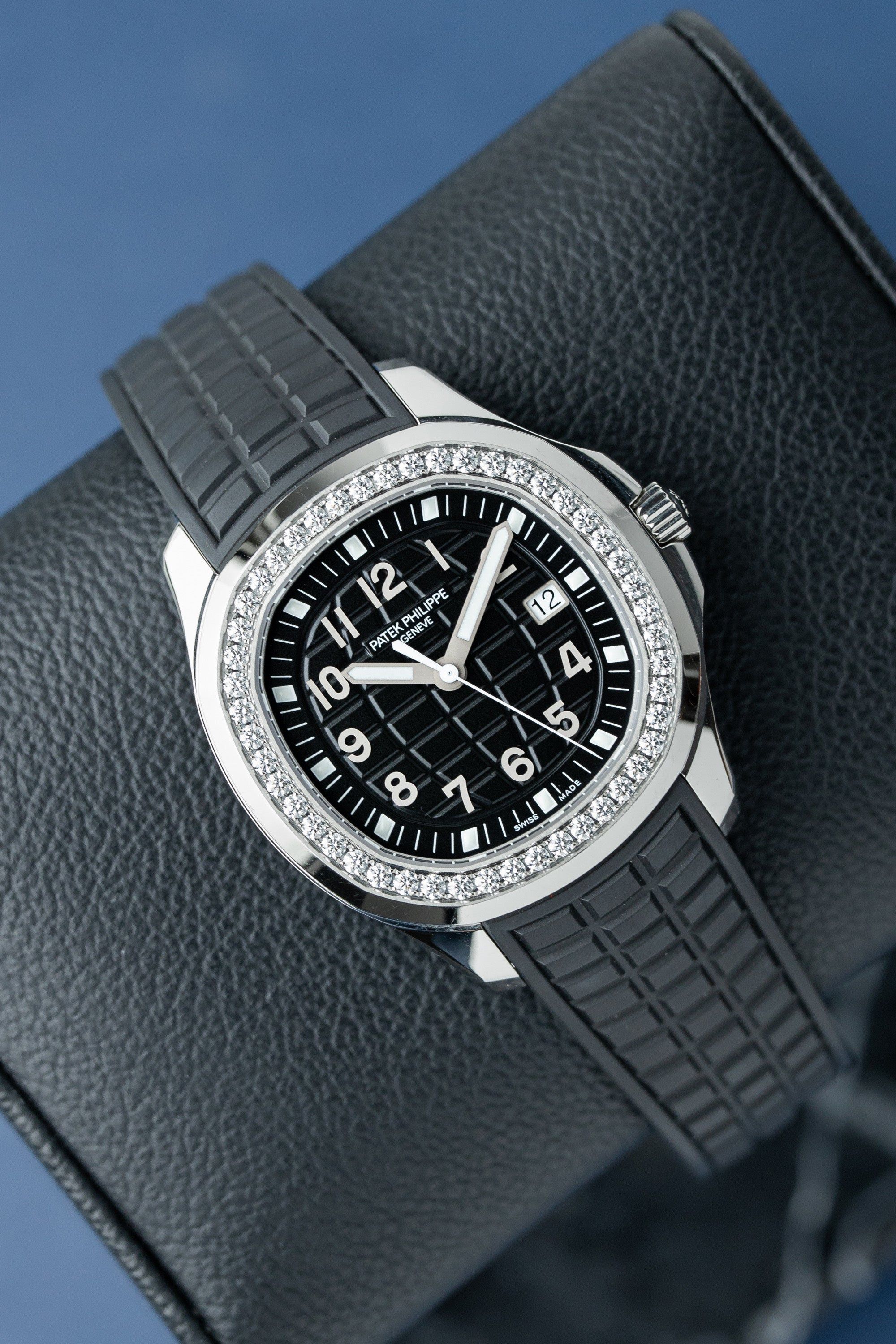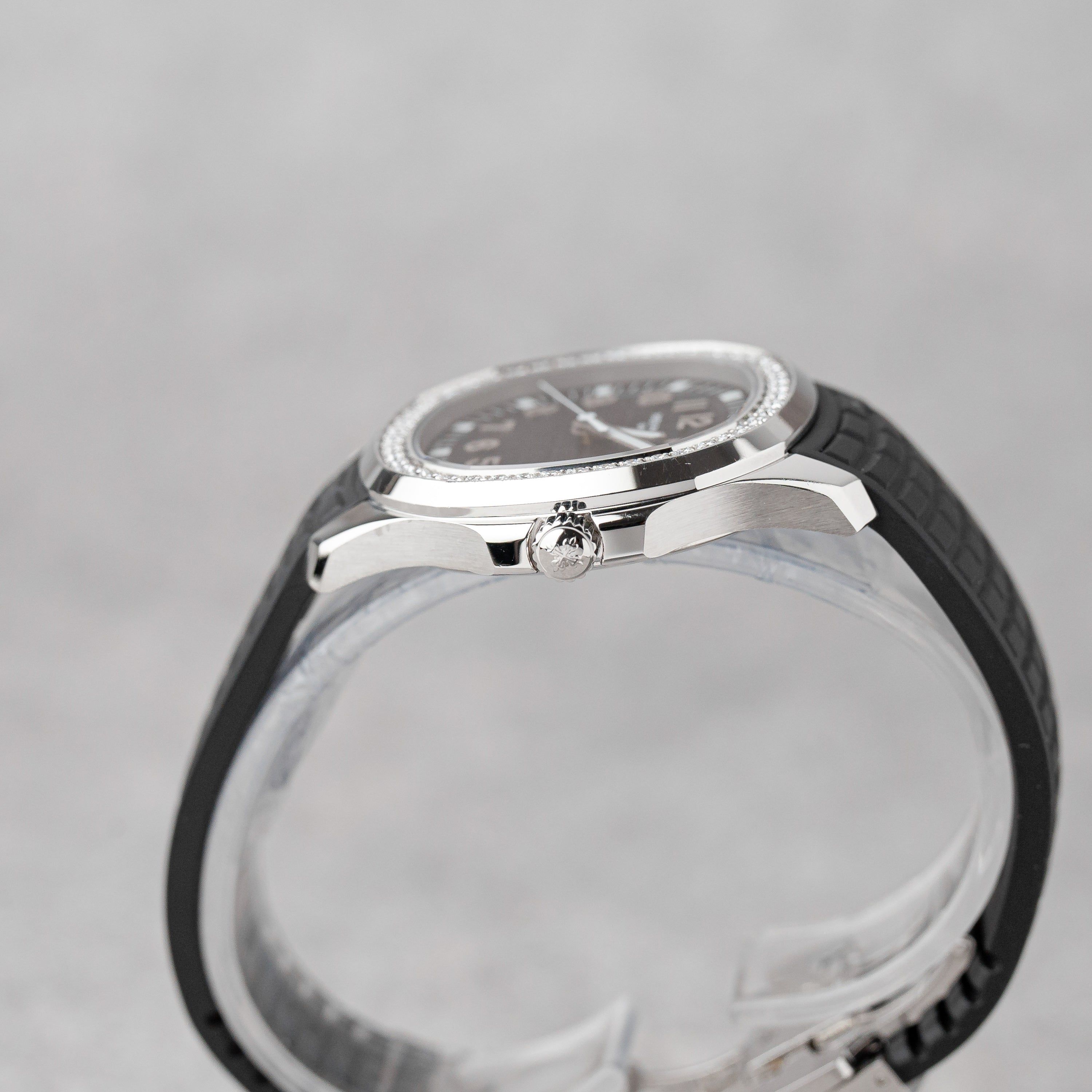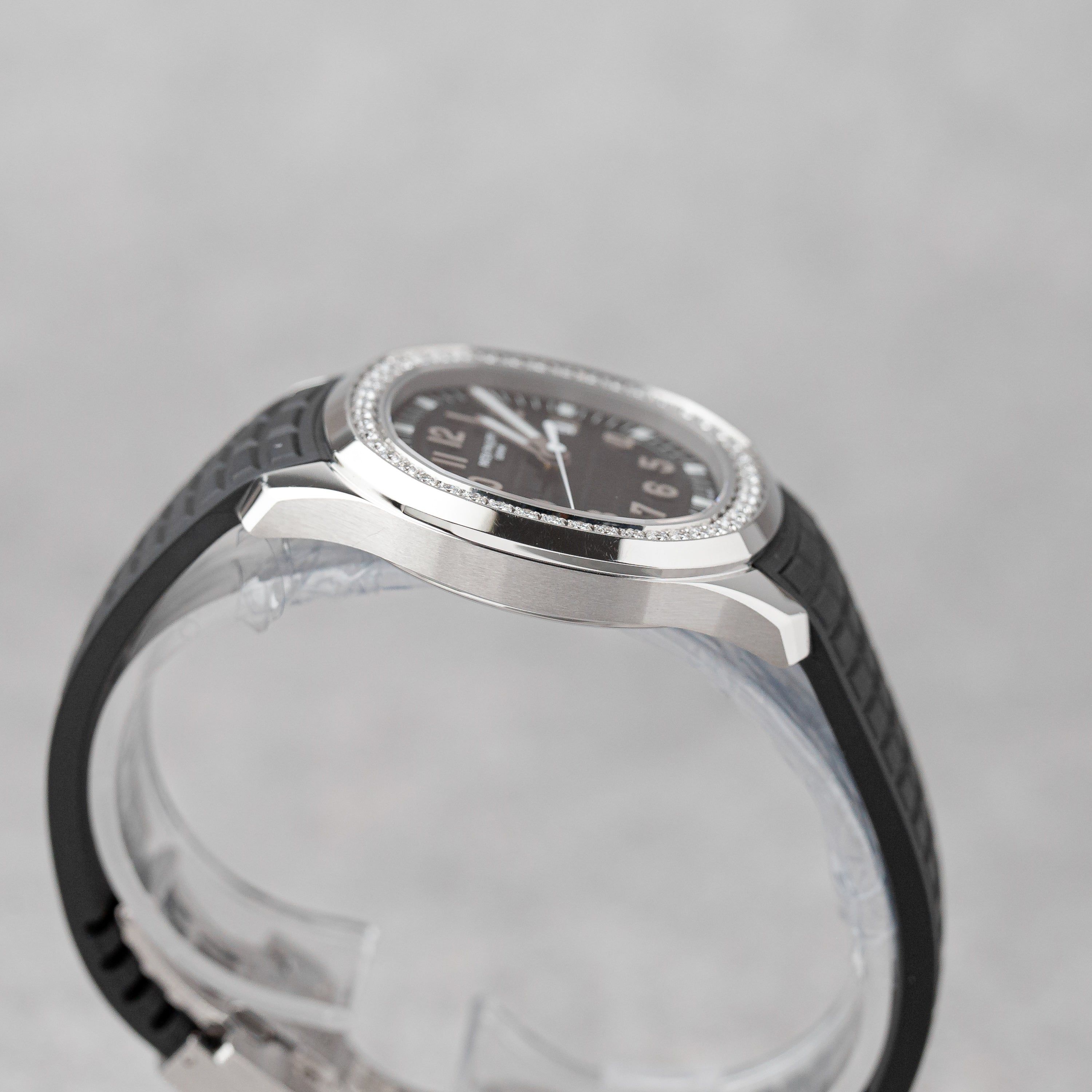 Elegant and sporty, this Aquanaut Luce features a sleek black dial complemented by a factory diamond-set bezel, adding a refined touch of luxury to its stainless steel case. Offered as a Full Set, the watch is unpolished, used but in very good condition, with light hairlines consistent with careful wear. The current strap has been cut, and we can offer a new strap to the buyer. Fully functional and carefully inspected, it comes with 12 months of guarantee from us. A sophisticated Aquanaut combining elegance, sportiness, and unmistakable Patek Philippe craftsmanship.