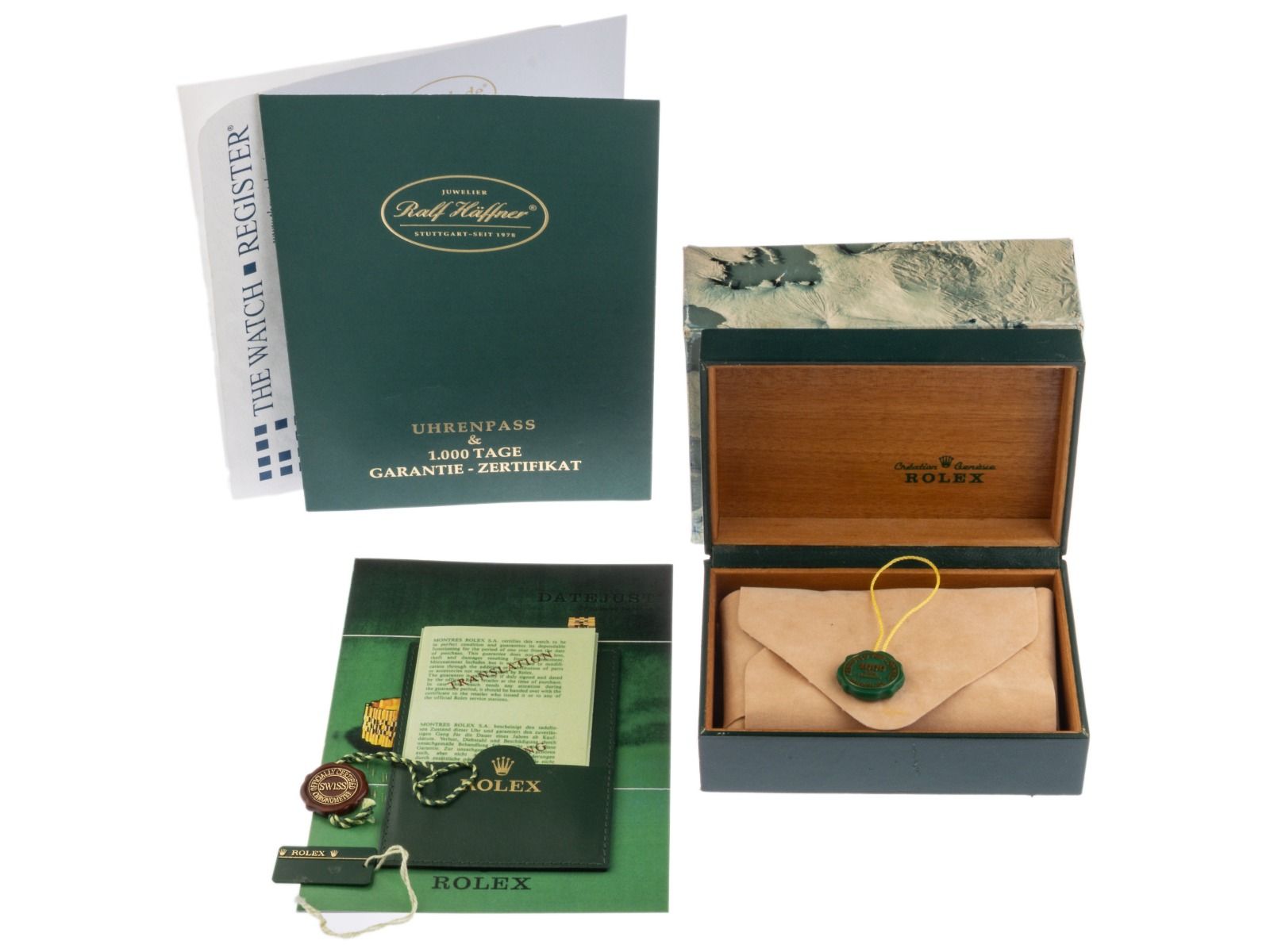 Inklusive certified pre owned Siegel / Uhrenpass mit einem Farbbild, der genauen Beschreibung sowie dem Wiederbeschaffungswert der Uhr über 8500,-€ und 1000 Tage Garantie ab Kaufdatum.