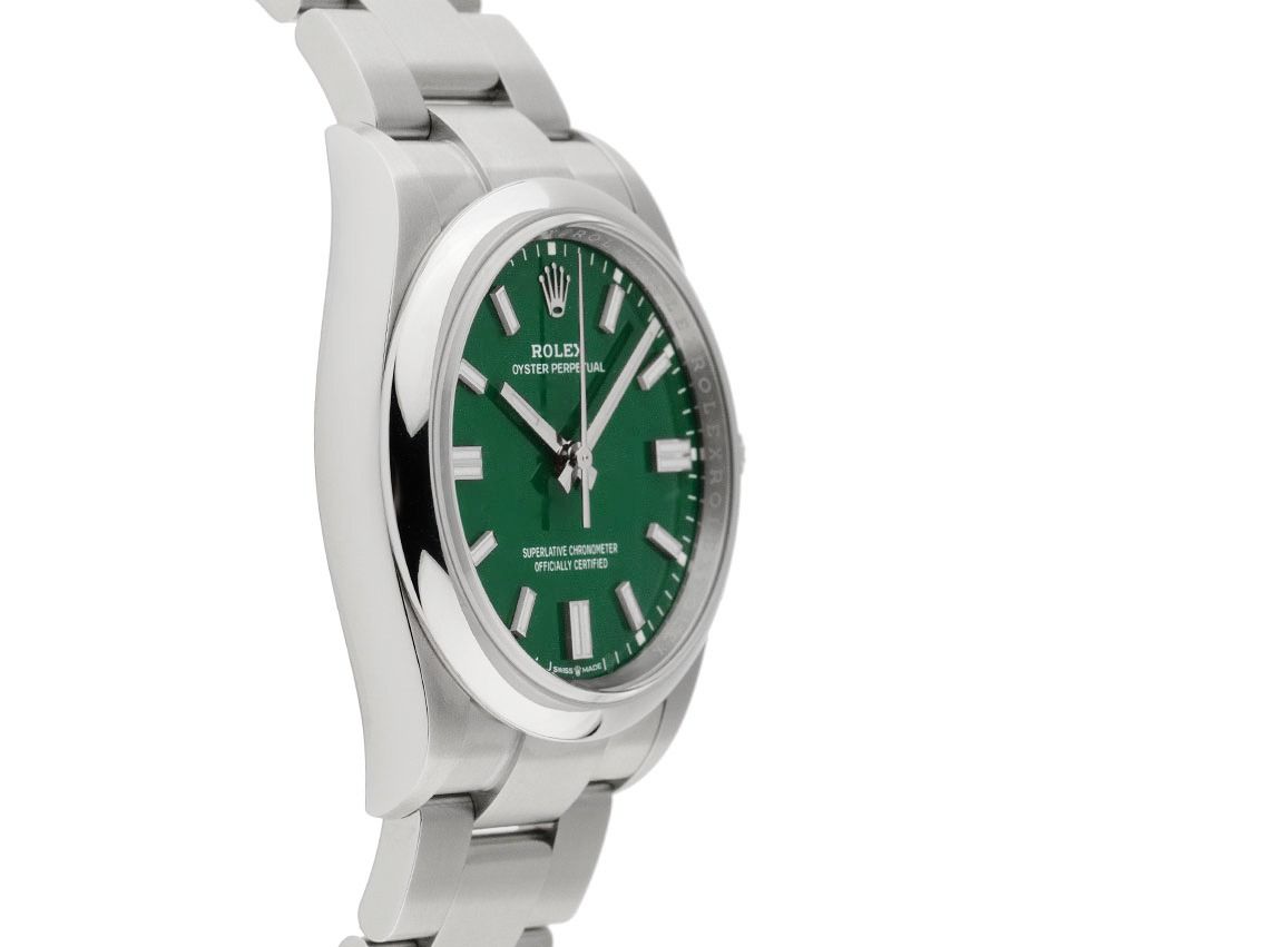 Rolex Oyster Perpetual Green Stahl Automatik Armband OysterGehäuse Edelstahl poliert und satiniert, Gehäusedurchmesser ohne Krone 36mm, Gehäusehöhe 12,0mm. Lünette Edelstahl glatt und poliert. Armband Oyster Edelstahl poliert und satiniert, Faltschließe Edelstahl mit Hersteller-Logo. Zifferblatt grün mit aufgesetzten weißgoldenen Leuchtindexen und weißgoldenen Leuchtzeigern. Uhrwerk Automatik, Chronometer mit Zeugnis, Rolex Manufakturkaliber 3230 mit 31 Edelsteinen, Gangreserve ca. 70 Stunden. Anzeige von Stunde, Minute und Sekunde über Zeiger aus der Mitte mit Sekundenstopp zur sekundengenauen Einstellung der Uhrzeit. Saphirglas kratzfest. Krone verschraubbar mit Hersteller-Logo. Boden Edelstahl verschraubt. Gewicht der Uhr inklusive Armband 124g, Länge des Armbandes inklusive Gehäuse 175mm. Wasserdicht bis 10 ATM. Referenznummer: 126000, ID: P2316148520126H-11800/6450, Artikelnummer: 10000084335. Original Rolex Box mit Umkarton und Garantie Papiere von August 2022, neue Rolex Garantie Karte ohne Ländercode sowie Beschreibung, Ledermäppchen, Rolex Chronometer-Siegel, Tag und Watchregister Auszug von Januar 2026, The Watch Register Zertifikat / ohne Eintrag (Internationale Datenbank für verlorene oder gestohlene Uhren), Full Set. Ungetragen. Lieferzeit sofort.