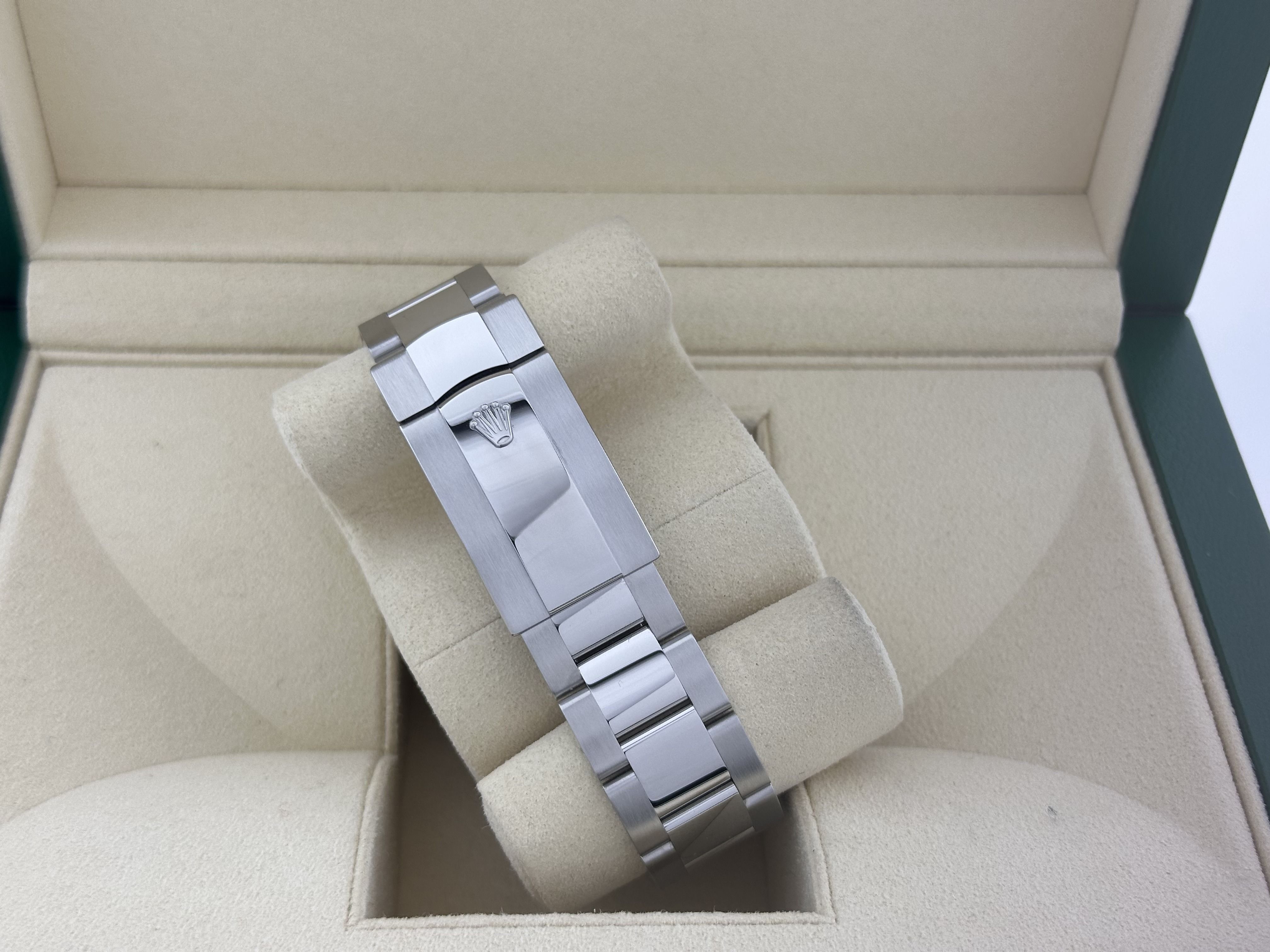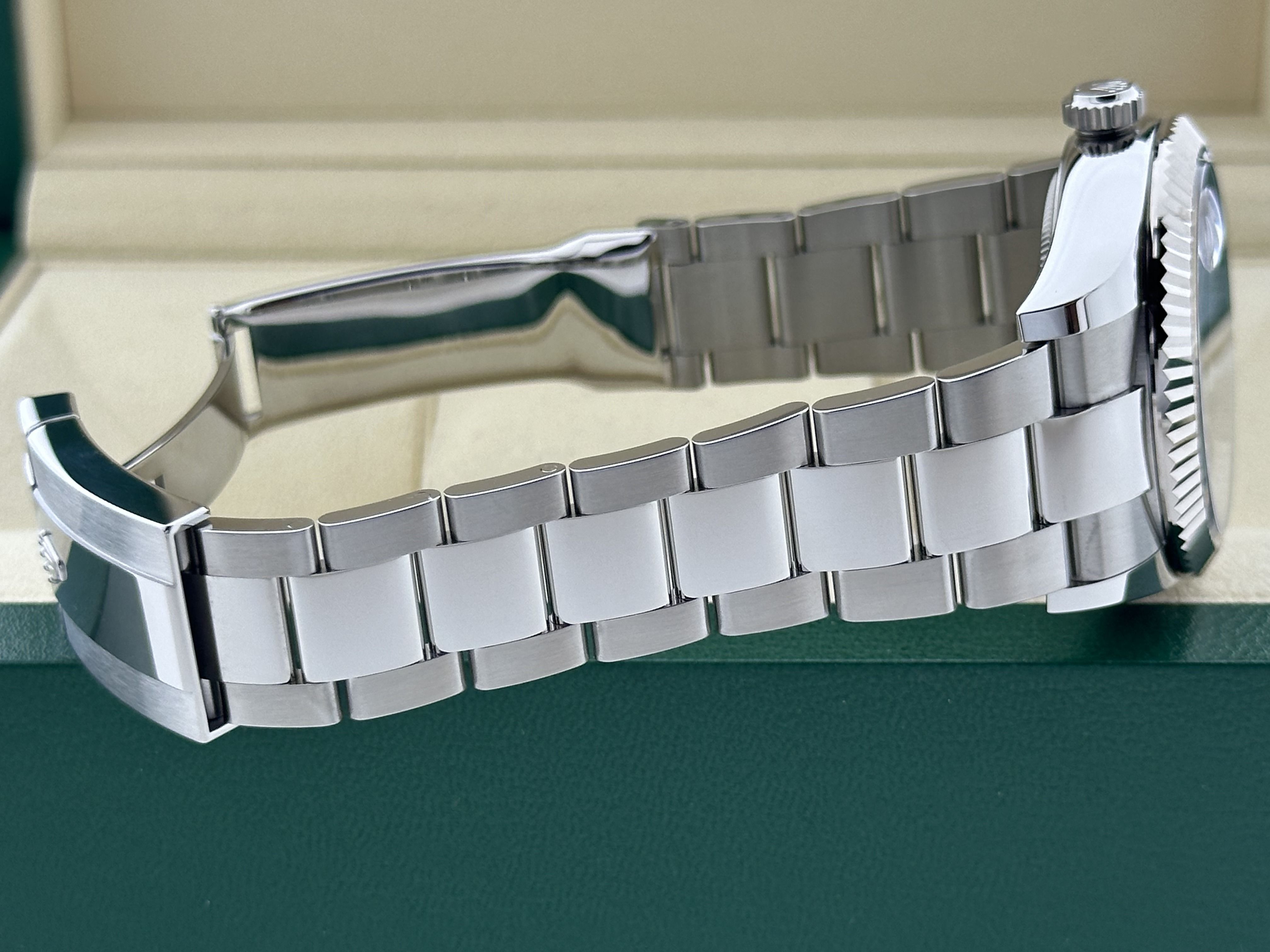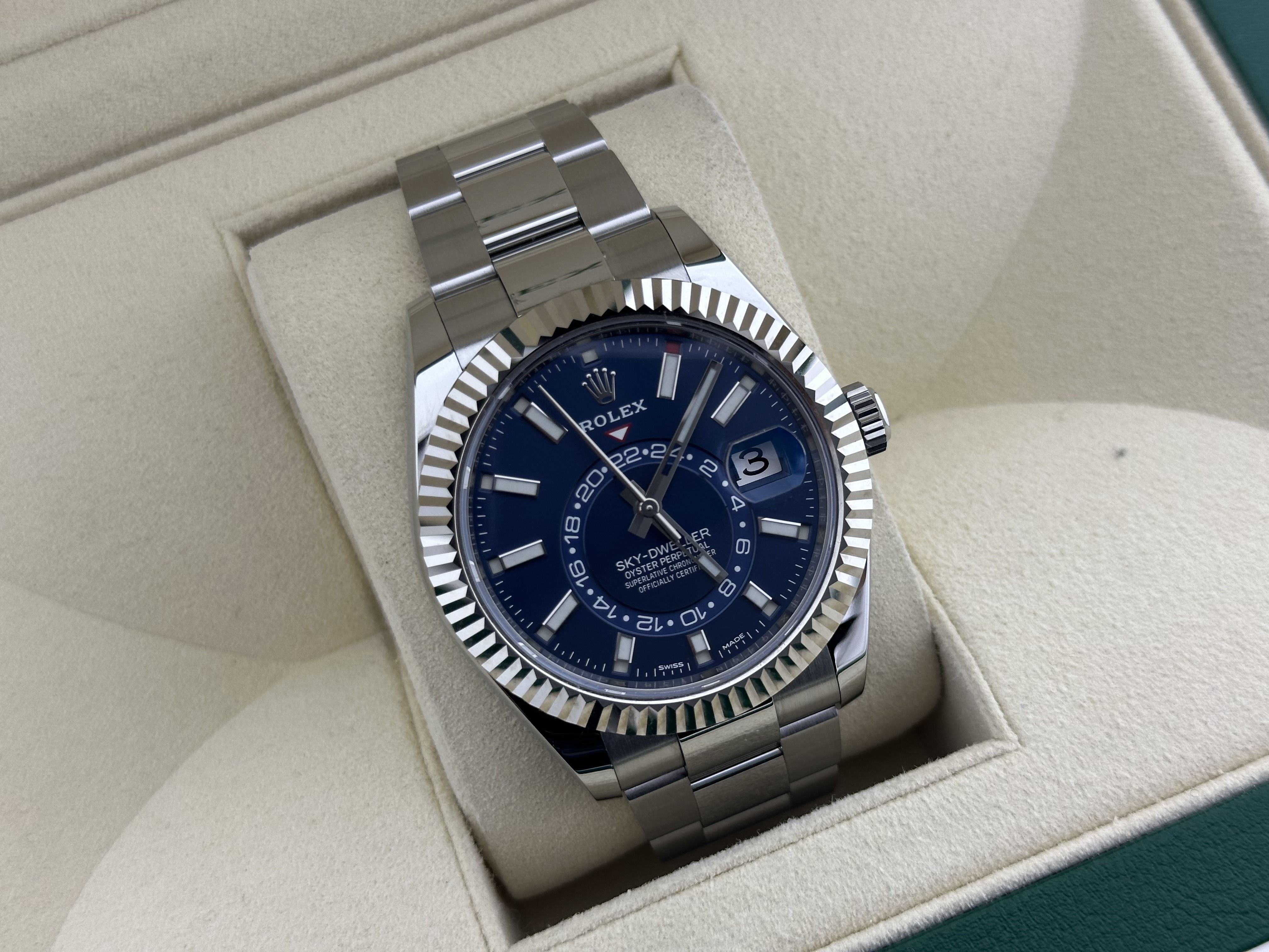 Un Rolex Sky-Dweller de acero, sin usar, ref. 326934, set completo, del 2020. El Rolex tiene una caja de acero de 42 mm con un brazalete Oyster de acero. La reloj tiene una esfera azul con un bisel de oro blanco de 18k. El Rolex tiene una ventana de fecha a las 3 en punto. El Rolex está en estado sin usar y viene con su caja original y certificado.