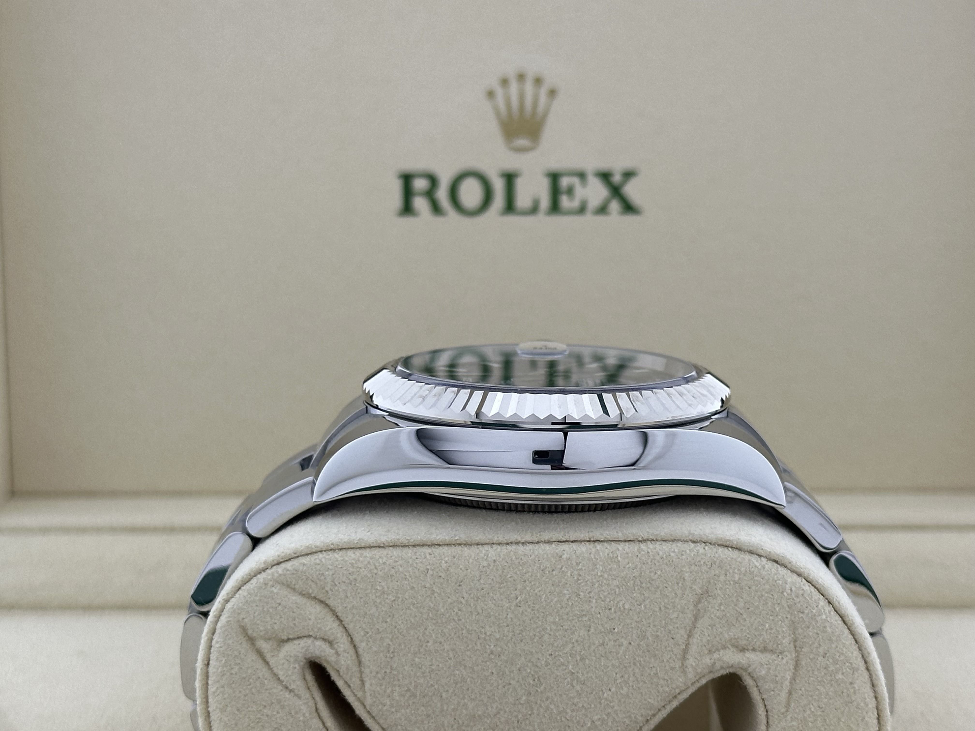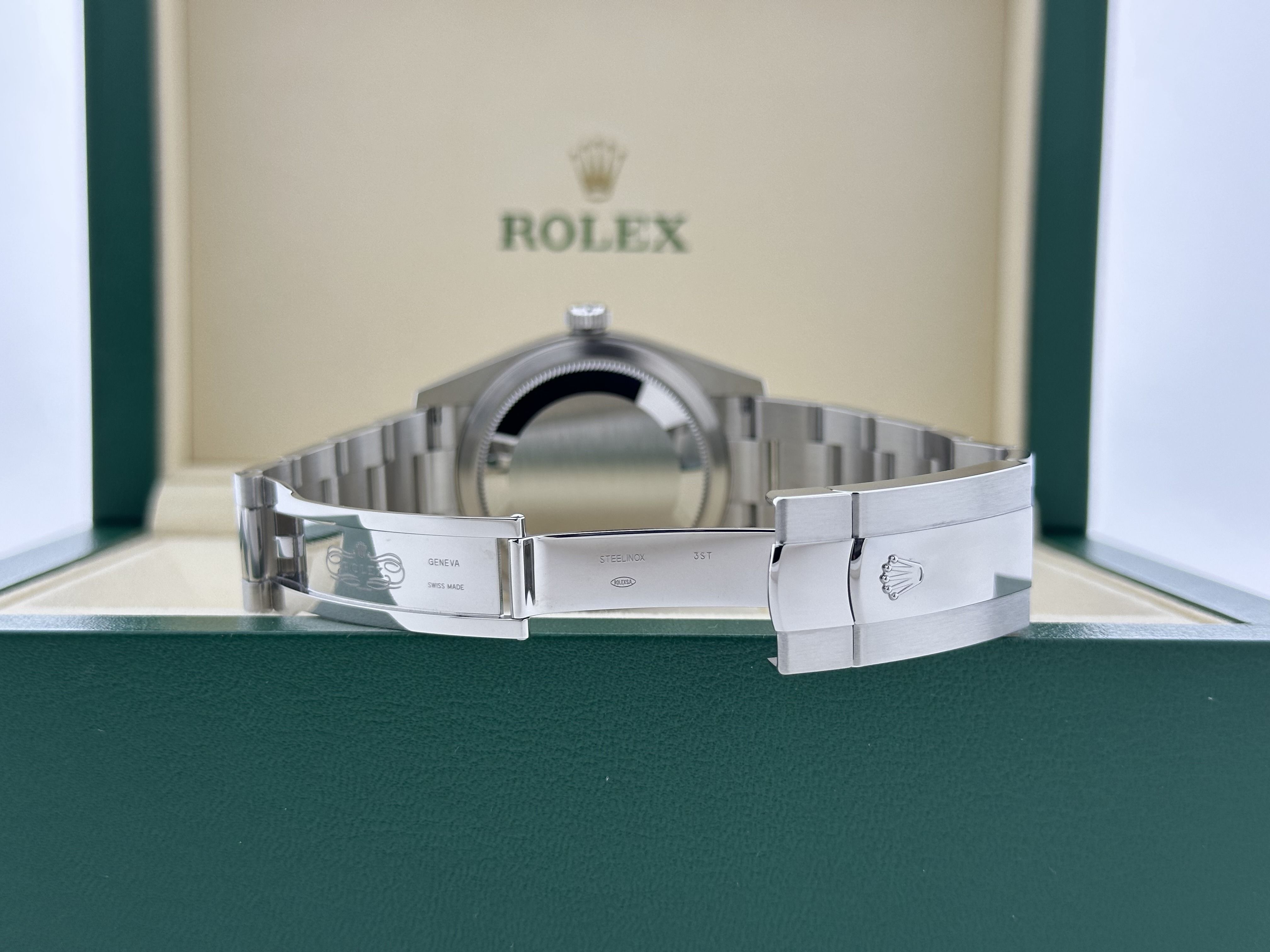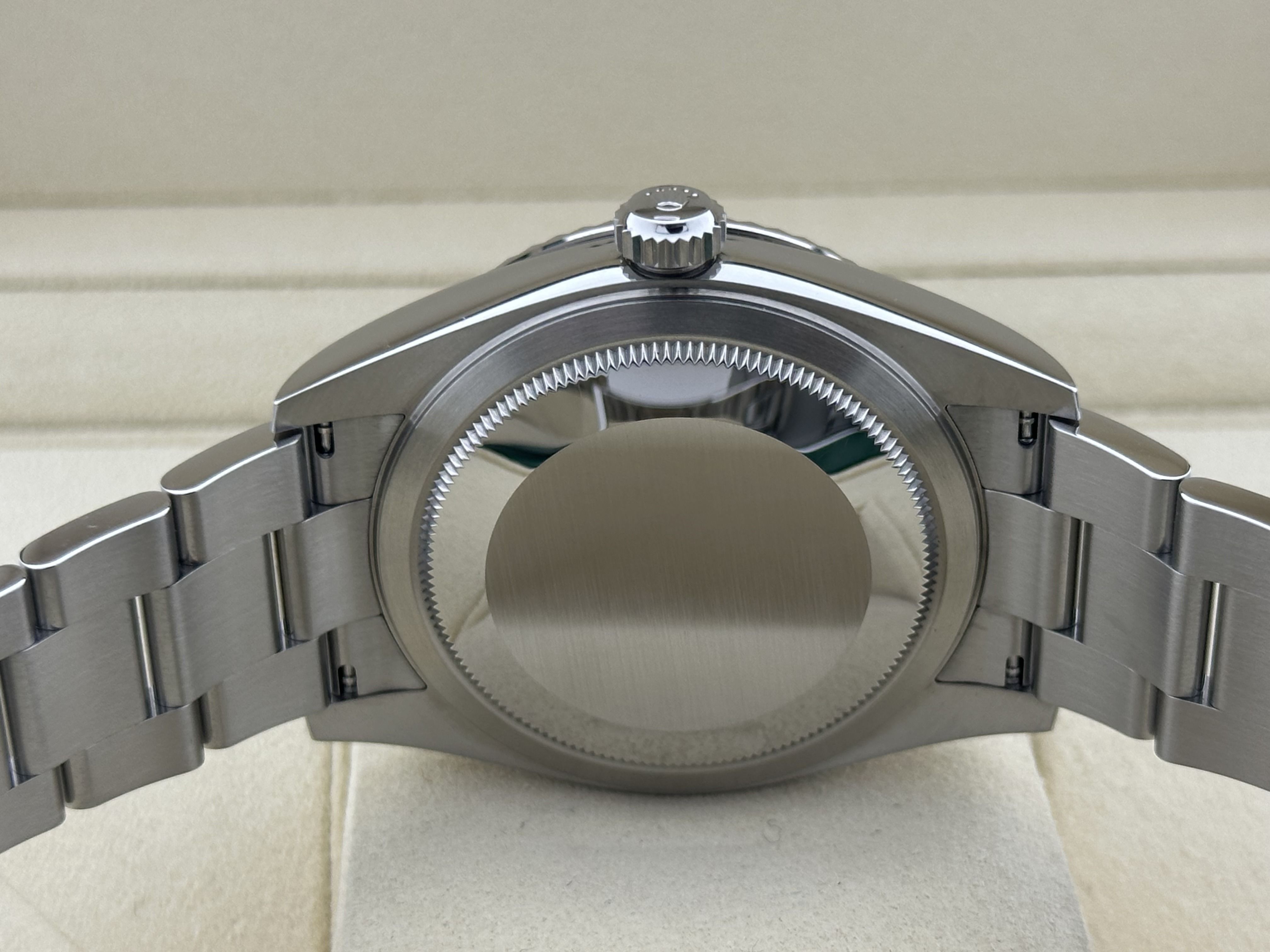 Un Rolex Sky-Dweller de acero, sin usar, ref. 326934, set completo, del 2020. El Rolex tiene una caja de acero de 42 mm con un brazalete Oyster de acero. La reloj tiene una esfera azul con un bisel de oro blanco de 18k. El Rolex tiene una ventana de fecha a las 3 en punto. El Rolex está en estado sin usar y viene con su caja original y certificado.