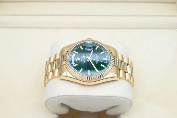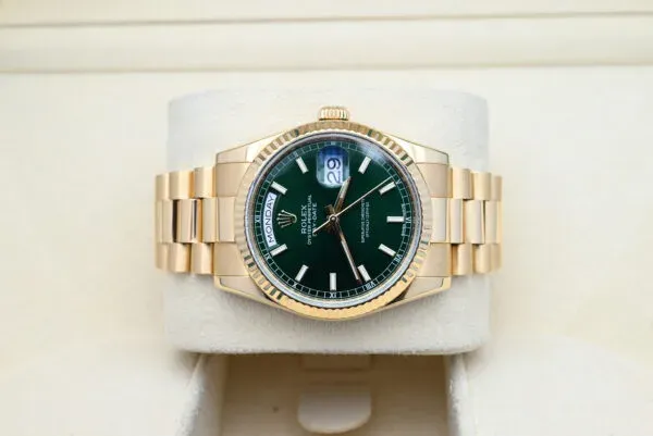 Rolex Day-Date Ref. 118238 de 2013 con la esfera verde en excelente estado, incluyendo la caja y los papeles originales. Todos nuestros relojes han sido revisados a fondo por nuestro propio relojero y se han servido cuando ha sido necesario.