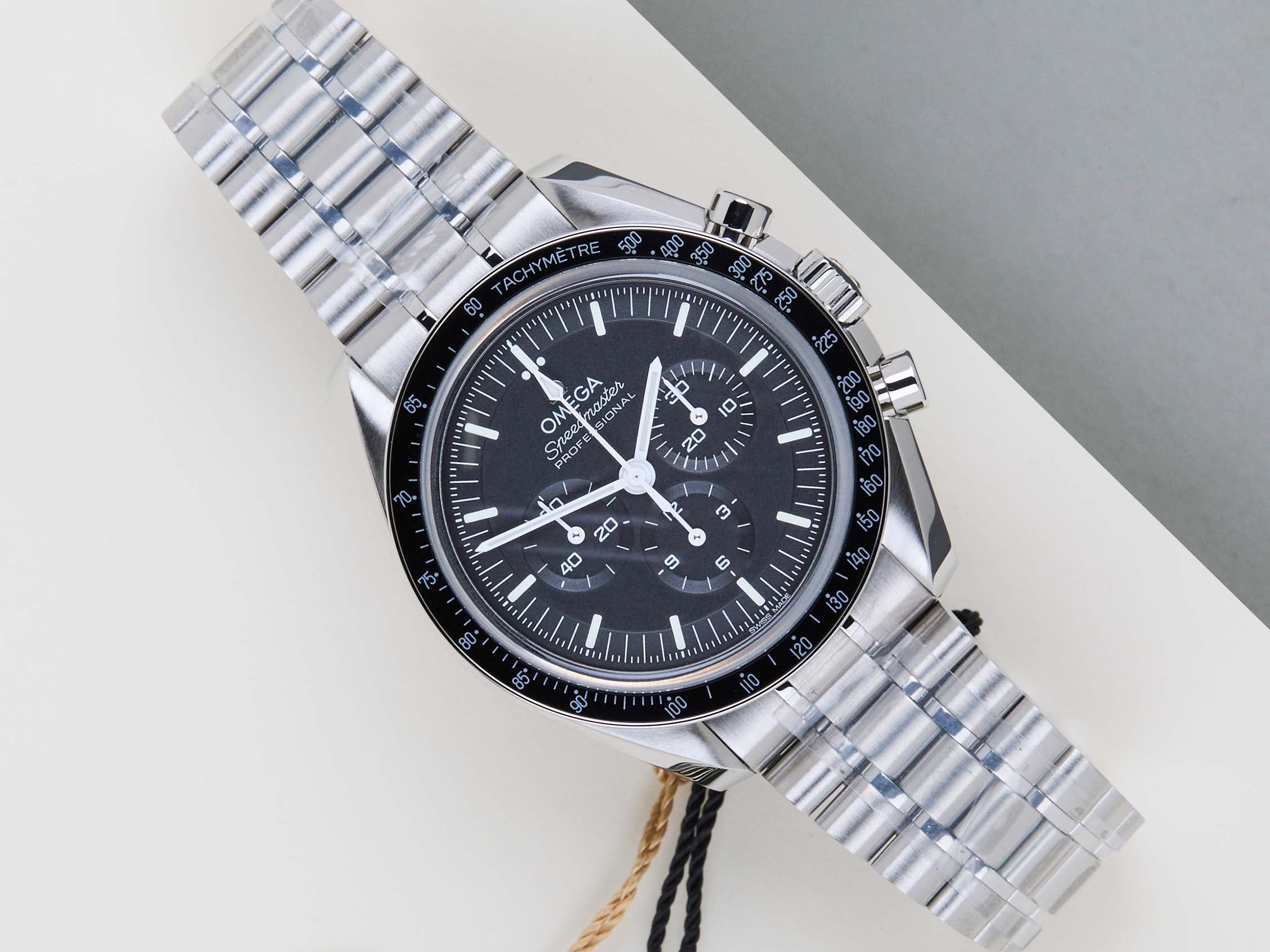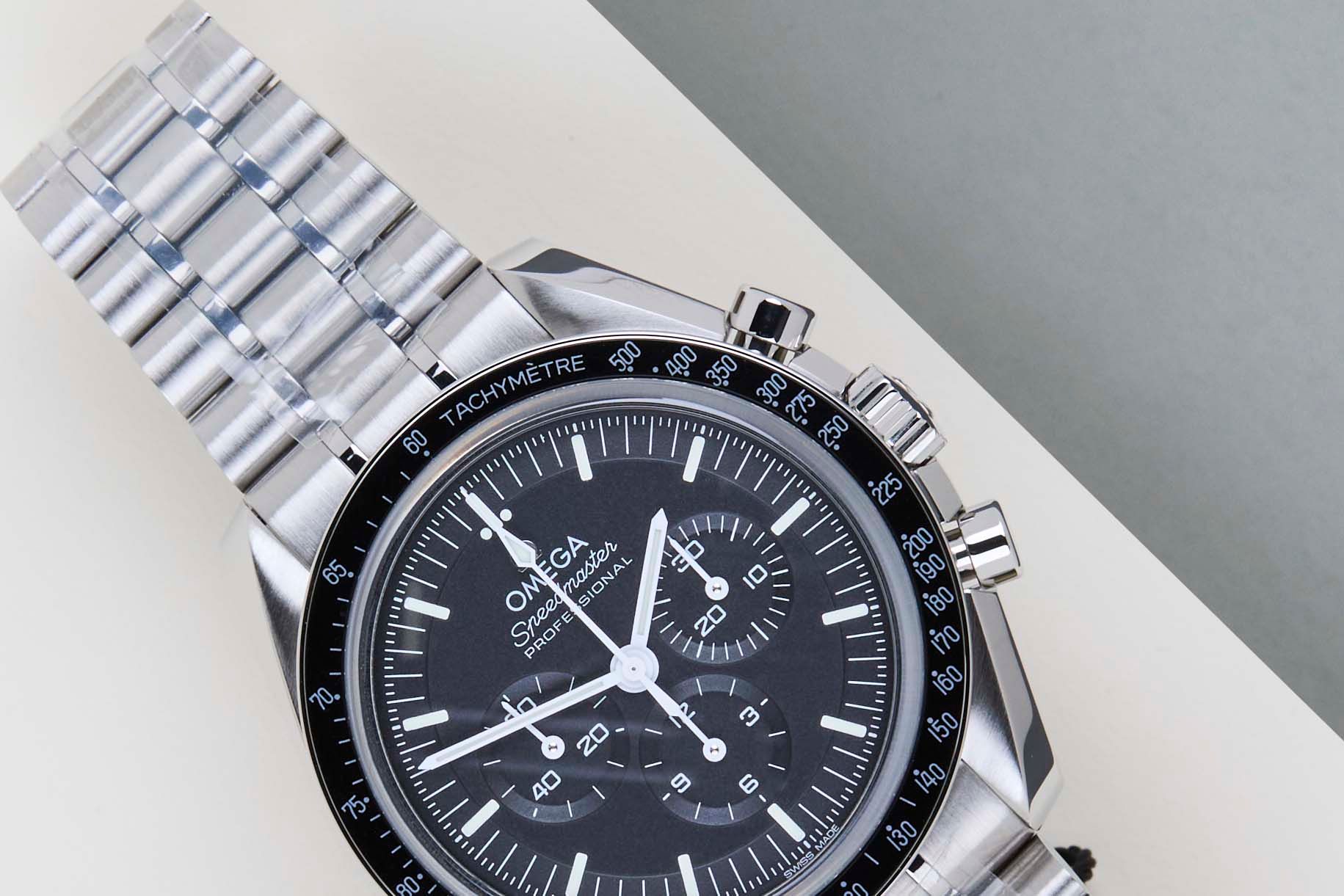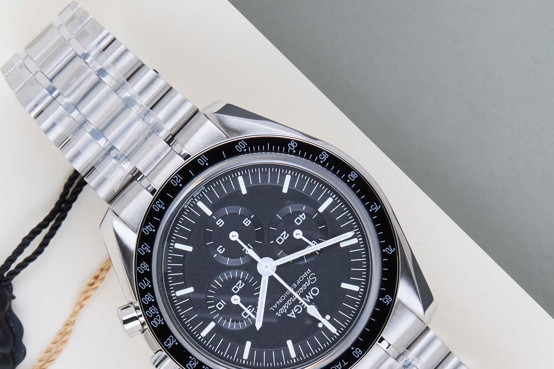 El Speedmaster Moonwatch Professional cuenta con una caja de acero inoxidable con un diámetro de 42 mm y un bisel taquimétrico negro. Su esfera de cronógrafo muestra tres subesferas para medir el tiempo transcurrido, incluyendo segundos, minutos y horas.