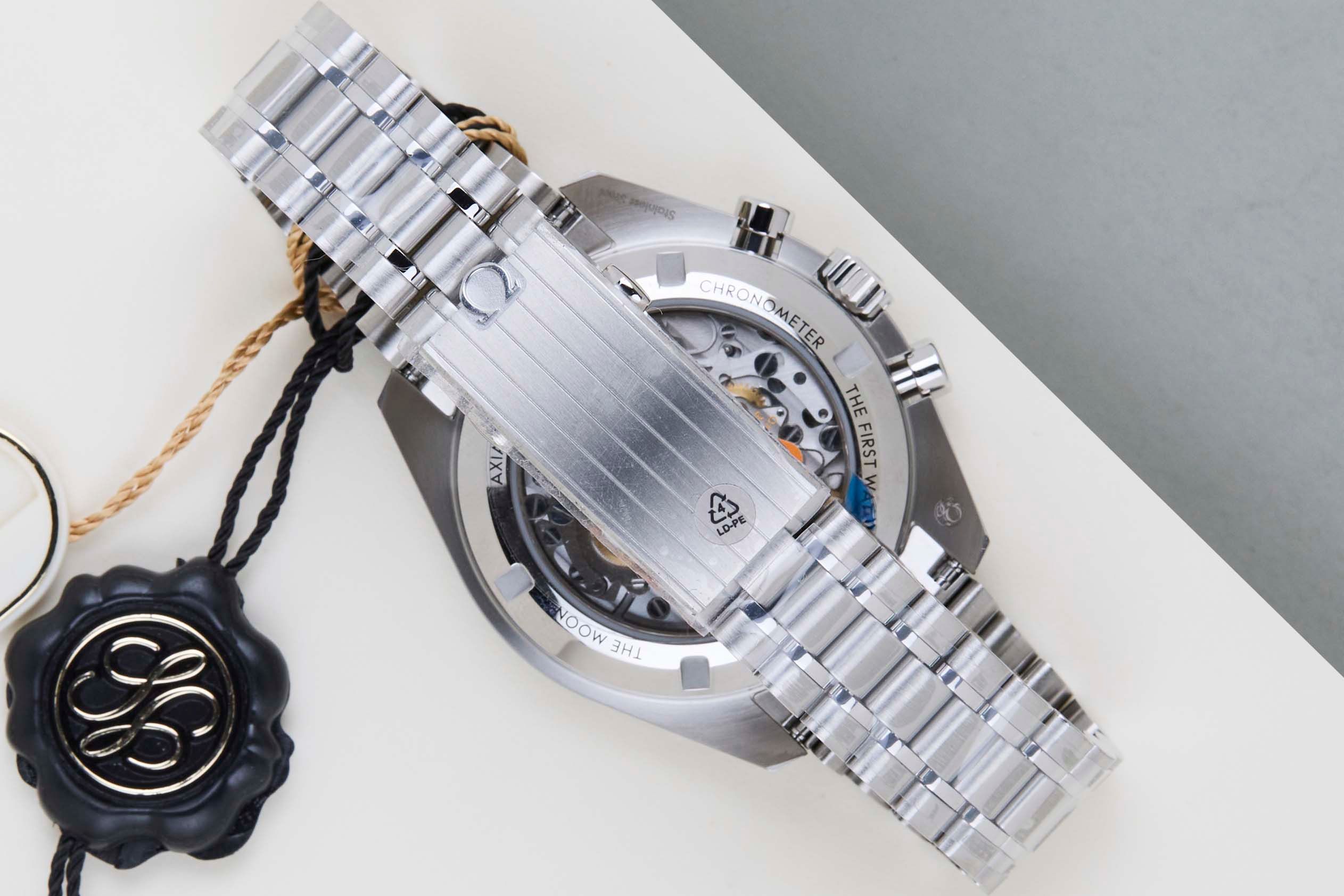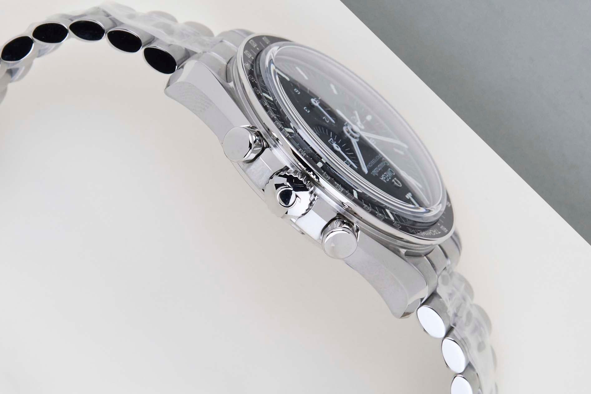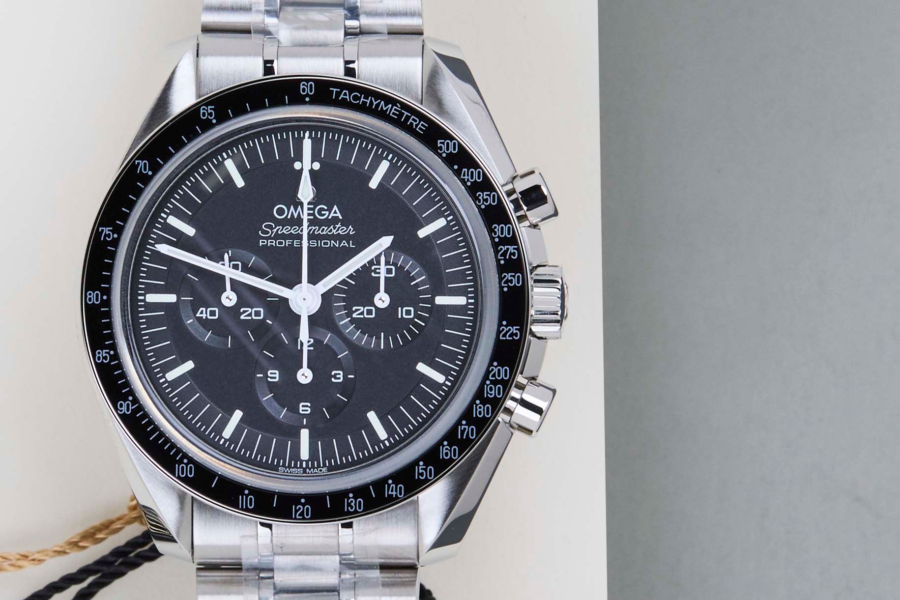 El Speedmaster Moonwatch Professional cuenta con una caja de acero inoxidable con un diámetro de 42 mm y un bisel taquimétrico negro. Su esfera de cronógrafo muestra tres subesferas para medir el tiempo transcurrido, incluyendo segundos, minutos y horas.
