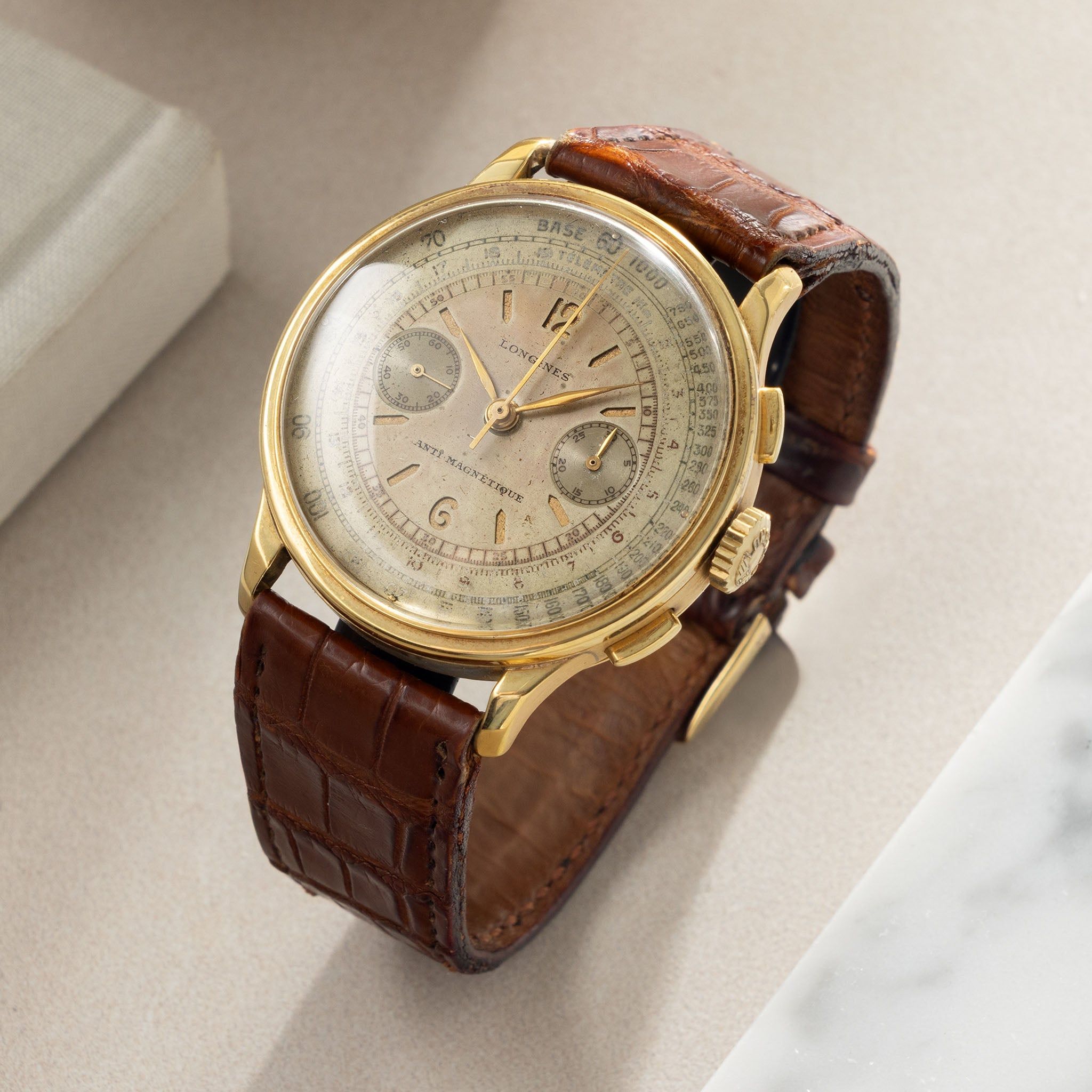 In the mid-1930s, Longines created the legendary 13ZN — a movement that would become one of the most celebrated chronograph calibers in watchmaking history. Widely considered by vintage connoisseurs to be one of the finest and most sophisticated in-house chronograph movements of its era, the 13ZN remains a benchmark of technical excellence and craftsmanship. This example is fitted with an exceptionally rare “sandwich” dial, featuring cut-out numerals that reveal a second layer beneath, giving the dial its distinctive depth. It was an unusual and innovative design for its time — and even today it stands out. Only very few brands, such as Panerai (then produced by Rolex), experimented with a similar layered effect during that period. The dial is further equipped with a Base 1000 outer scale, a telemeter inner scale, a beautifully scripted “antimagnétique” inscription on the lower half, and two sub-registers for the chronograph. All of this is housed in an 18k yellow gold snap-back case fitted with the squared pushers typical of the era. The watch comes on the photographed leather strap and features an exceptionally rare 18k yellow gold pin buckle — a true gem in its own right. Both the case and the movement carry matching numbers, exactly as they should on authentic examples of this reference. The iconic yellow-gilded 13ZN movement has been fully serviced by our watchmaker and is running beautifully. Specifications: Longines 13ZN Chronograph 37 mm 18k yellow gold case 5369xxx case serial & identical movement number, dating to the 1930’s cream dial with multi scales , no lumed , bi- compax sub dials lay out Sandwich cut -out Arabic numerals Triple signed (case, movement & dial) Longines hand-wound movement cal.13ZN Comes on the shown leather strap, with rare Longines 18 k yellow gold pin buckle Fully serviced by our watchmaker One-year mechanical warranty Free FedEx International Priority Shipping