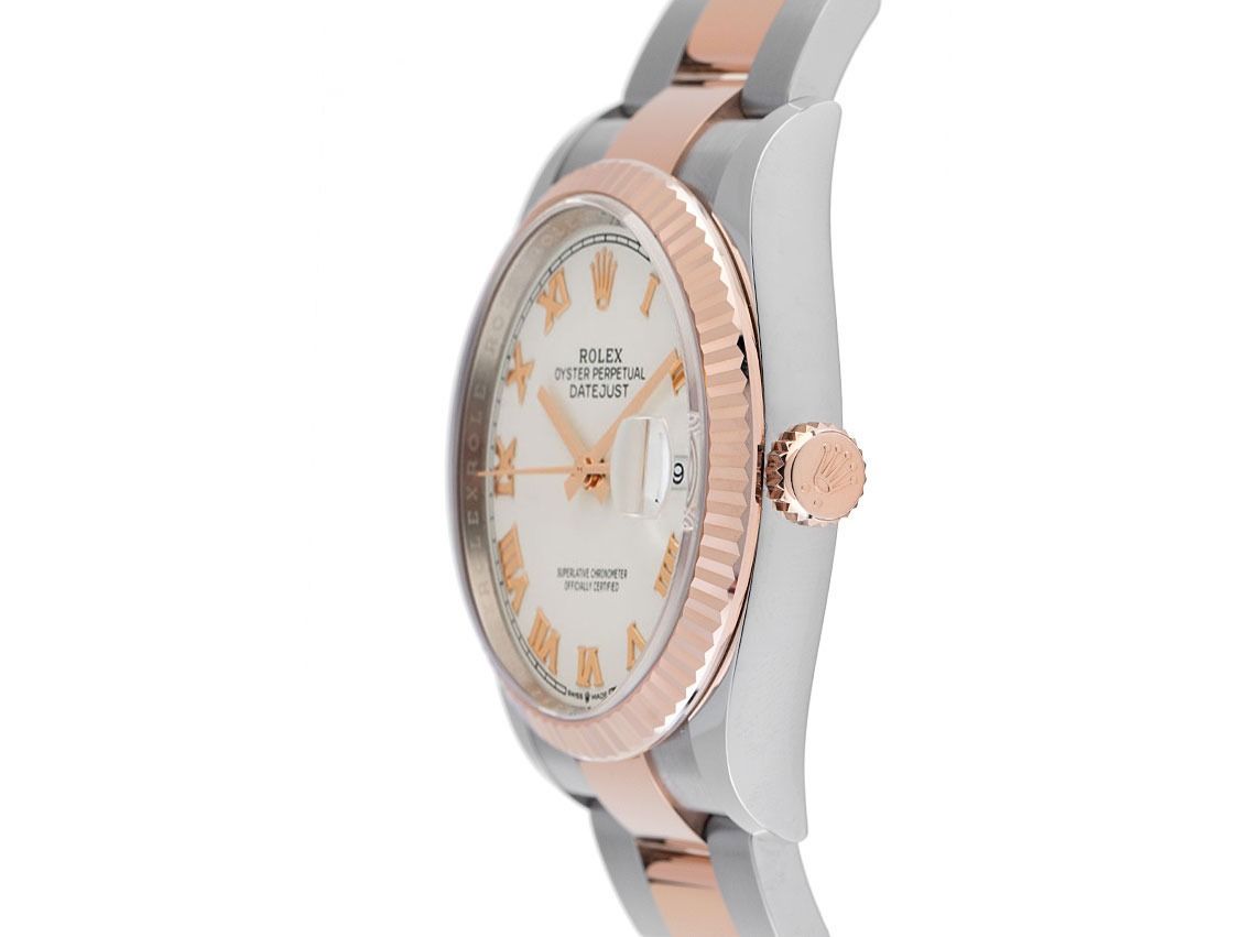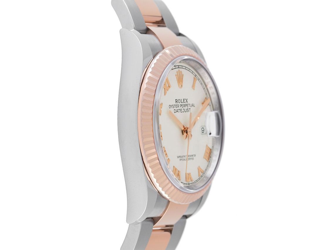 Rolex Datejust Stahl 18kt Roségold Everose Automatik Armband OysterGehäuse Edelstahl poliert und satiniert, Gehäusedurchmesser ohne Krone 36mm, Gehäusehöhe 11,6mm. Lünette 18kt Roségold Everose geriffelt und poliert. Armband Oyster Edelstahl / 18kt Roségold Everose poliert und satiniert, Faltschließe Edelstahl / 18kt Roségold Everose mit Hersteller-Logo. Zifferblatt weiß mit aufgesetzten roségoldenen römischen Ziffern und roségoldenen Zeigern. Uhrwerk Automatik, Chronometer mit Zeugnis, Rolex Manufakturkaliber 3235 mit 31 Edelsteinen, Gangreserve ca. 70 Stunden. Anzeige von Stunde, Minute und Sekunde über Zeiger aus der Mitte mit Sekundenstopp zur sekundengenauen Einstellung der Uhrzeit, Datumsanzeige mit Schnellverstellung unter Glaslupe bei 3 Uhr. Saphirglas kratzfest. Krone 18kt Roségold Everose verschraubbar mit Hersteller-Logo. Boden Edelstahl verschraubt. Gewicht der Uhr inklusive Armband 132g, Länge des Armbandes inklusive Gehäuse 165mm. Wasserdicht bis 10 ATM. Referenznummer: 126231, ID: P0491268000225H-18000/13850, Artikelnummer: 10000078584. Original Rolex Box mit Umkarton und Papiere von August 2024, neue Rolex Garantie Karte ohne Ländercode sowie Beschreibung, Ledermäppchen, Rolex Chronometer-Siegel, Tag und Watchregister Auszug von Februar 2025, The Watch Register Zertifikat / ohne Eintrag (Internationale Datenbank für verlorene oder gestohlene Uhren), Full Set. Ungetragen. Lieferzeit sofort.