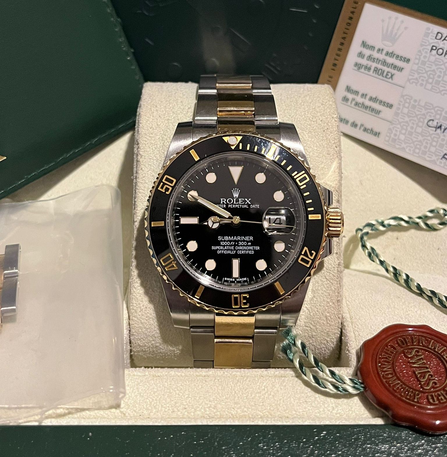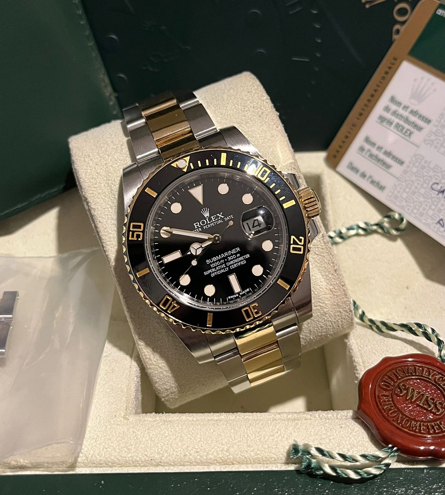 This stunning Rolex Submariner Date ref. 116613LN is presented in the iconic two-tone configuration with a black dial and matching black ceramic bezel—one of the most recognizable and sought-after designs within the Submariner collection. The combination of stainless steel and 18k yellow gold, paired with the bold black dial, unidirectional Cerachrom bezel, and the robust Oyster bracelet, results in a perfectly balanced sports watch that embodies Rolex’s timeless tool-watch heritage with a luxurious edge.