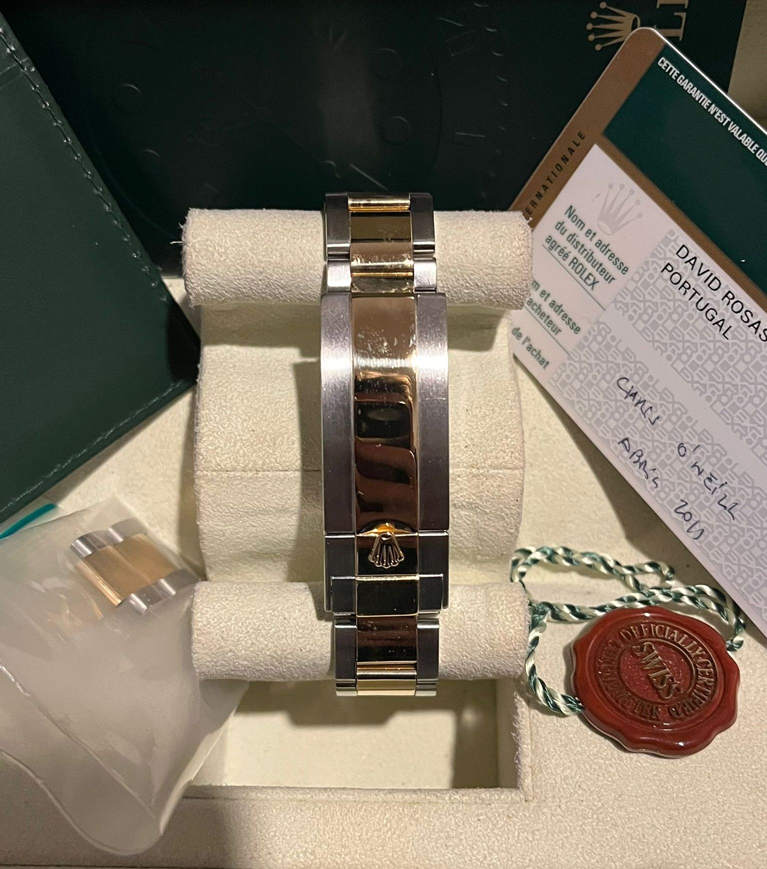 The watch comes as a full set, including the original Rolex box, warranty papers, booklets, and all original full links. An excellent opportunity to acquire a classic two-tone Submariner Date in a complete and well-preserved set.