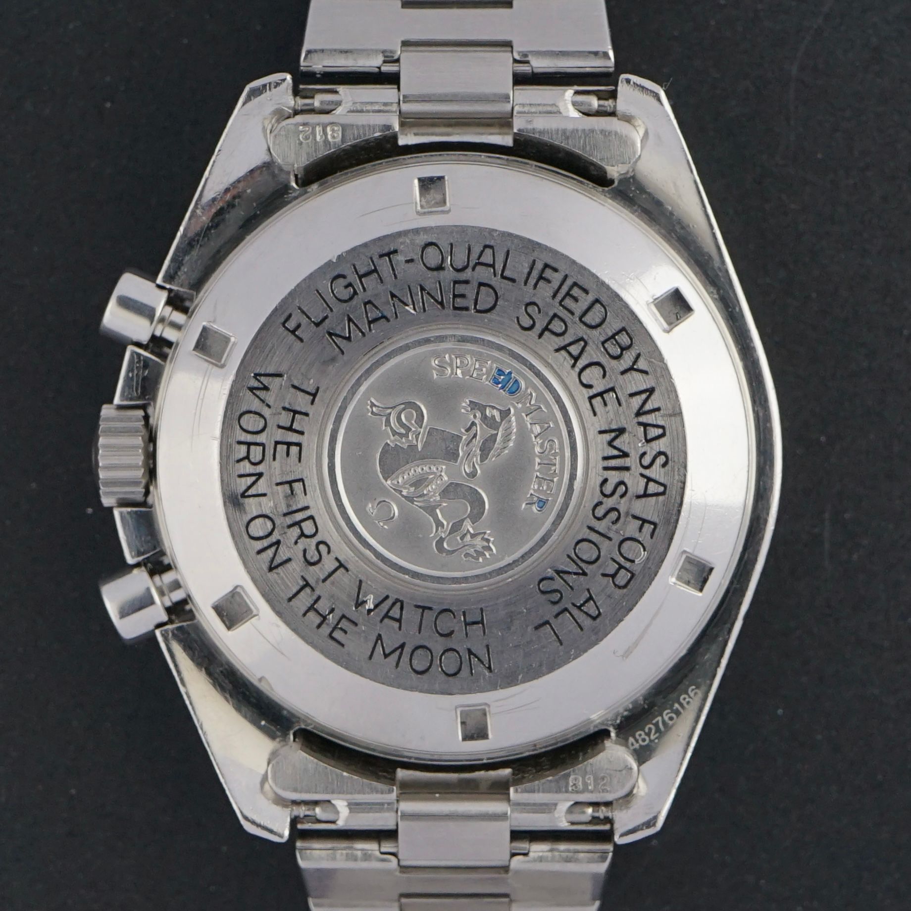 Strap: The original Omega Speedmaster bracelet. (Ref. 1479 with nr. 812 endlinks) (Fits a 15 to 19cm wrist)