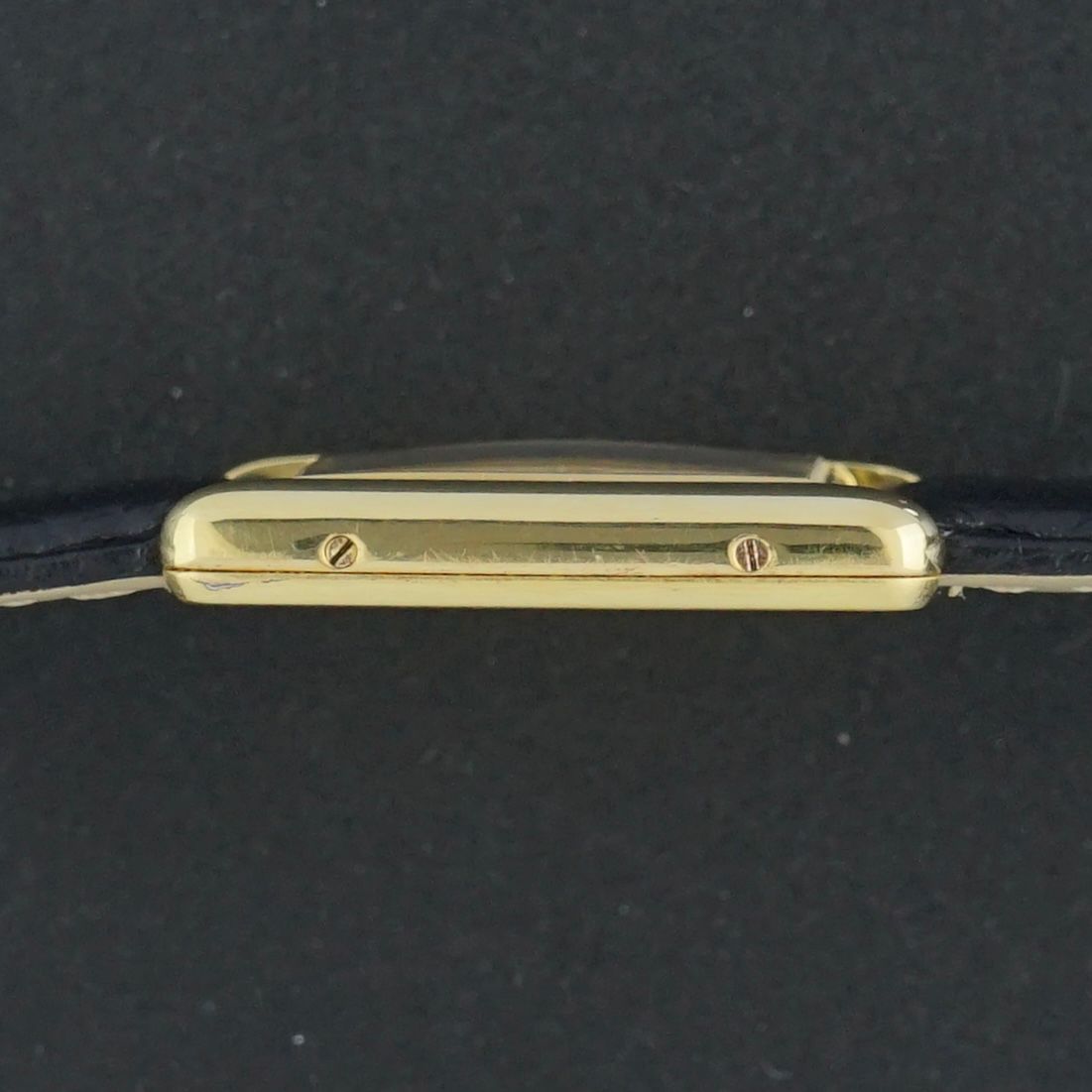 This vintage Cartier Tank Vermeil Must was produced in the 1990s and is the men’s size variant, also known as LM. The case measures 23.5 millimeters in width excluding the crown and 31 millimeters lug to lug. What truly sets this watch apart is its outstanding condition. The case fully retains its original gold plating, featuring a high polished finish on the front and a vertically brushed finish on the back. The dial is in perfect condition and comes in a champagne tone, with Roman numeral hour markers at the 12, 3, 6, and 9 o’clock positions, complemented by a railroad minute track. The signature Cartier blue hands and the blue ruby cabochon crown complete the design. The watch is paired with a brand new black leather strap with a gold plated folding clasp. Overall, this piece is in excellent condition and would make a magnificent dress watch.Year of production: 1990s