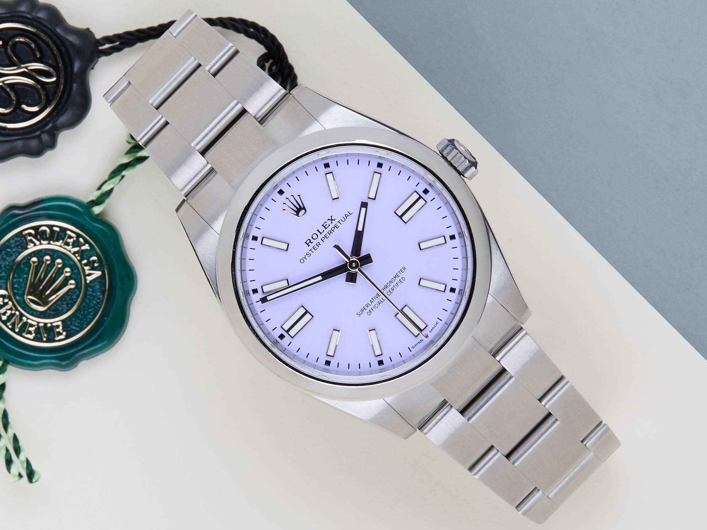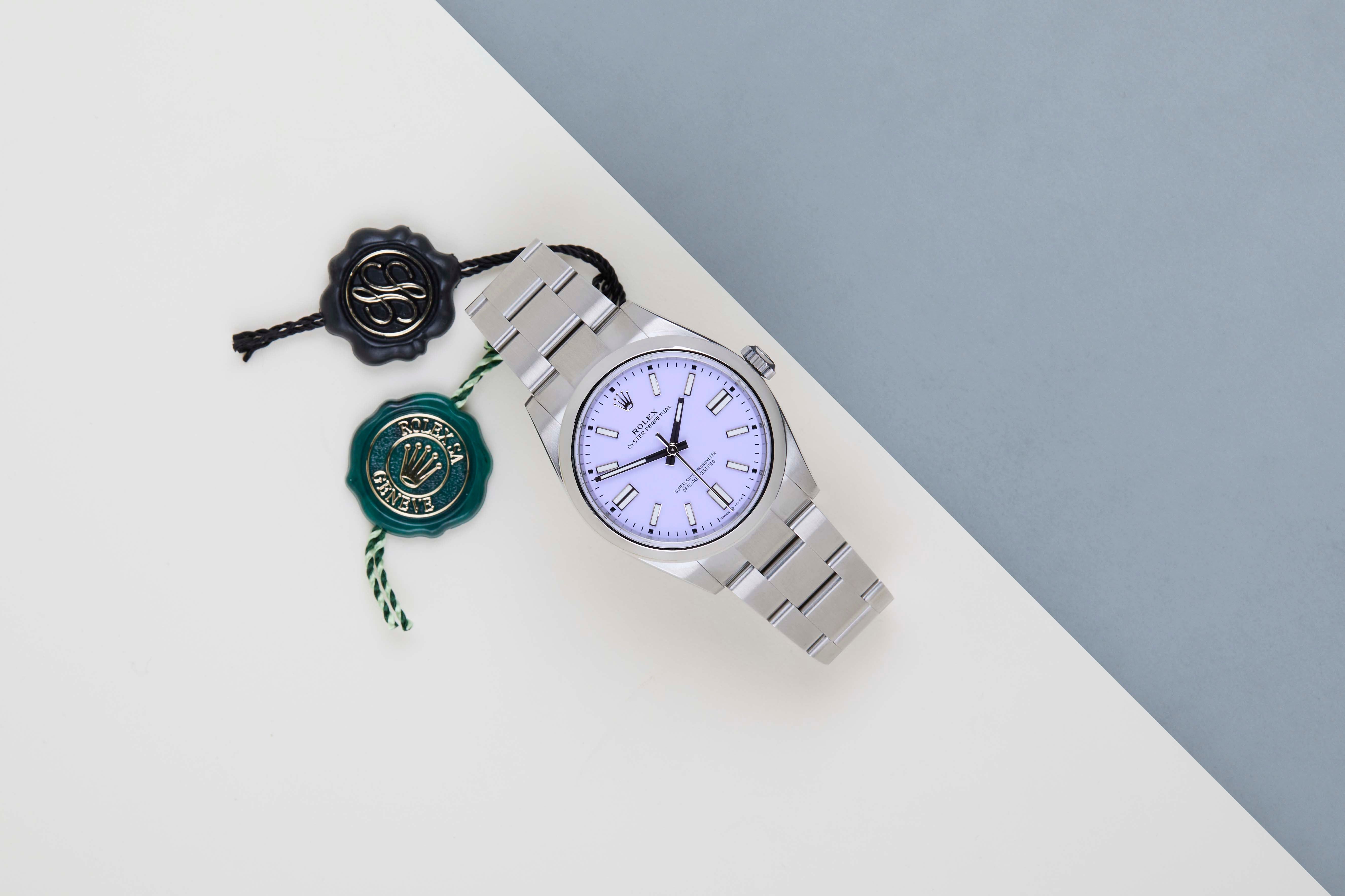 New & Unworn | Full Set | Partly Stickered | International Rolex Warranty Until January 2031The Rolex Oyster Perpetual was first introduced by Rolex in the 1930s. It is characterized by its water-resistant Oyster case and self-winding Perpetual movement. The Rolex Oyster Perpetual is a simple yet elegant timepiece that is suitable for both casual and formal wear.This Rolex Oyster Perpetual 'Lavender Dial' was sold for the first time in January 2026.The watch is fully made out of stainless steel. Rolex uses 904L in its steel watches, which is an extremely resistant and highly polishable superalloy.The Rolex reference 124300 and 134300 differ mainly in movement and case design, with the 134300 featuring the newer 3230 movement and a subtly updated case shape, and a bigger crown.This Rolex Oyster Perpetual 41 is in New & Unworn condition and comes with the original Rolex Warranty Card and box. Furthermore, the watch still has International Rolex Warranty until January 2031.