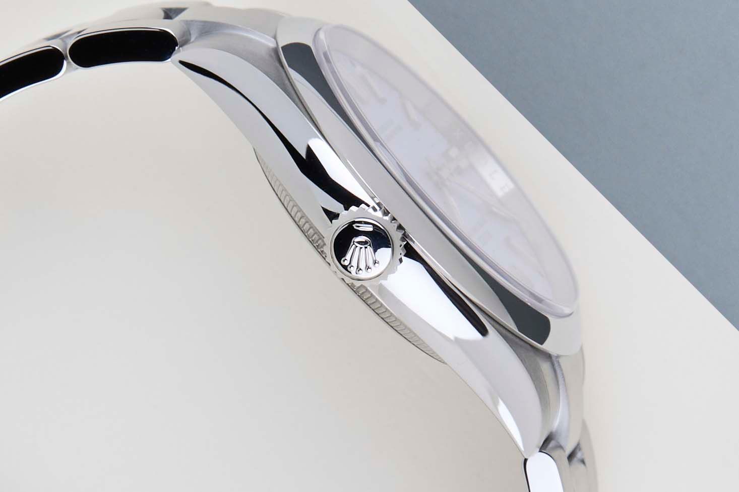 El reloj está completamente hecho de acero inoxidable. Rolex utiliza 904L en sus relojes de acero, que es una superaleación extremadamente resistente y altamente pulible.