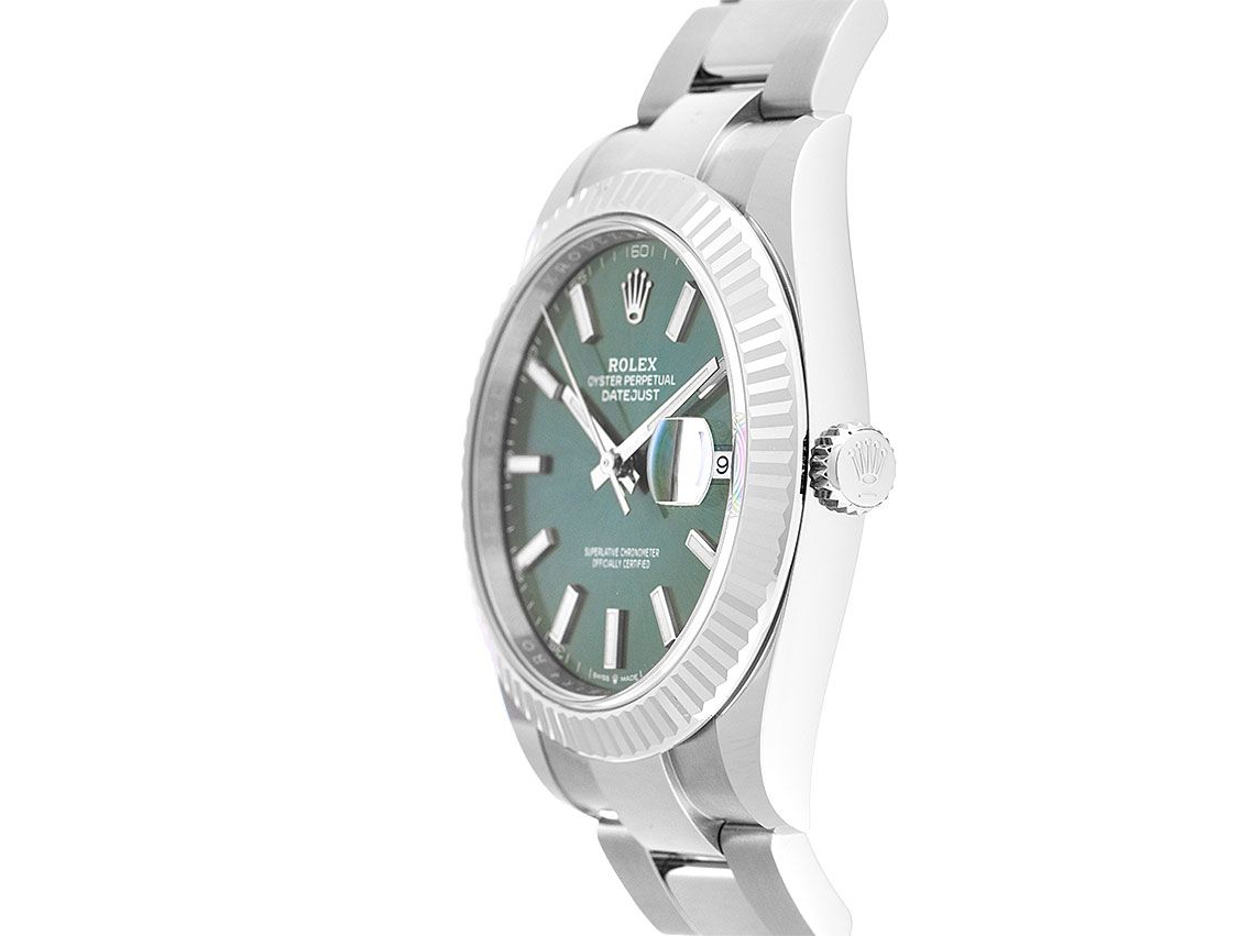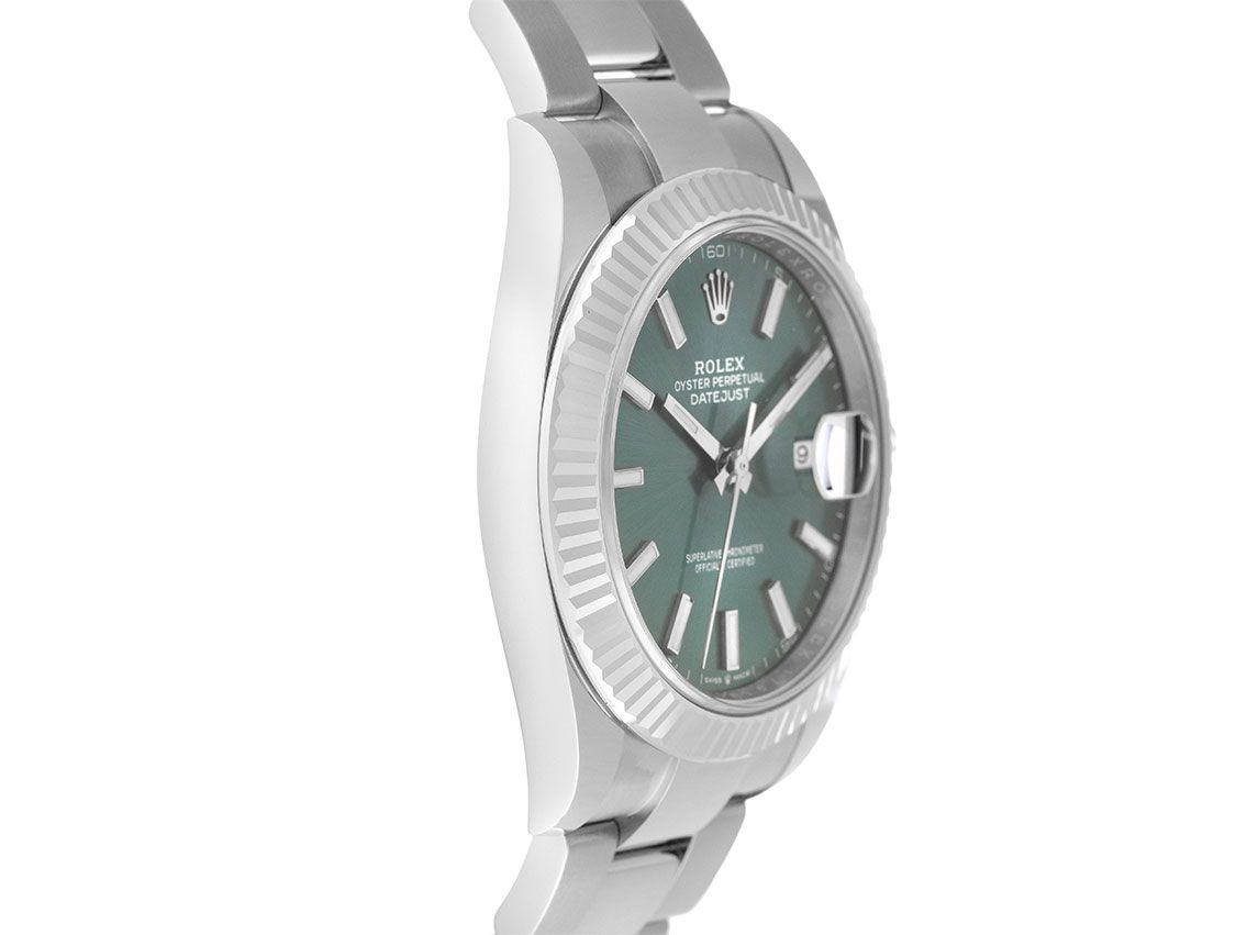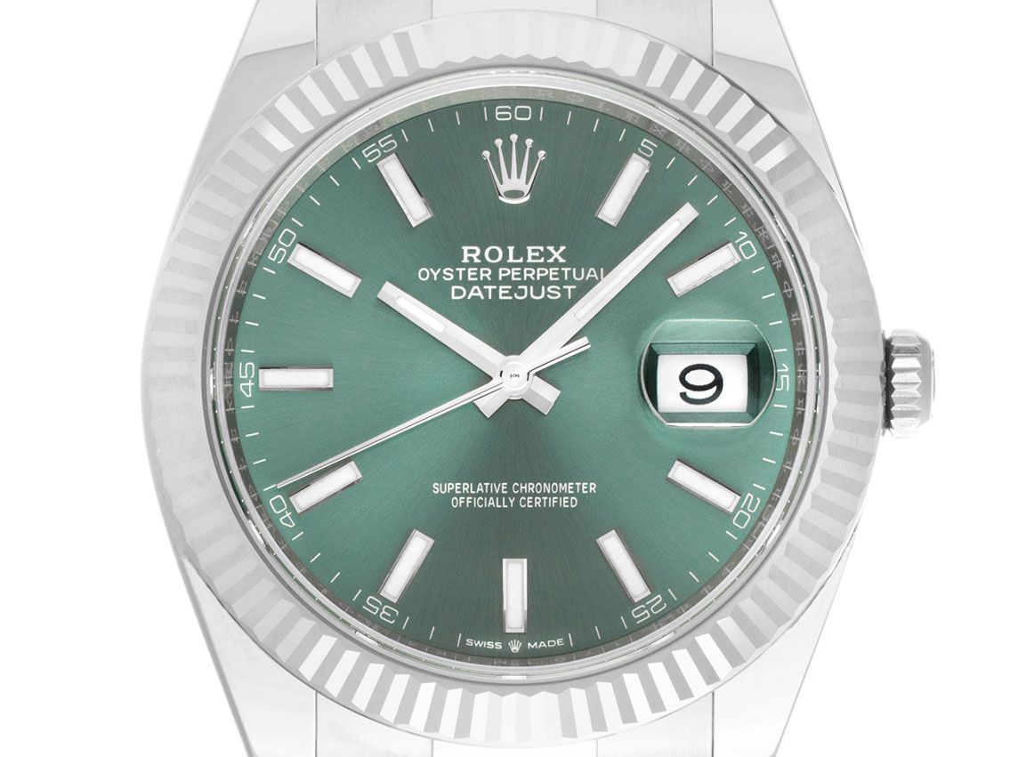 Rolex Datejust Stahl 18kt Weißgold Automatik Armband OysterGehäuse Edelstahl poliert und satiniert, Gehäusedurchmesser ohne Krone 41mm, Gehäusehöhe 11,7mm. Lünette 18kt Weißgold geriffelt und poliert. Armband Oyster Edelstahl poliert und satiniert, Rolex Faltschließe Edelstahl mit Hersteller-Logo. Zifferblatt mintgrün mit aufgesetzten in Weißgold gefassten Leuchtindexen und weißgoldenen Zeigern. Uhrwerk Automatik, Chronometer mit Zeugnis, Rolex Manufakturkaliber 3235 mit 31 Edelsteinen, Gangreserve ca. 70 Stunden. Anzeige von Stunde, Minute und Sekunde über Zeiger aus der Mitte mit Sekundenstopp zur sekundengenauen Einstellung der Uhrzeit, Datumsanzeige mit Schnellverstellung unter Glaslupe bei 3 Uhr. Saphirglas kratzfest. Krone verschraubbar mit Hersteller-Logo. Boden Edelstahl verschraubt. Gewicht der Uhr inklusive Armband 142g, Länge des Armbandes inklusive Gehäuse 180mm. Wasserdicht bis 10 ATM. Referenznummer: 126334, ID: P2434266980126H-17400/11250, Artikelnummer: 10000084589. Original Rolex Box und Garantie Papiere von Dezember 2025, neue Rolex Garantie Karte ohne Ländercode sowie Beschreibung, Ledermäppchen, Rolex Chronometer-Siegel und Watchregister Auszug von Januar 2026, The Watch Register Zertifikat / ohne Eintrag (Internationale Datenbank für verlorene oder gestohlene Uhren), Full Set. Kapitalanlage mit Wertsteigerungspotential. Ungetragen. Lieferzeit sofort.
