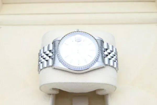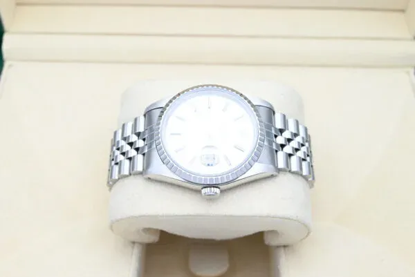 Rolex Datejust Ref. 16220 de 1989 con la esfera plateada en excelente estado, incluyendo la caja y los papeles originales. Todos nuestros relojes han sido revisados a fondo por nuestro propio relojero y se han servido cuando ha sido necesario.
