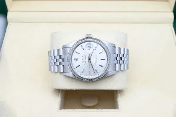 Rolex Datejust Ref. 16220 from 1989 with the silver dial in excellent condition including the original box and papers.All of our watches have been thoroughly checked by our own watchmaker and serviced when needed.